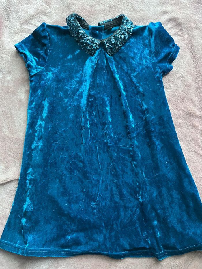 Bonjour vend jolie robe bleue brillante en velours ( très douce au toucher) . Portée 1 soirée. Très bon état. Taille 4 ans