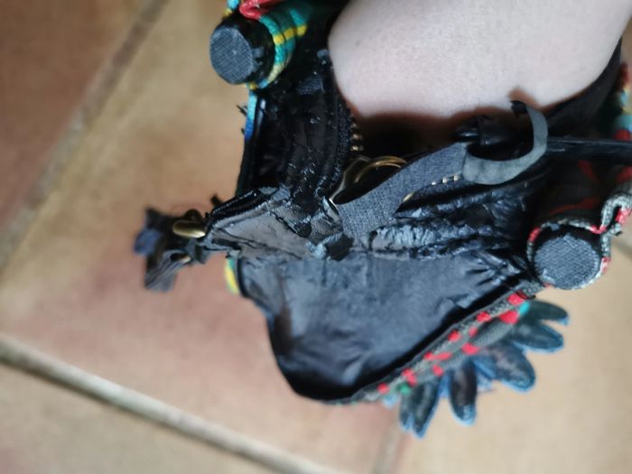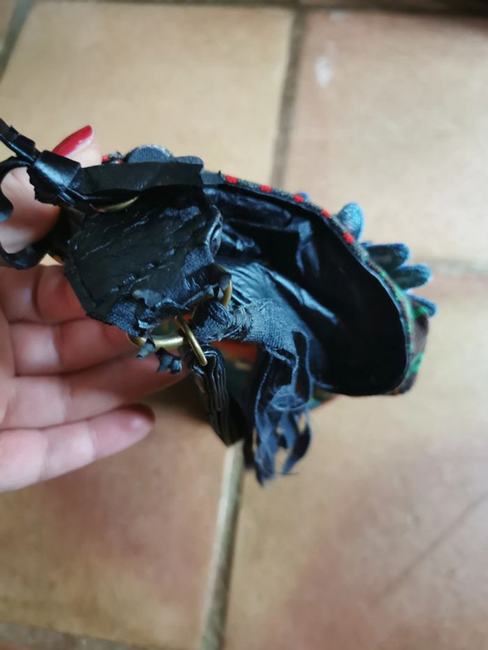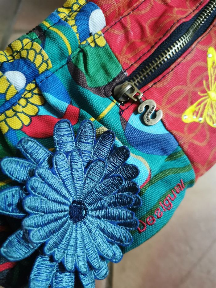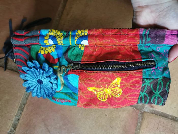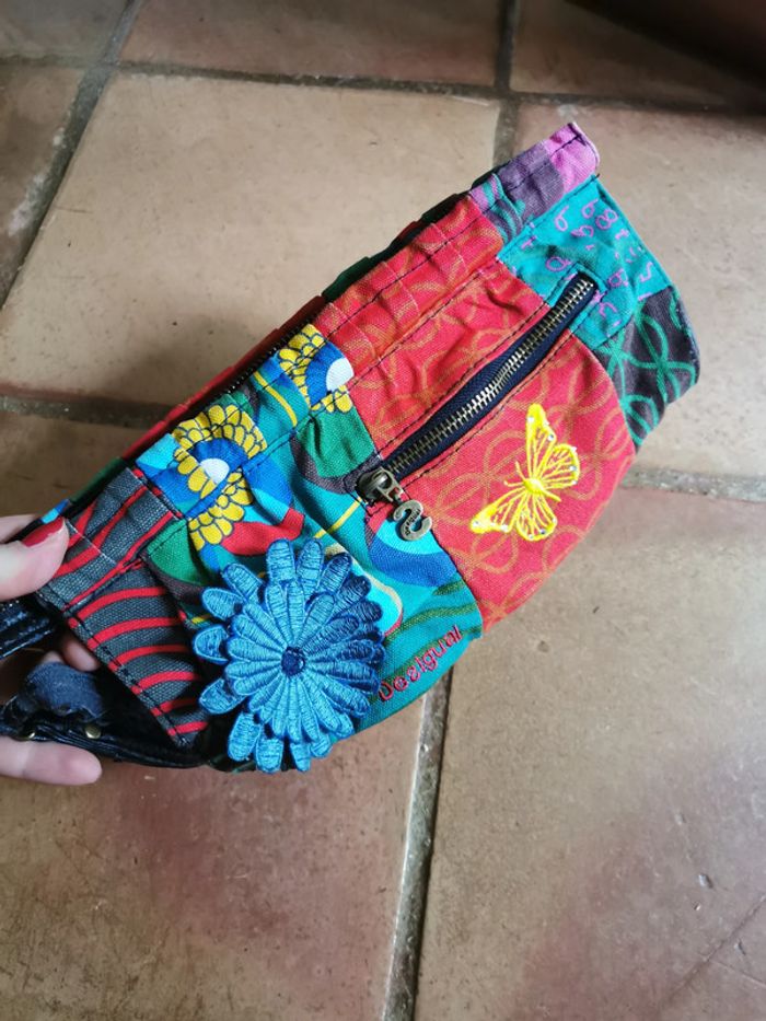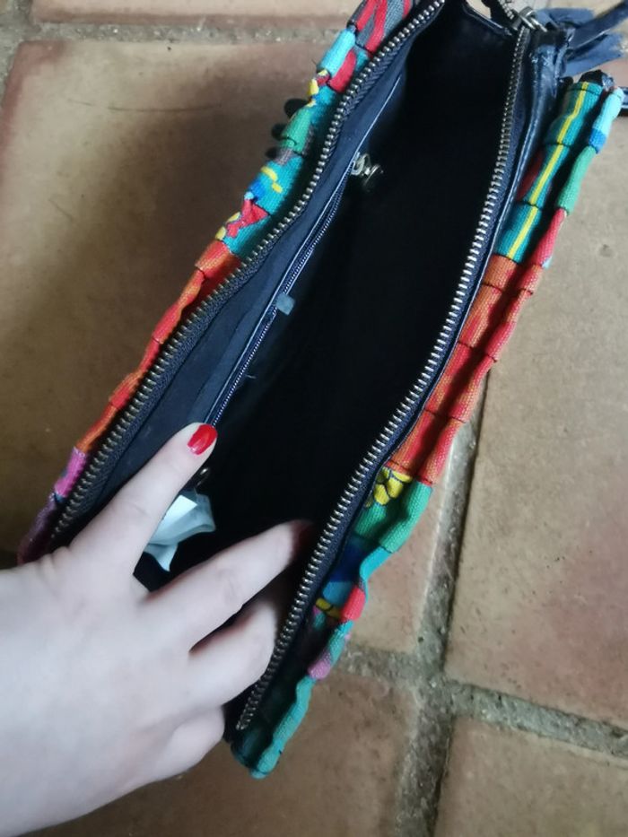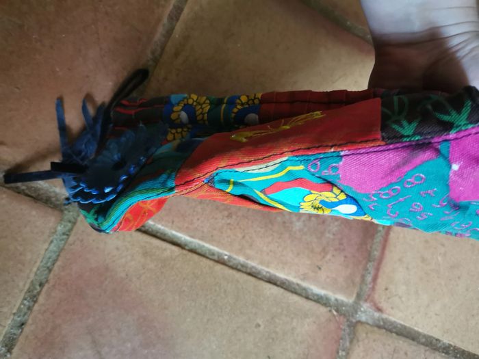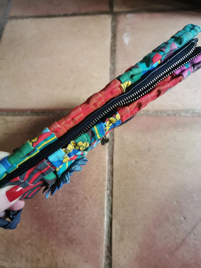 Pochette colorée en tissu D, état satisfaisant car les côtés partent en lambeau, mais en dessous on retrouve le tissu donc il est possible de gratter cette partie-là. Composition : 80% coton, 15% bois, 5% polyuréthanne. Dimensions : Longueur : 28 cm Largeur : 15 cm Epaisseur : 5 cm Poids : 230g. #pochette #pochettetissu #sactissu #pochettecoloree