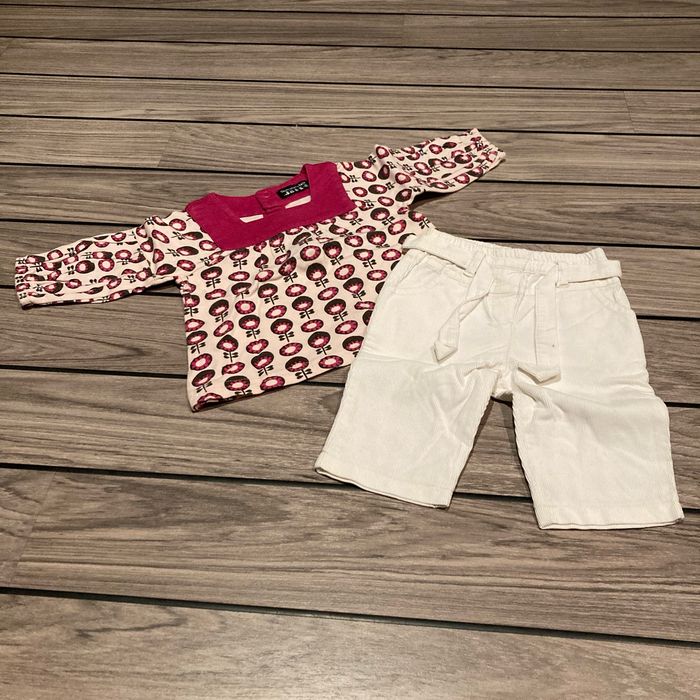 Ensemble composé d’une tunique pressions dos à fleurs et d’un pantalon velours blanc à ceinture Taille 3 mois Marque Tout compte fait