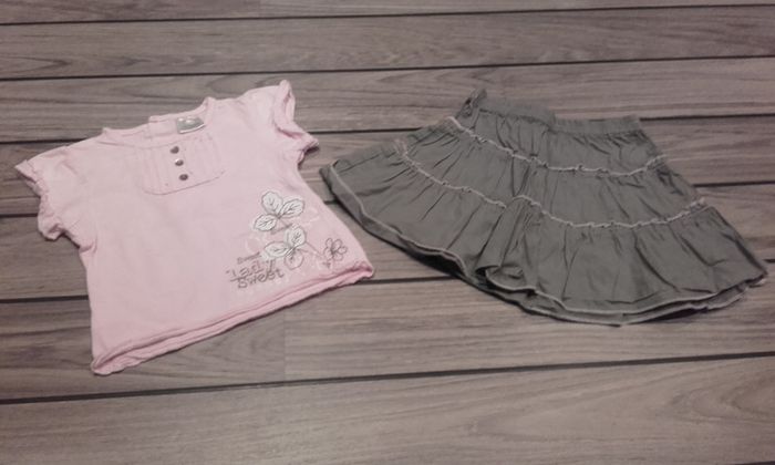 Jupe kaki clair jamais portée car taille un peu grand + tee shirt manches courtes rose très peu porté taille 12 mois #salvm12mois