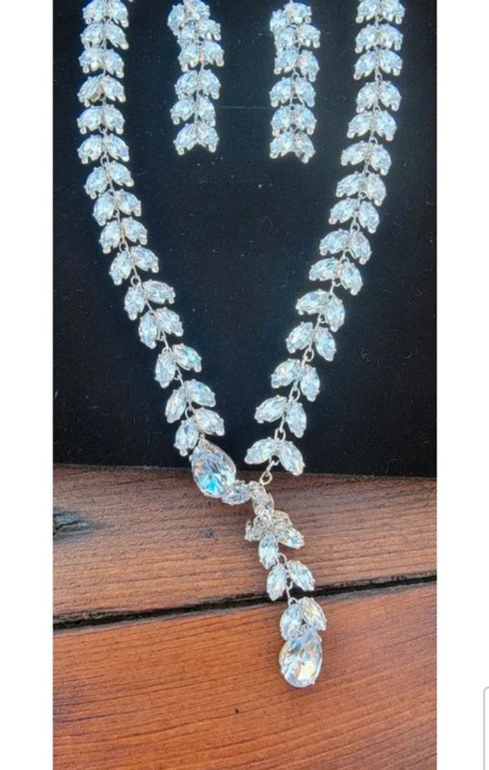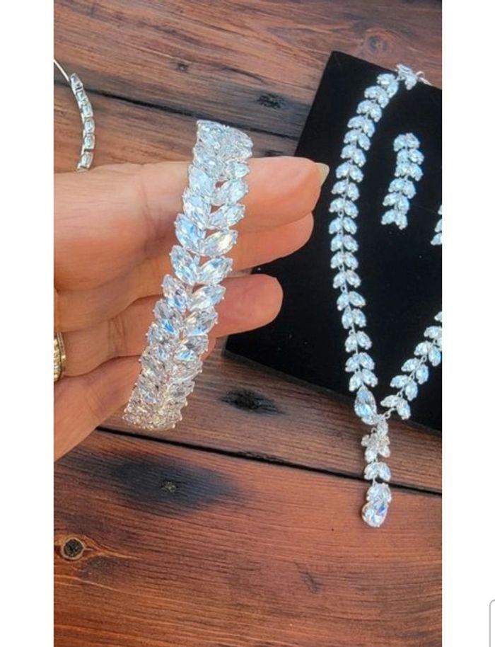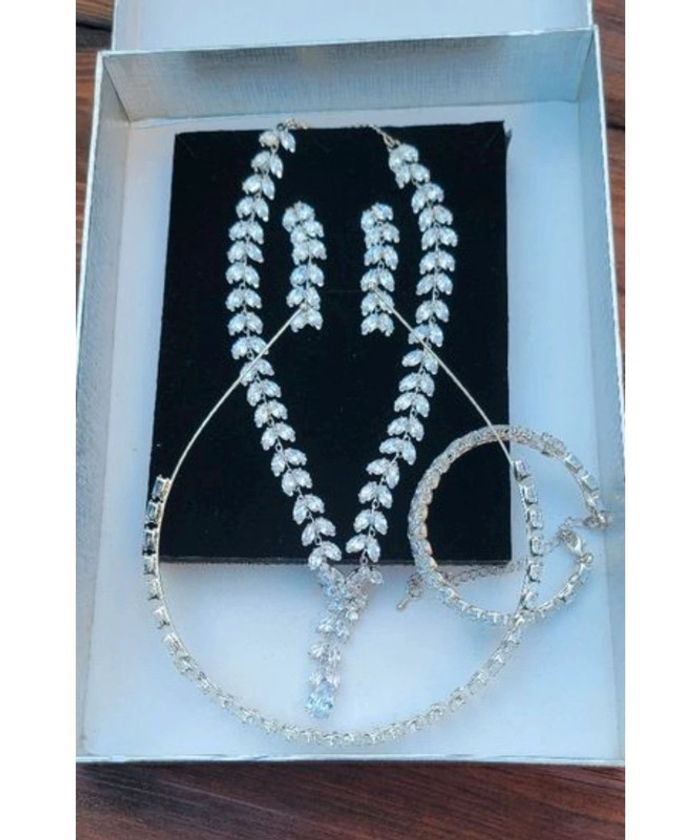 Collier, bracelet, boucles d oreilles et serre tête En verre je pense Neuf jamais porté car finalement ma fille a préféré du doré pour son mariage