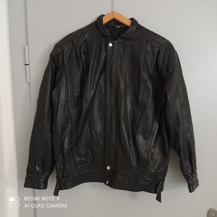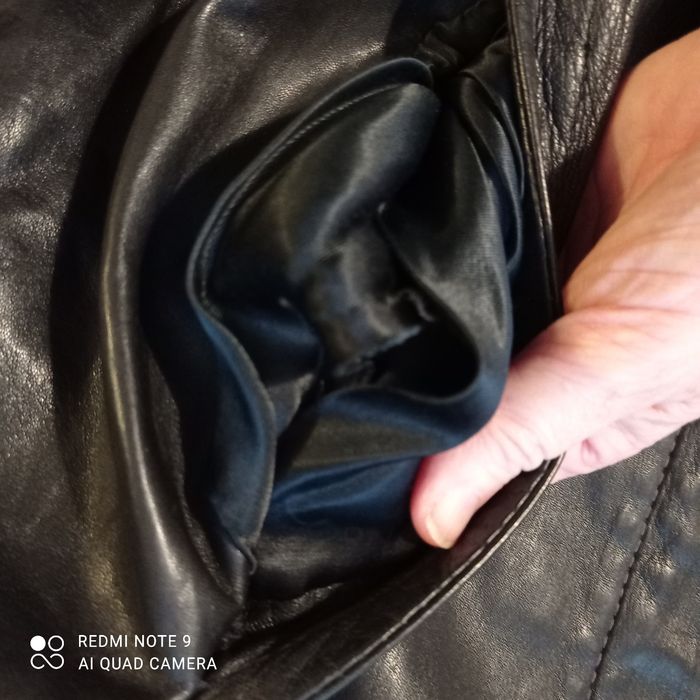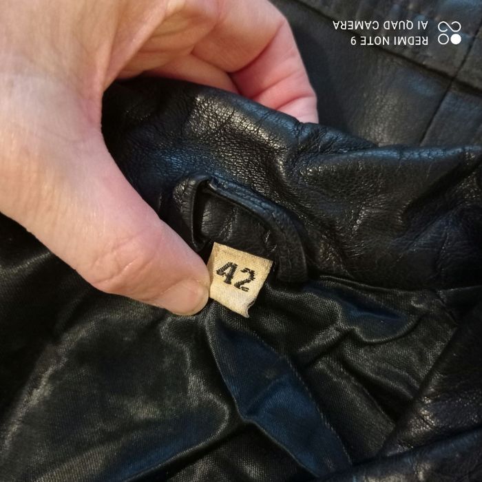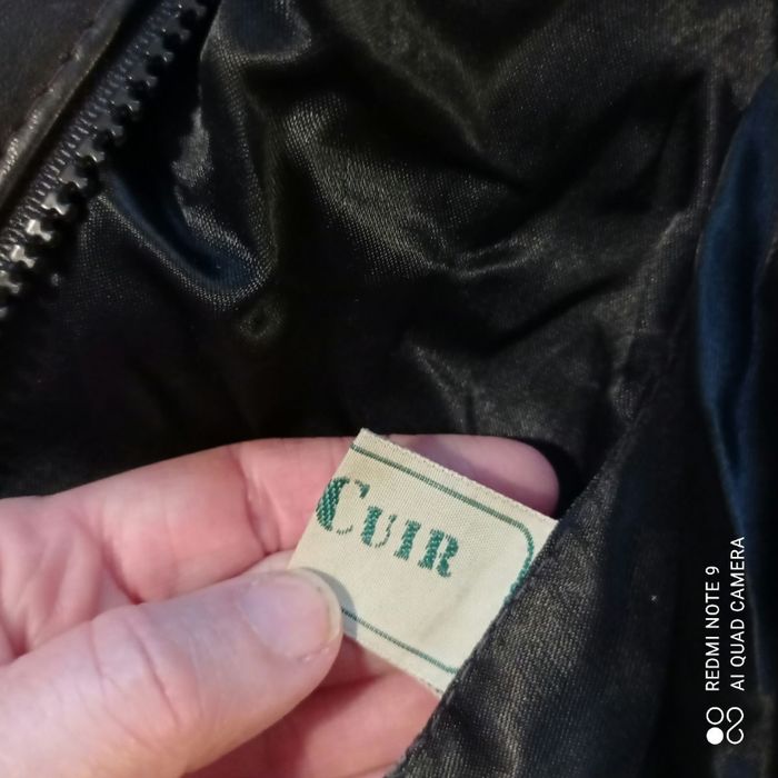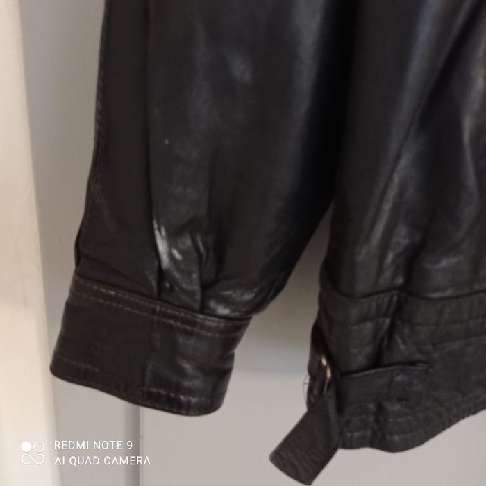 Quelques petits défauts : une trace blanche, un bouton pression défectueux, la doublure d une poche est décousue. Cuir voir étiquette en photo. Étiqueté t42 mais selon moi taille plus petit. Voici les mesures prises à plat : épaules : 50cm, aisselles : 64cm, longueur : 68cm.