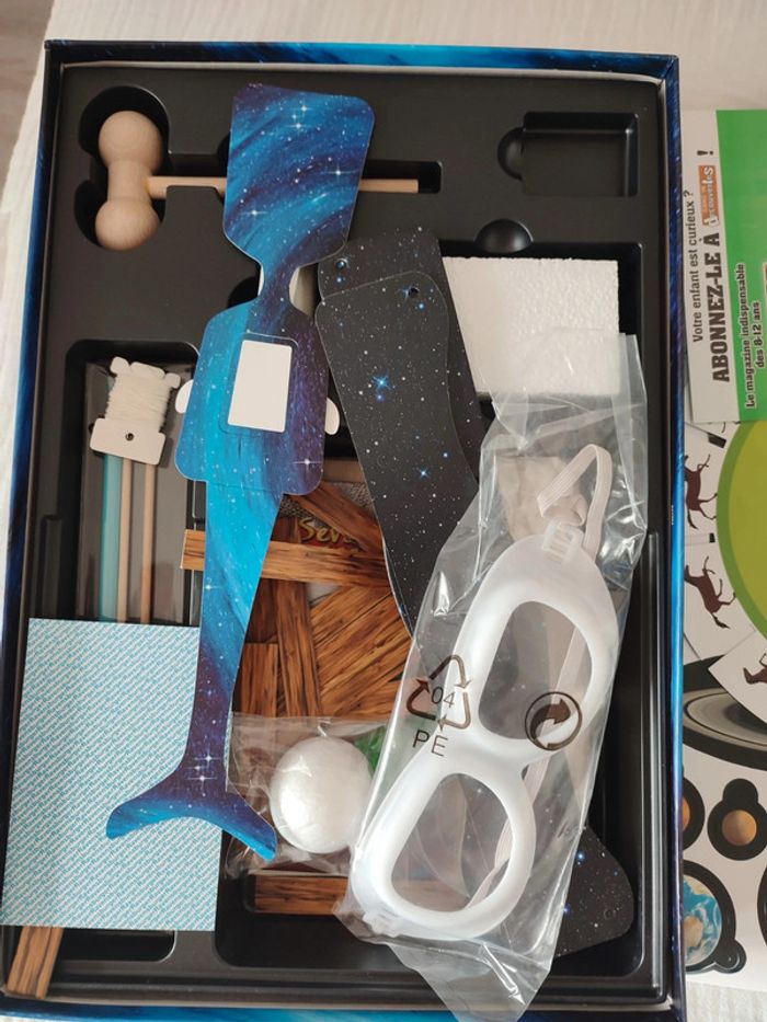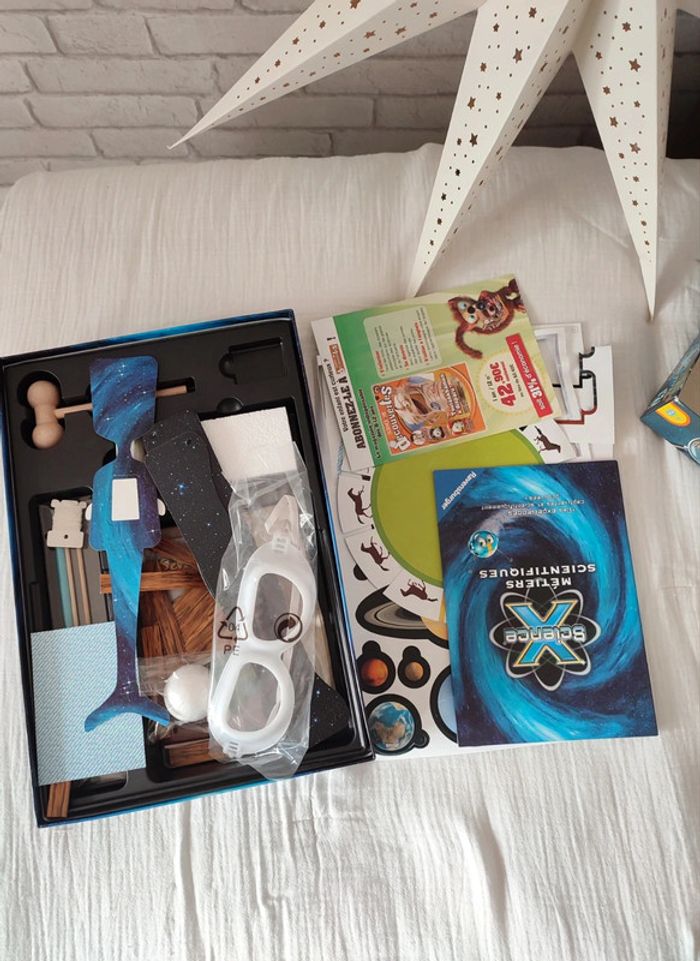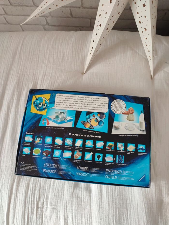 complet, neuf, juste ouvert avec le kit d'expériences Science X de Ravensburger et effectue des tests captivants et scientifiquement prouvées ! Médecin? Pilote? Ingénieur? 15 expériences pour découvrir quel métier est fait pour toi ! 2 boules en polystyrène, 1 système solaire, 2 petites baguettes en bois, 1 bloc en polystyrène, des lunettes de protection, 1 carte de test de la vision (tache aveugle), 1 marteau en bois, 2 coupelles, des graines de cresson, 1 roue hydraulique, 1 petit sac en coton, 1 paire de lunettes de vue en 3D, de la ficelle, 1 phénakistiscope, 1 boîtier «Camera obscura», 1 petit tuyau, 1 aile, 1 kit de construction de pont, de la pâte à modeler, 1 forme d’arbre, 1 tableau de prise de pouls, 1 manuel d’instructions. remise activee sur les lots