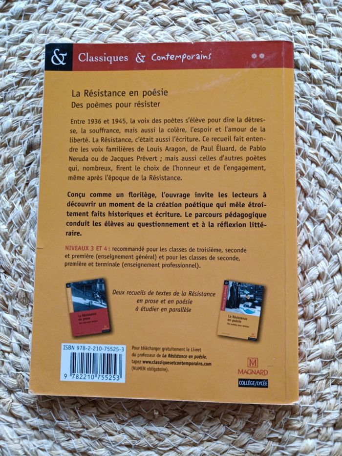 Livre : La Résistance en poésie Des poèmes pour résister En bon état - nom inscrit sur la première page et 2 pages ont été surlignées au stabilo Le reste est en très bon état !