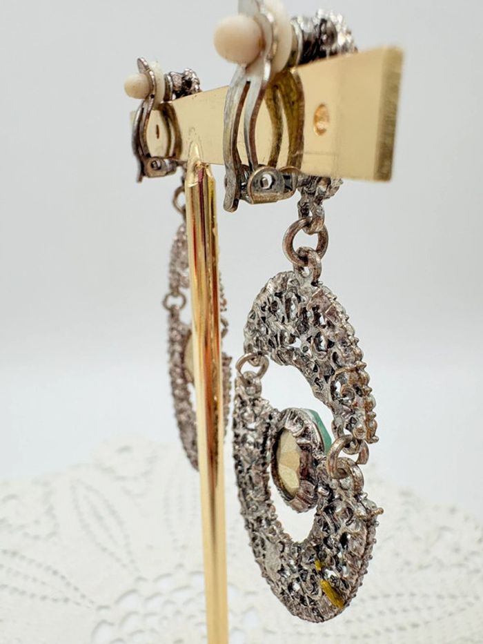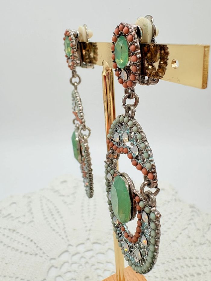 Très jolies clips d’oreilles type boho / bohème vintage 80’s pierres synthétiques. Très bel état 6,6 x 2,8 cm au plus large.