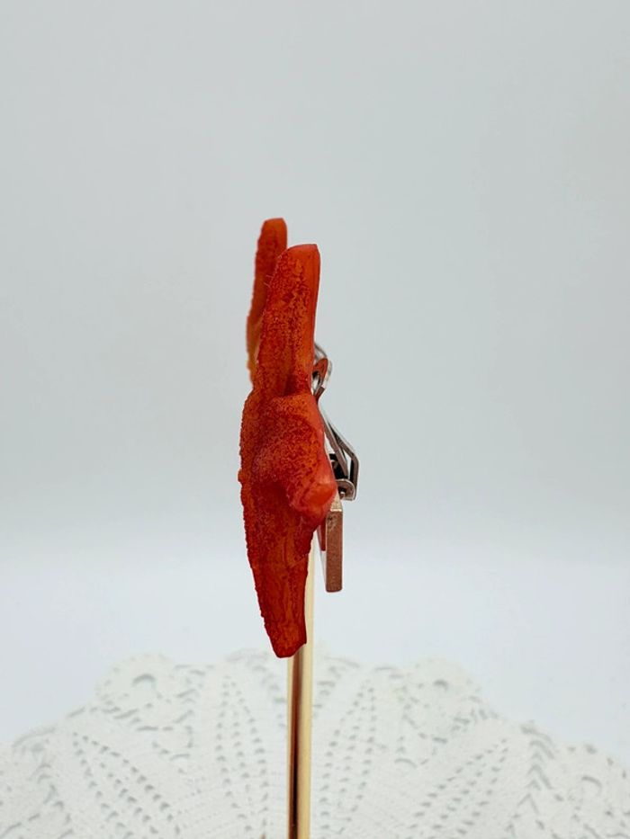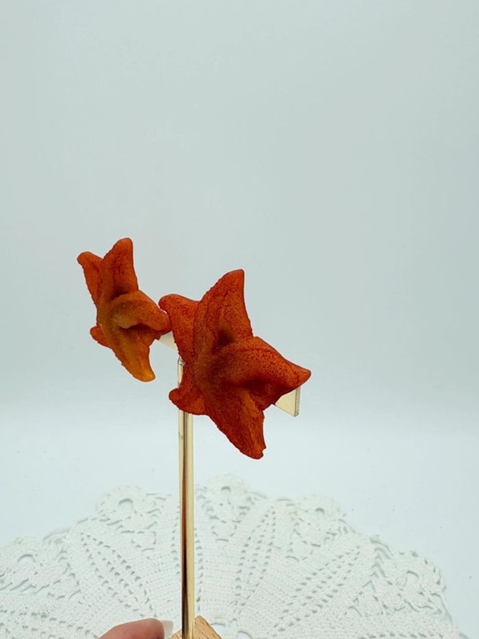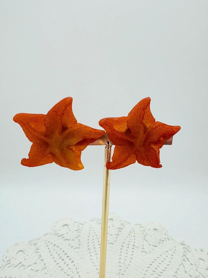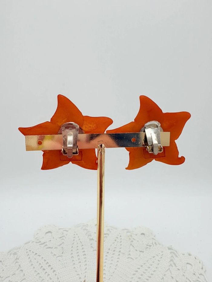 Clips d’oreilles en résine étoile de mer couleur corail. En excellent état. De la marque alternances Paris, ces boucles d’oreilles vintage viennent d’un créateur des années 80.
