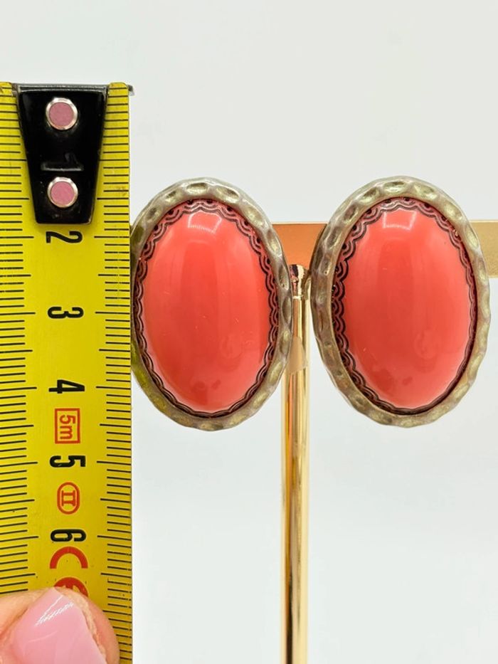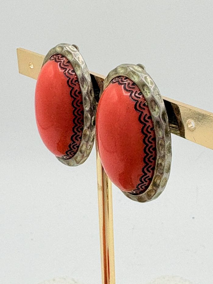 Très jolis clip d’oreilles vintage en métal couleur vieil or et cabochon acrylique corail Vintage Très 70’s. En très bon état général.