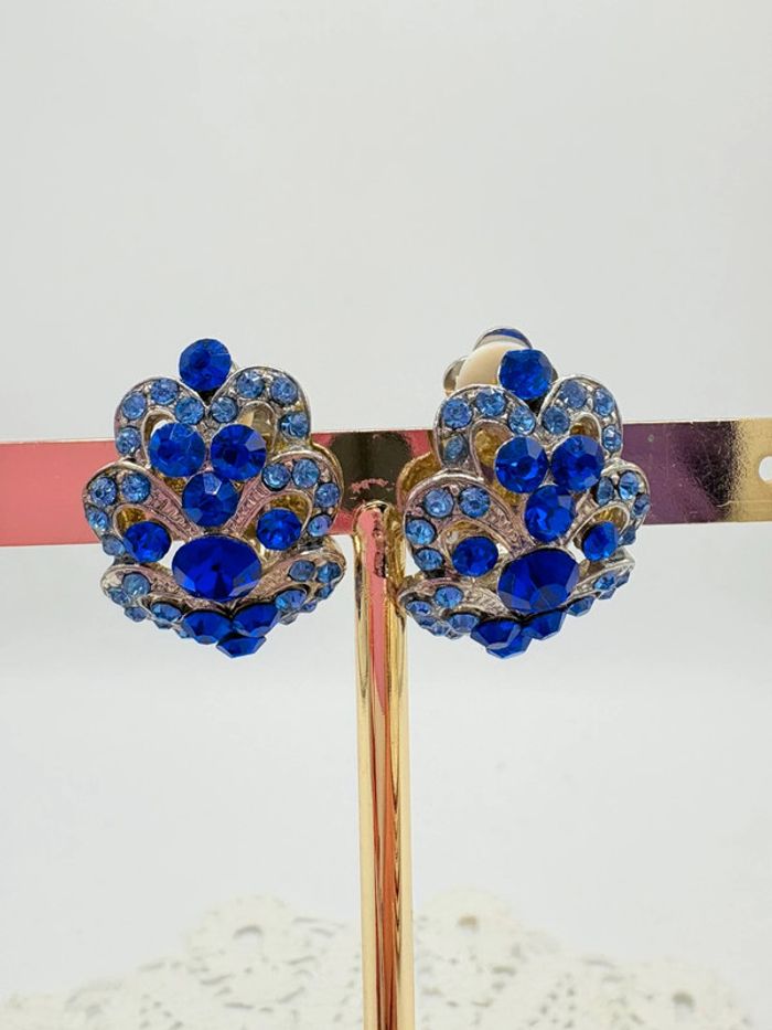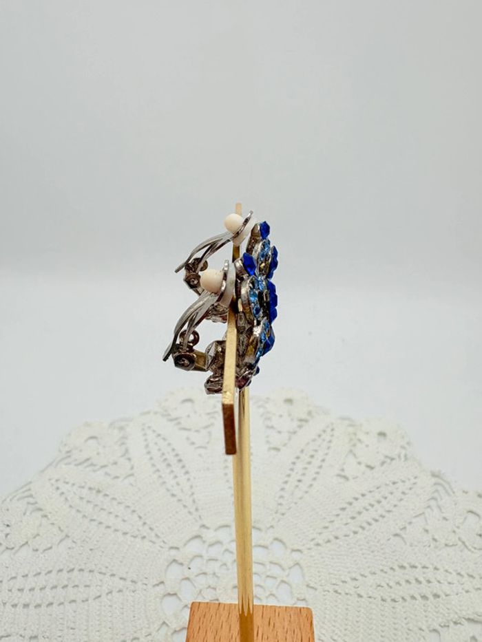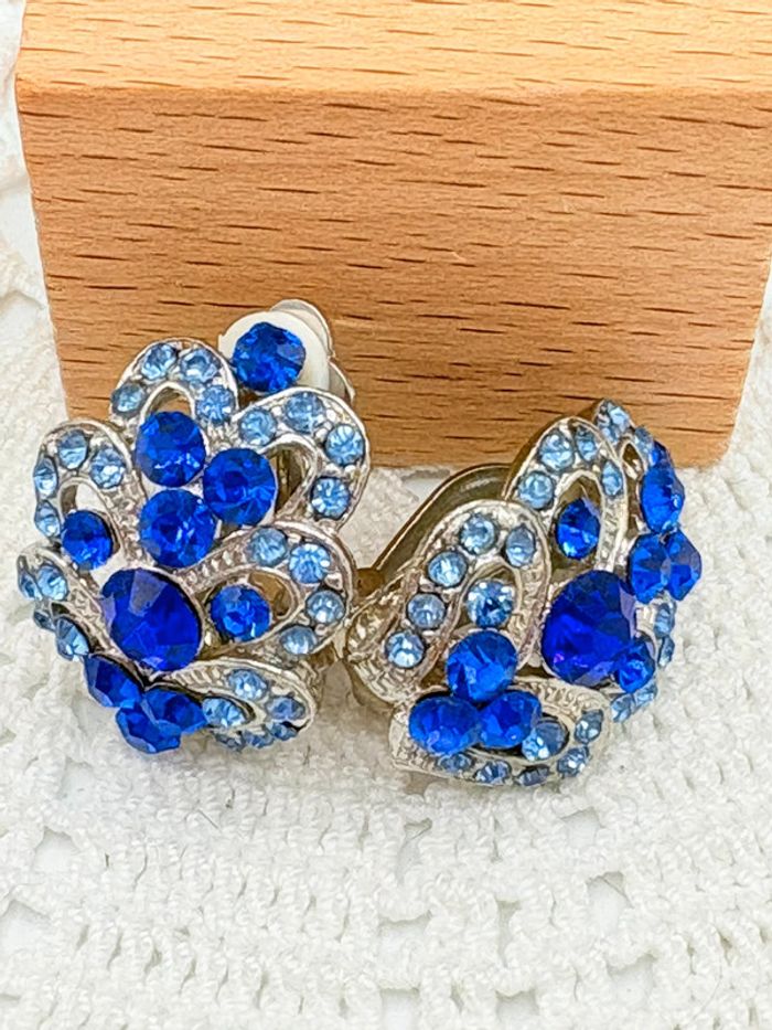 Très jolies boucles d’oreilles à clips motif fleurs de strass 2 tons de bleu sur métal argent. En très bon état. Vintage années 80 pour un look rétro.