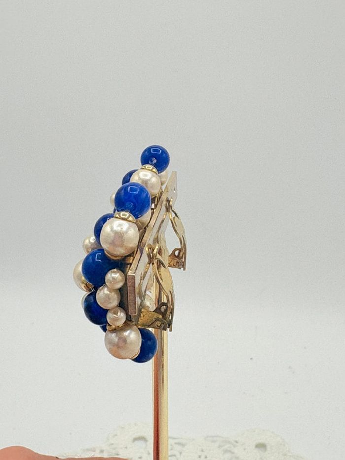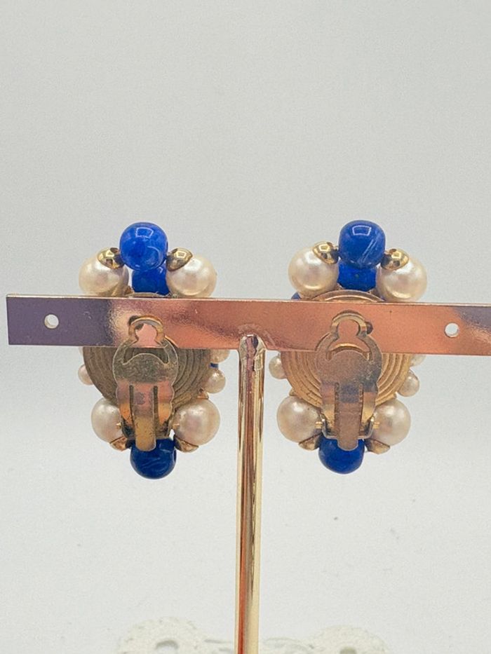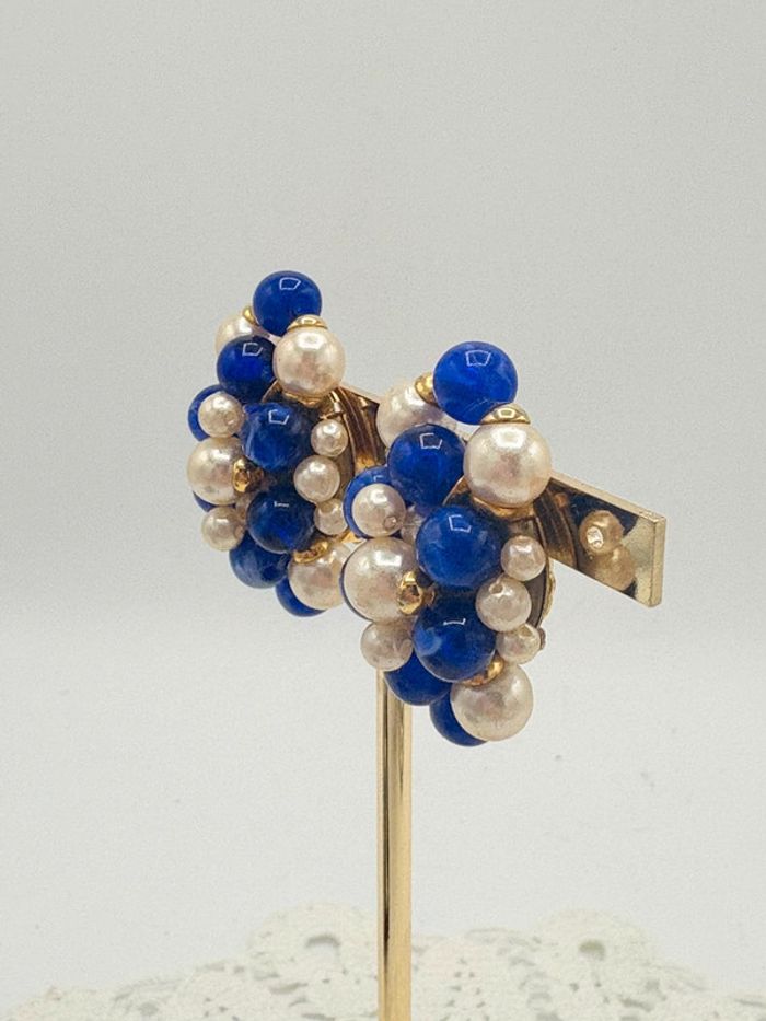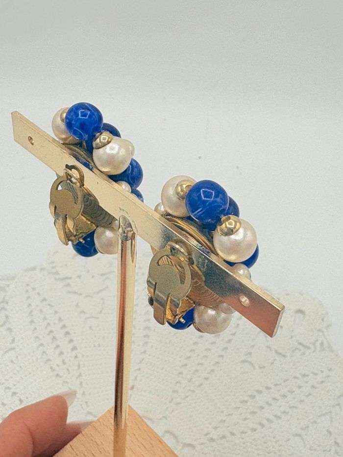 Clips d’oreilles vintage années 80. Perles bleues et nacrées à clips. En très bon état