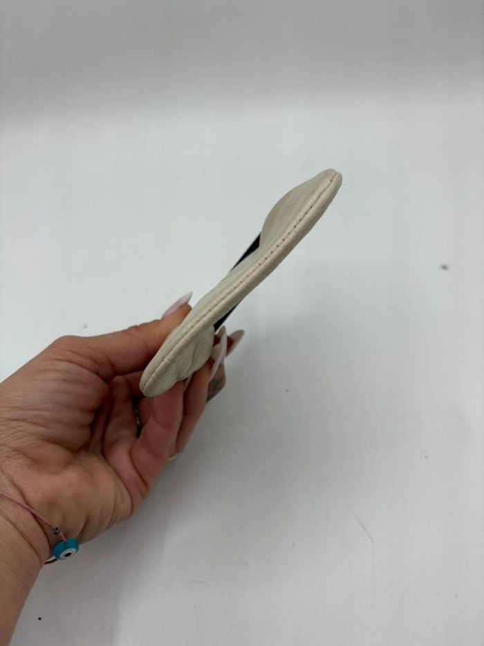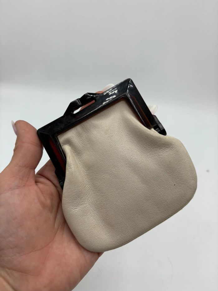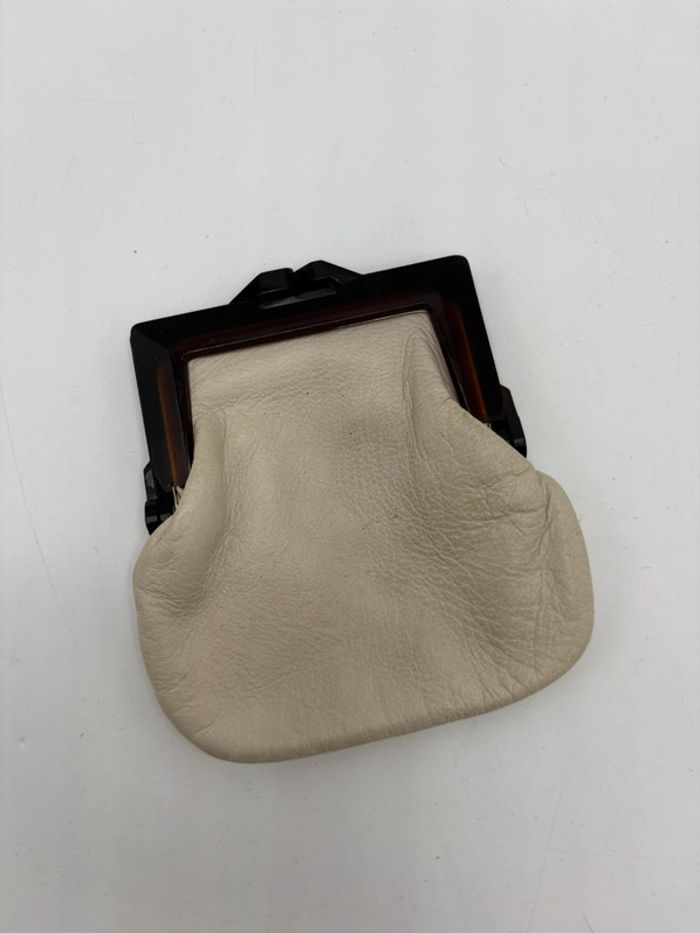Magnifique porte monnaie entièrement en cuir extérieur crème et intérieur cuir marron. La fermeture est en plastique écaillé en excellent état. Très pin up. Très joli accessoire.