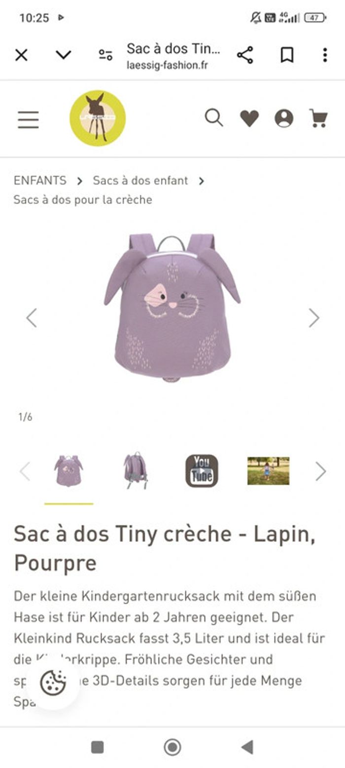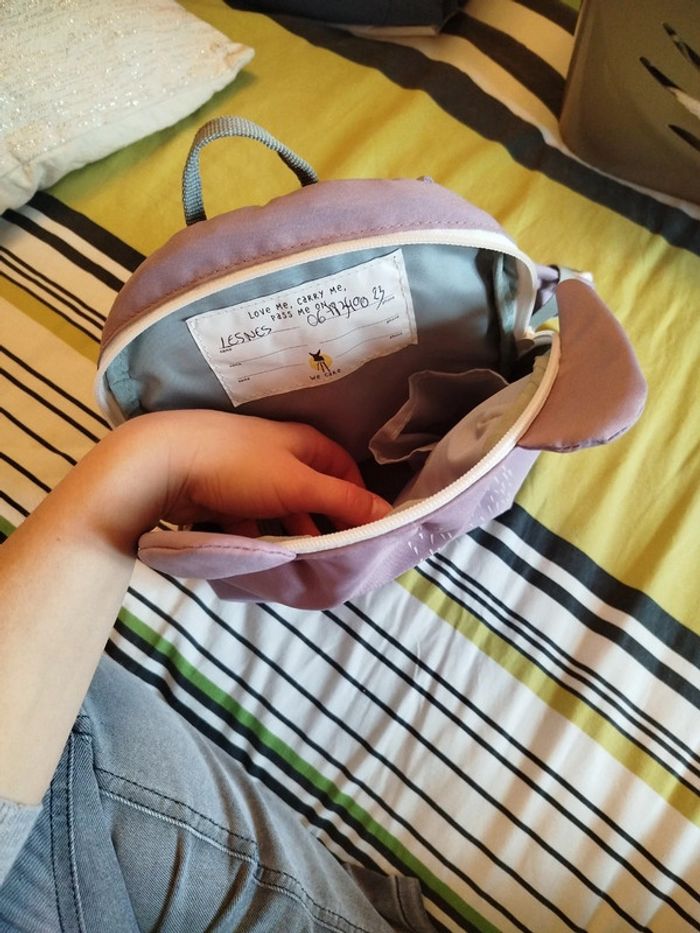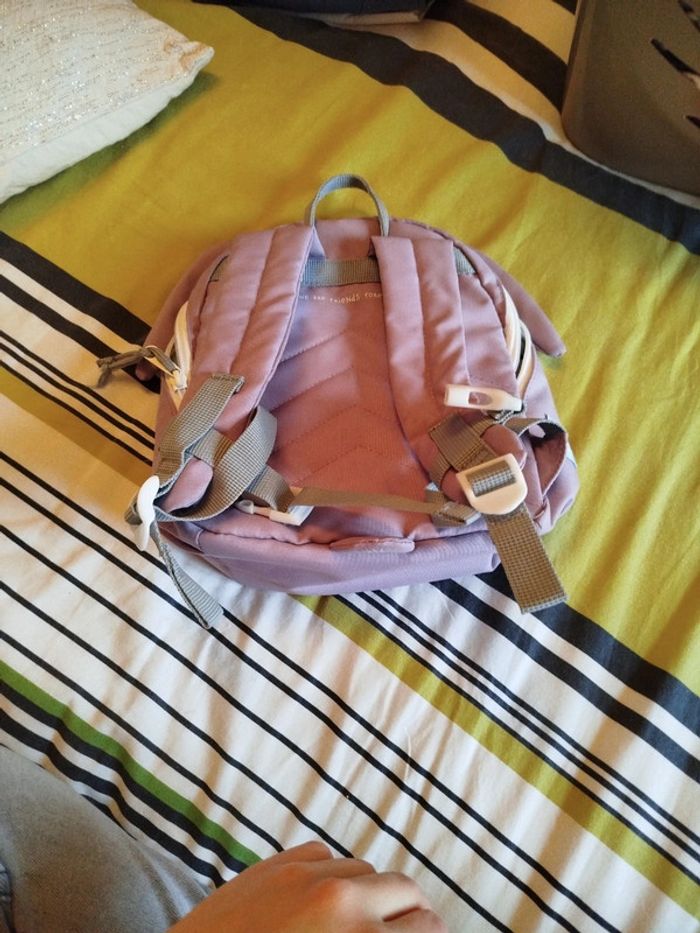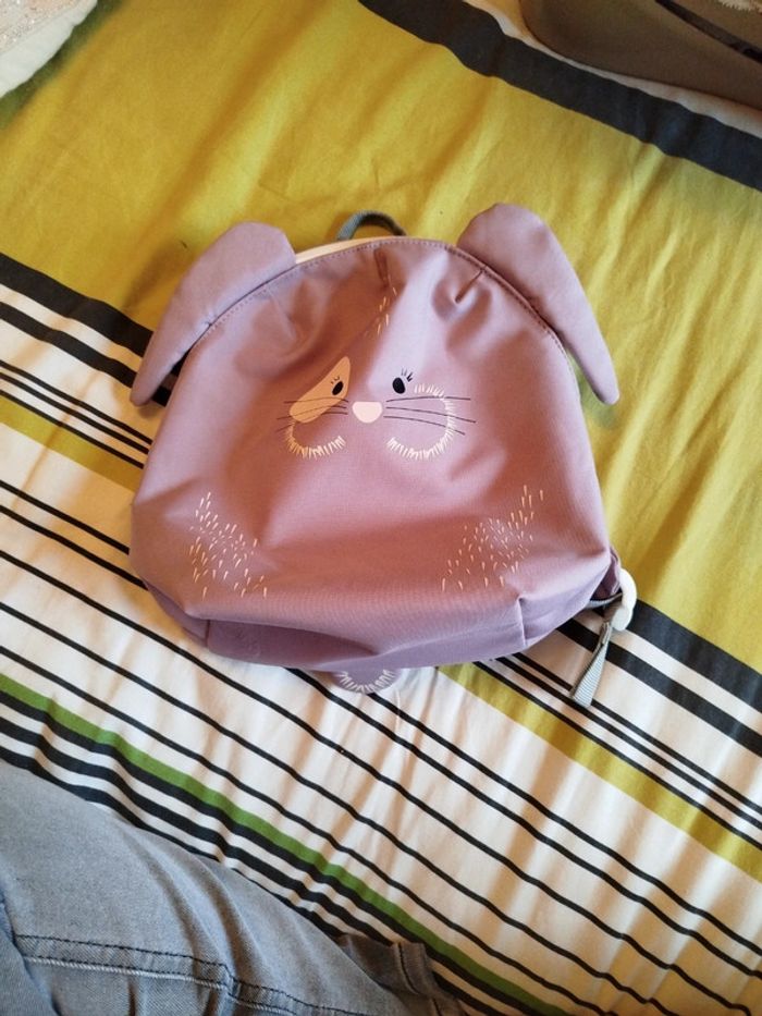 Sac a dos tiny creche lapin pourpre Lassig Très bon état. Très peu utilisé. Juste le nom d'écrit mais je vais le passer en machine pour que ça puisse partir.