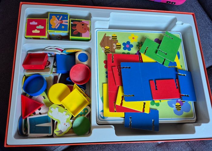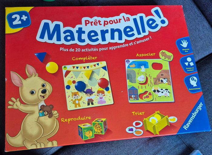 Jeux maternelle pour apprendre, dissocier, compter les couleurs, les formes, compléter des puzzles etc... Il est en très bon état, juste les angles de la boîte est abîmée, de la marque Ravensburger. Les règles des jeux est à l'intérieur