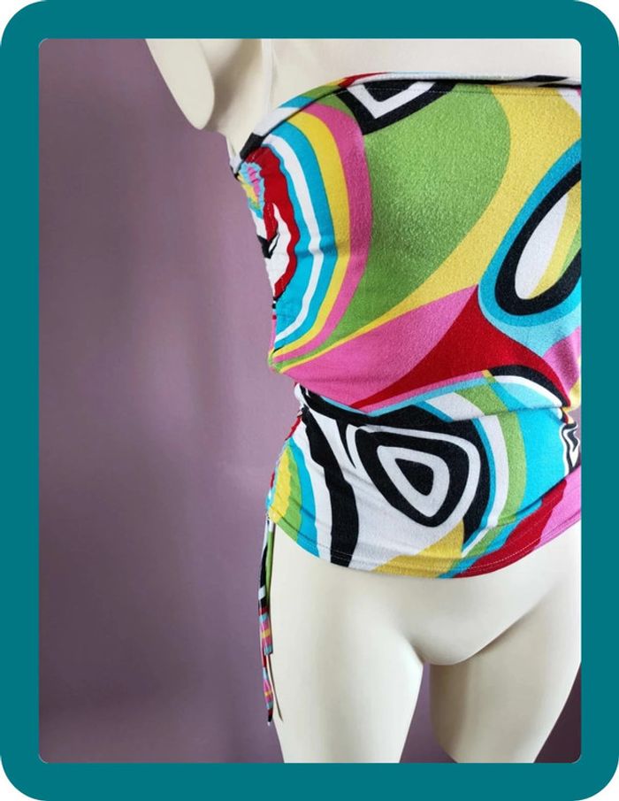Magnifique débardeur psychédélique vintage De toute les couleurs y2k Haut du top en mesh / transparent Resérable sur les côtés Made in France En bon état Taille unique soit un 36-38