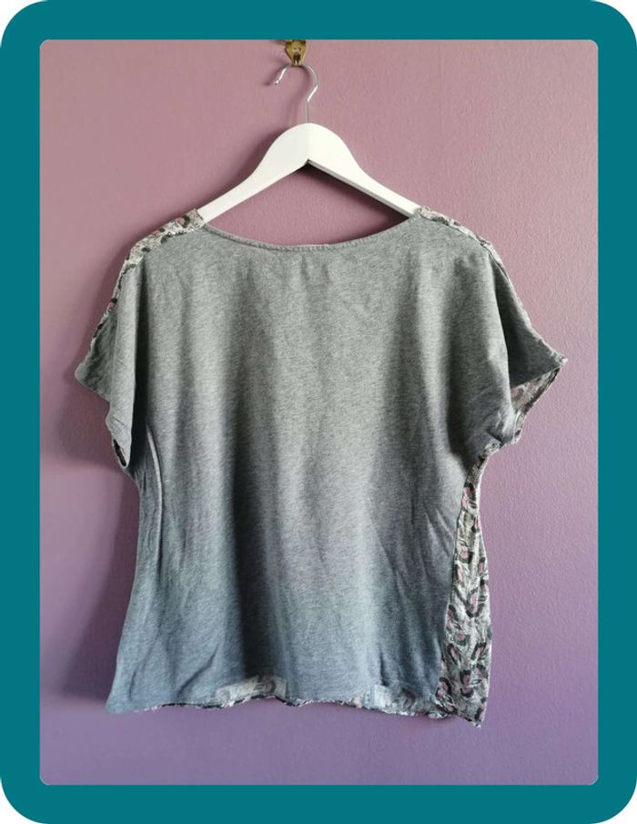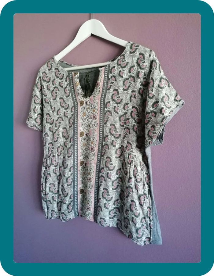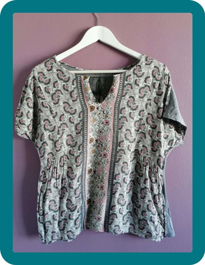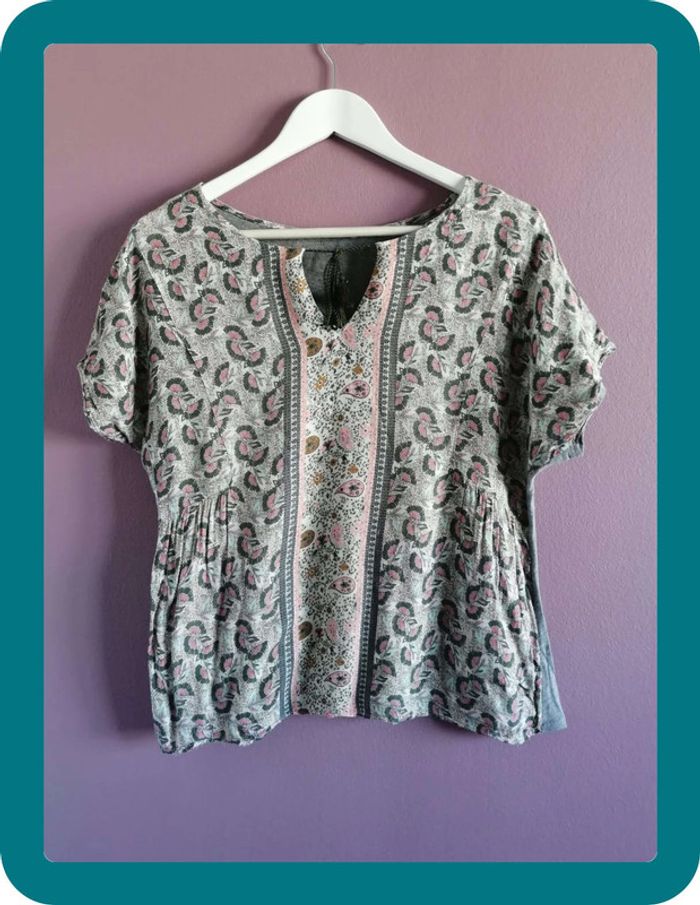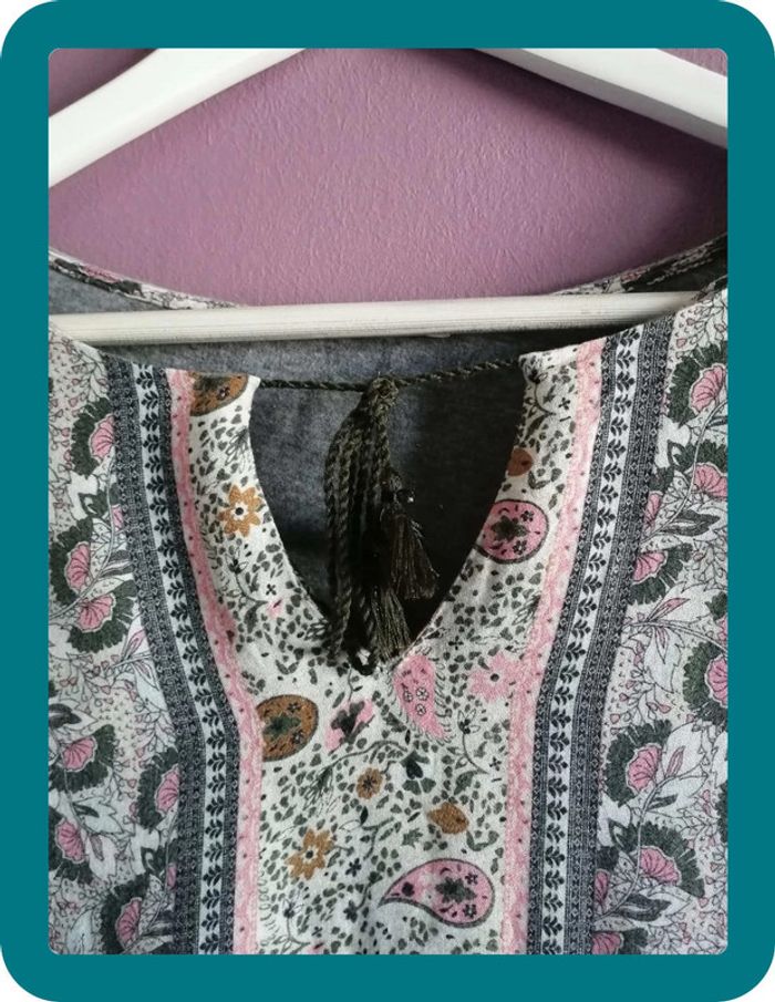 Magnifique tee shirt aztèque pour l'été Promod ! Petit décolleté sur le devant avec une ficelle ! Couleur principalement gris, il y a un peu de rose et de jaune. En parfait état #ngteeshirt