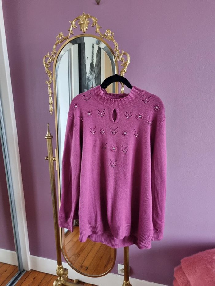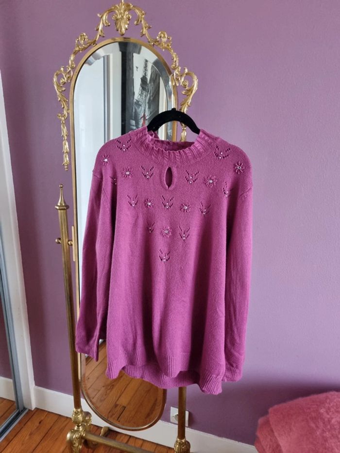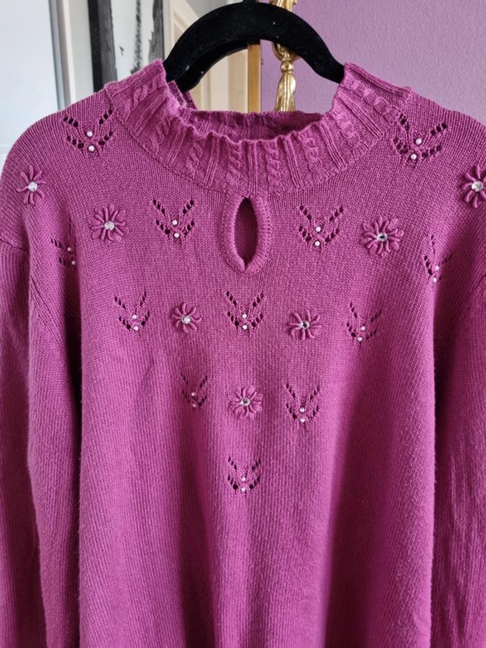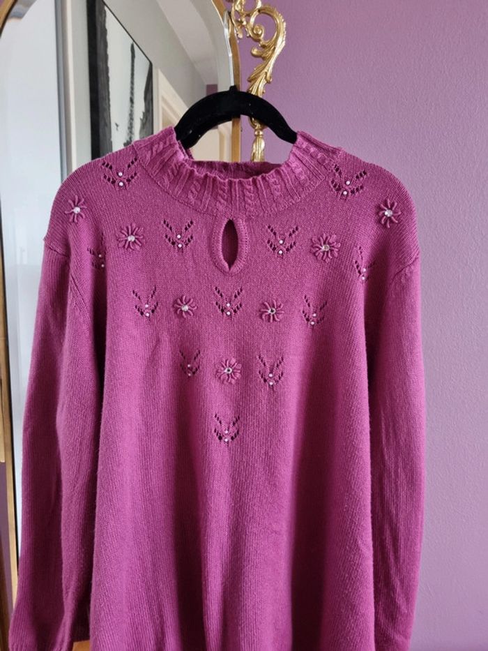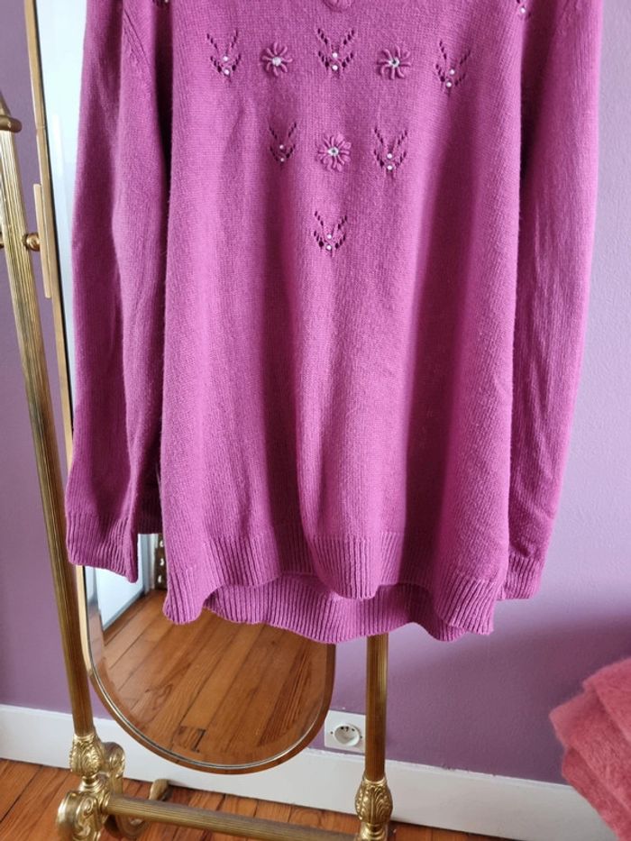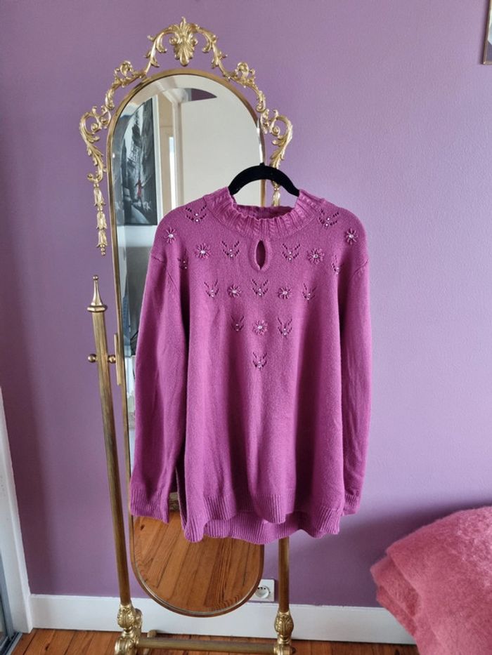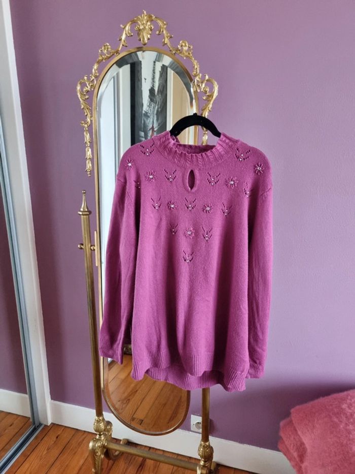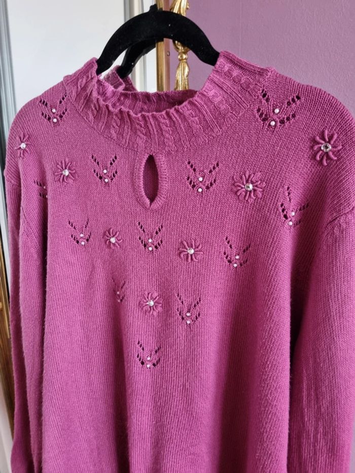 Magnifique pull rose fushia vintage Marque : Atelier Année '90 Jolis strass à l'avant Col haut brodé Ouverture en bas du col En parfait état Taille L- XL Dimensions : - Largeur épaules : 49 cm - Longueur dos : 67 cm - Largeur aiselles : 62 cm - Largeur taille : 66 cm