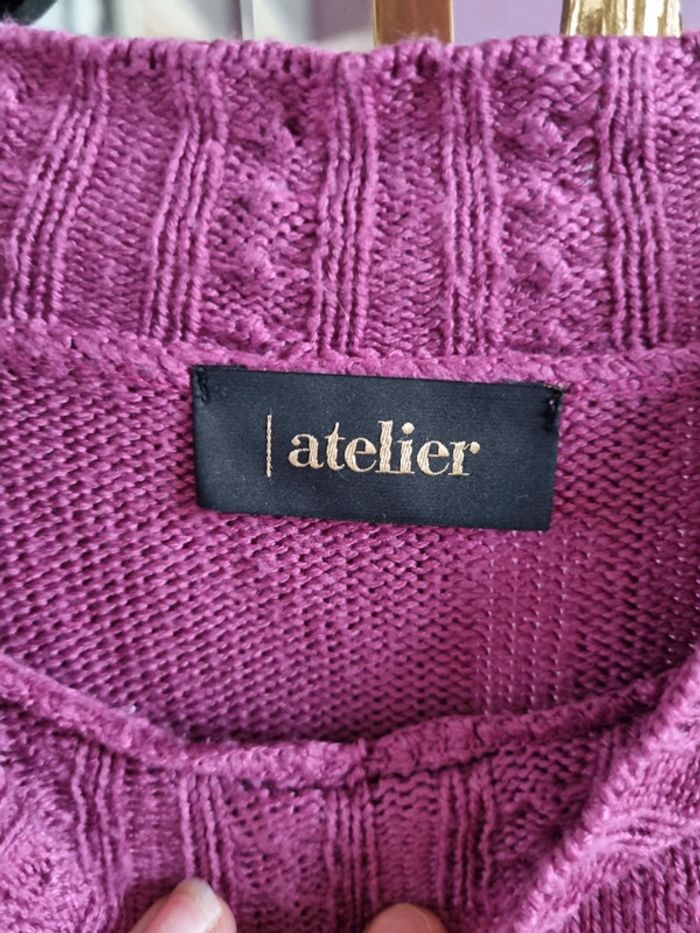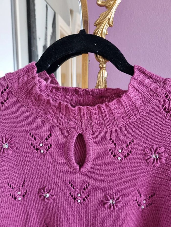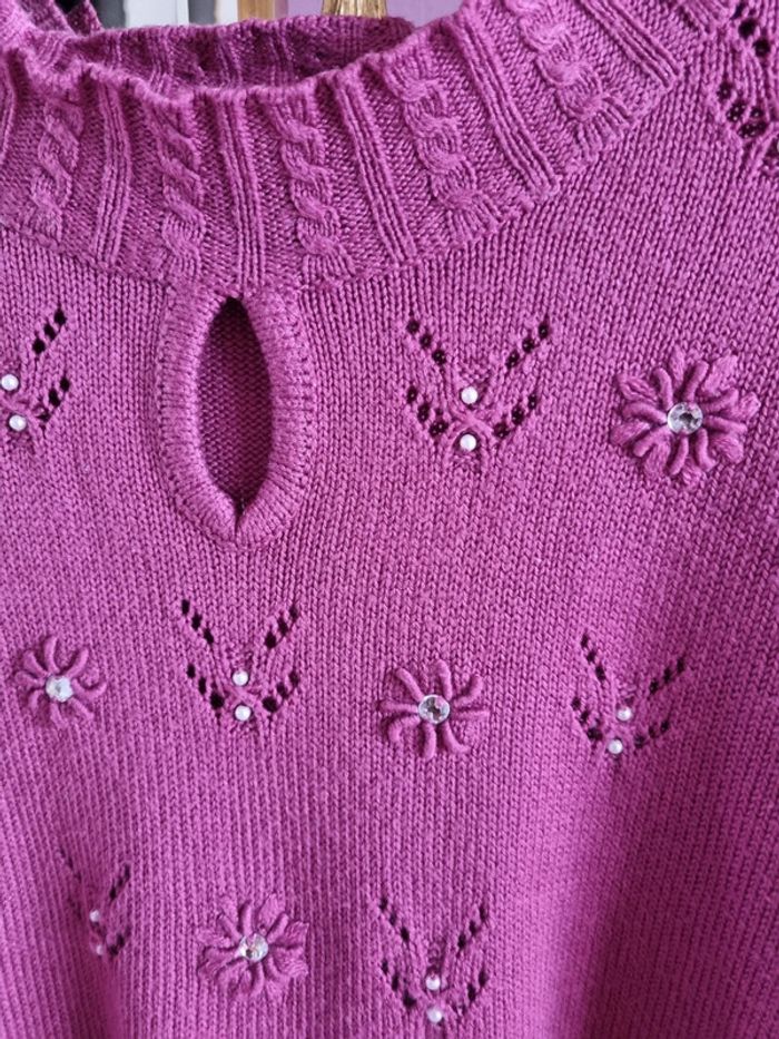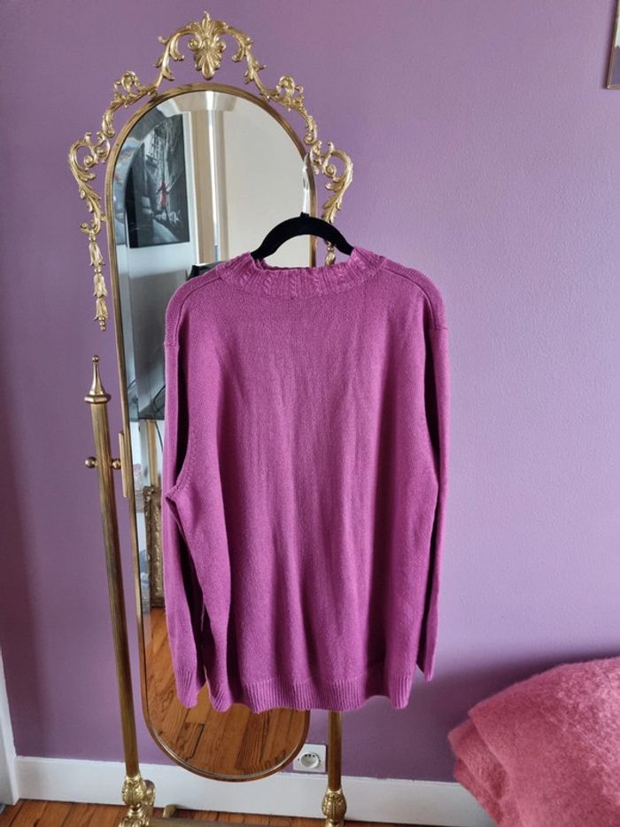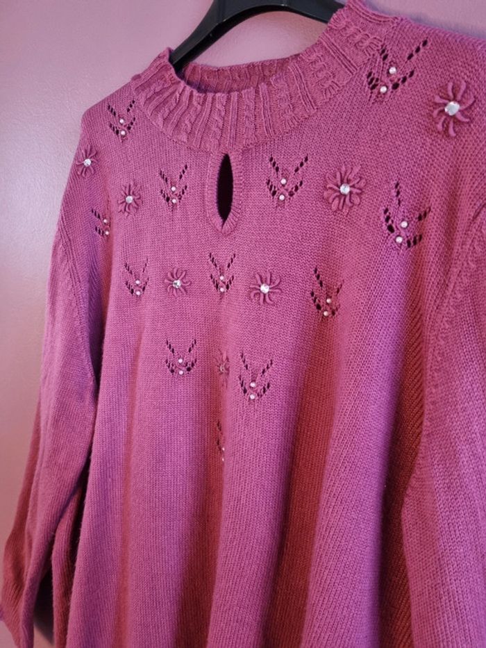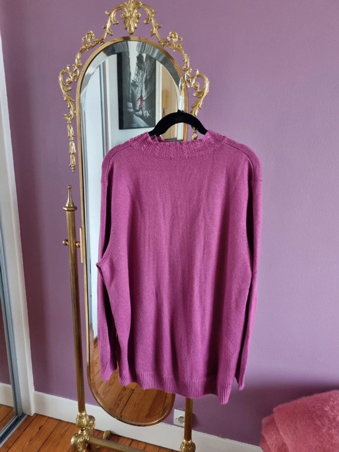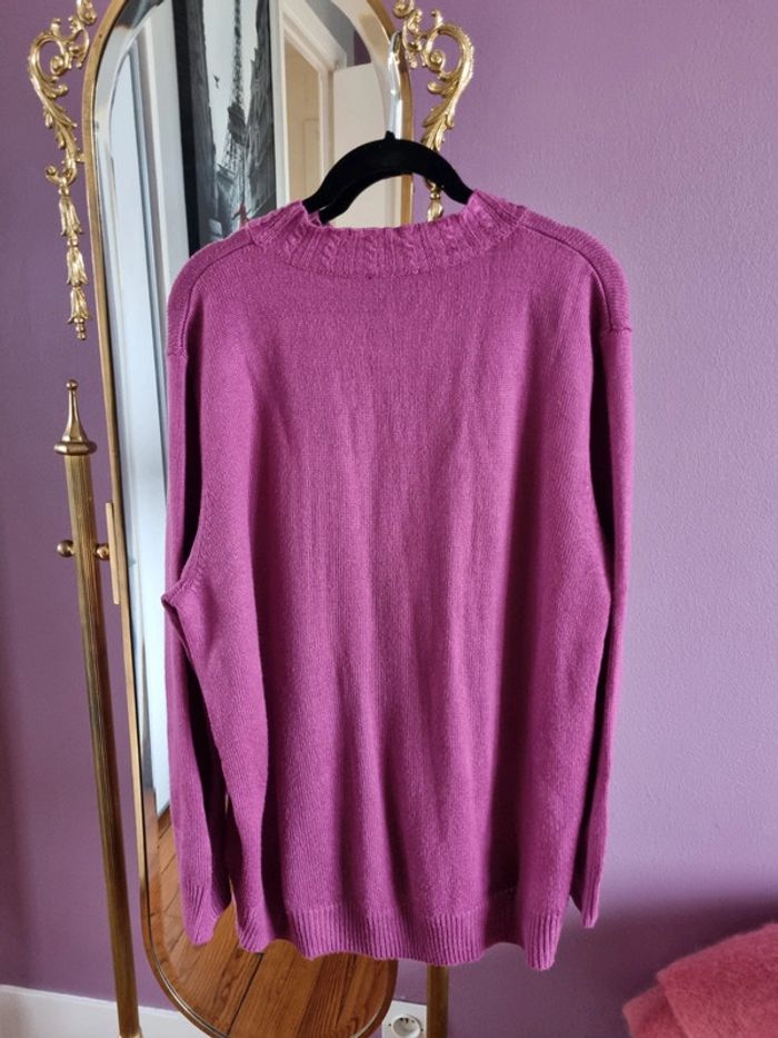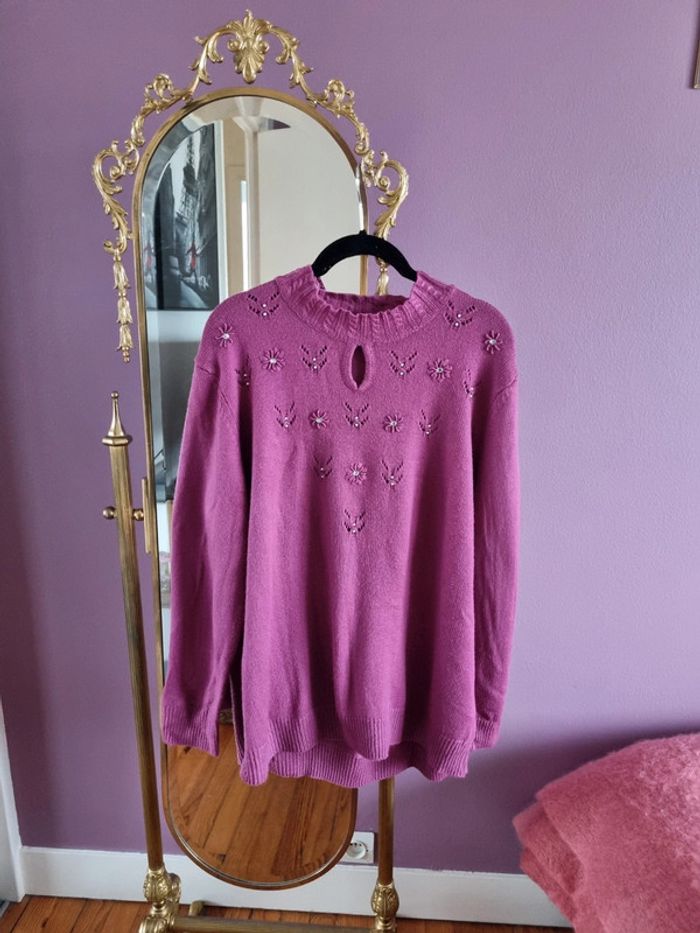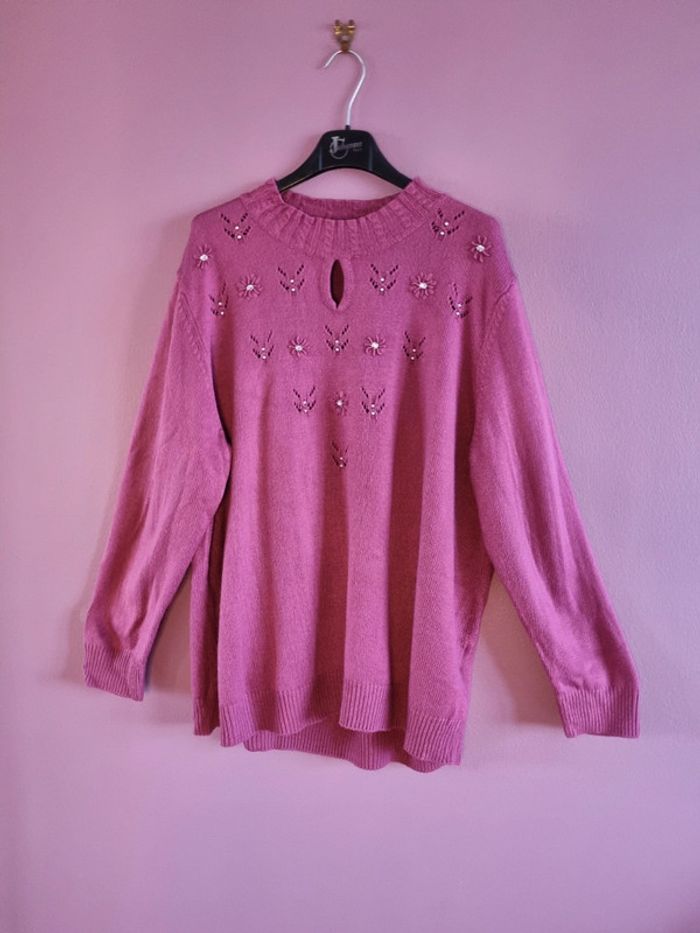 Magnifique pull rose fushia vintage Marque : Atelier Année '90 Jolis strass à l'avant Col haut brodé Ouverture en bas du col En parfait état Taille L- XL Dimensions : - Largeur épaules : 49 cm - Longueur dos : 67 cm - Largeur aiselles : 62 cm - Largeur taille : 66 cm