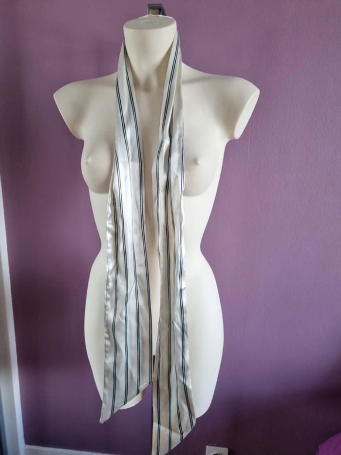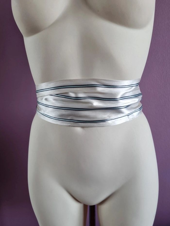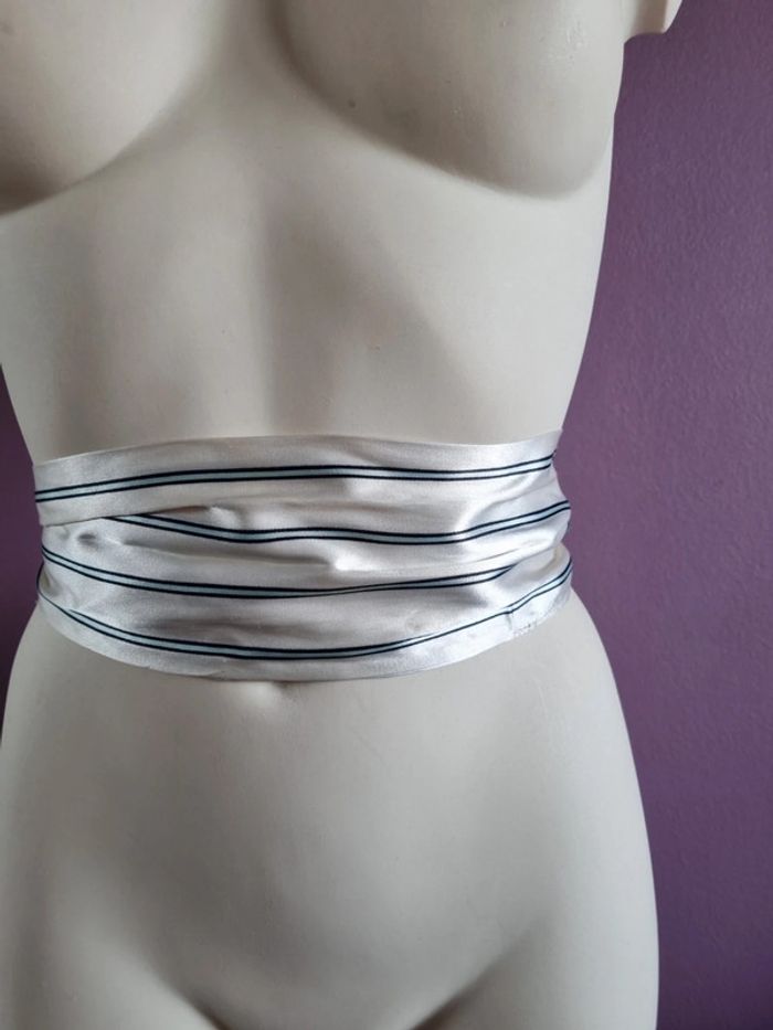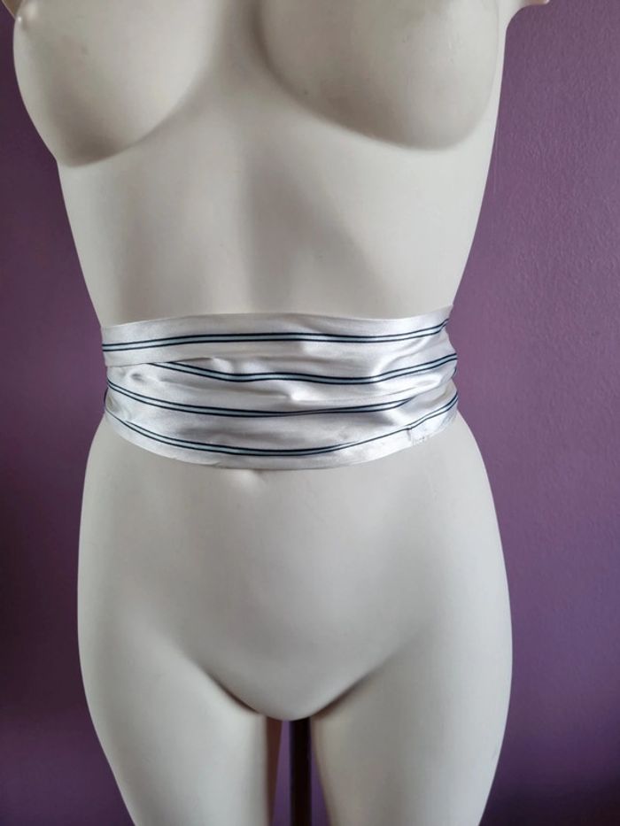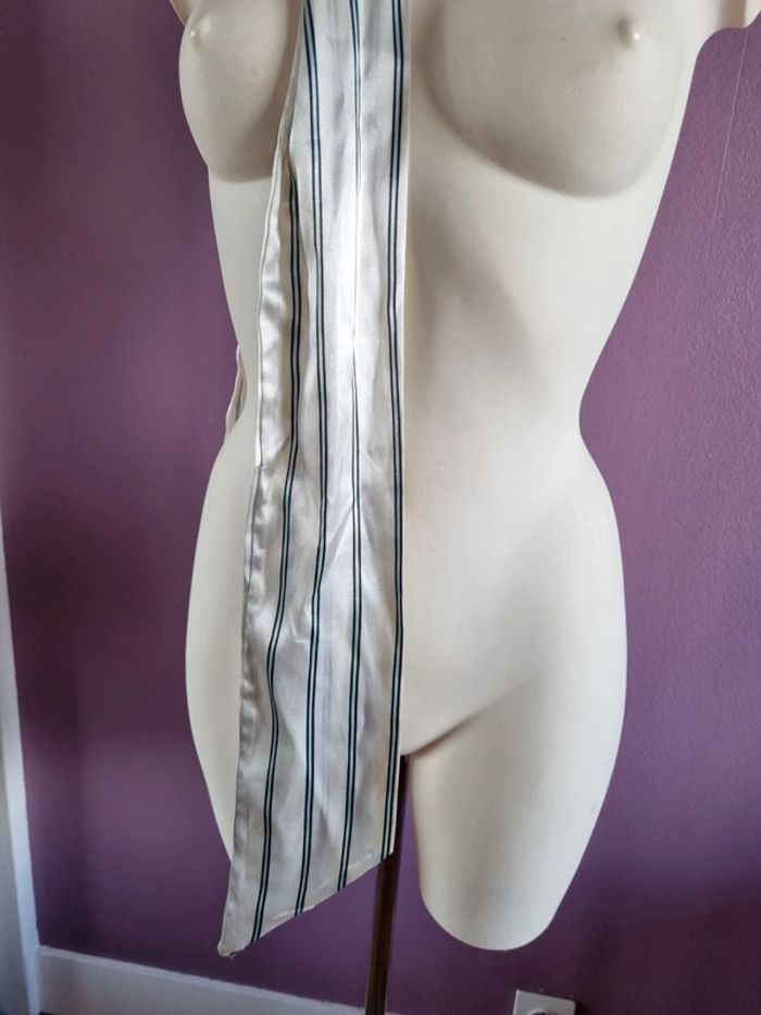 Belle ceinture en tissus rayé Peux s'utilise en étole fine Elle est de couleur blanc satiné, bleu marine et bleu clair En bon état Dimensions : - Longueur total : 187 cm - Largeur : 10,5 cm