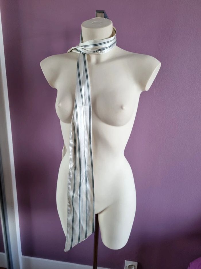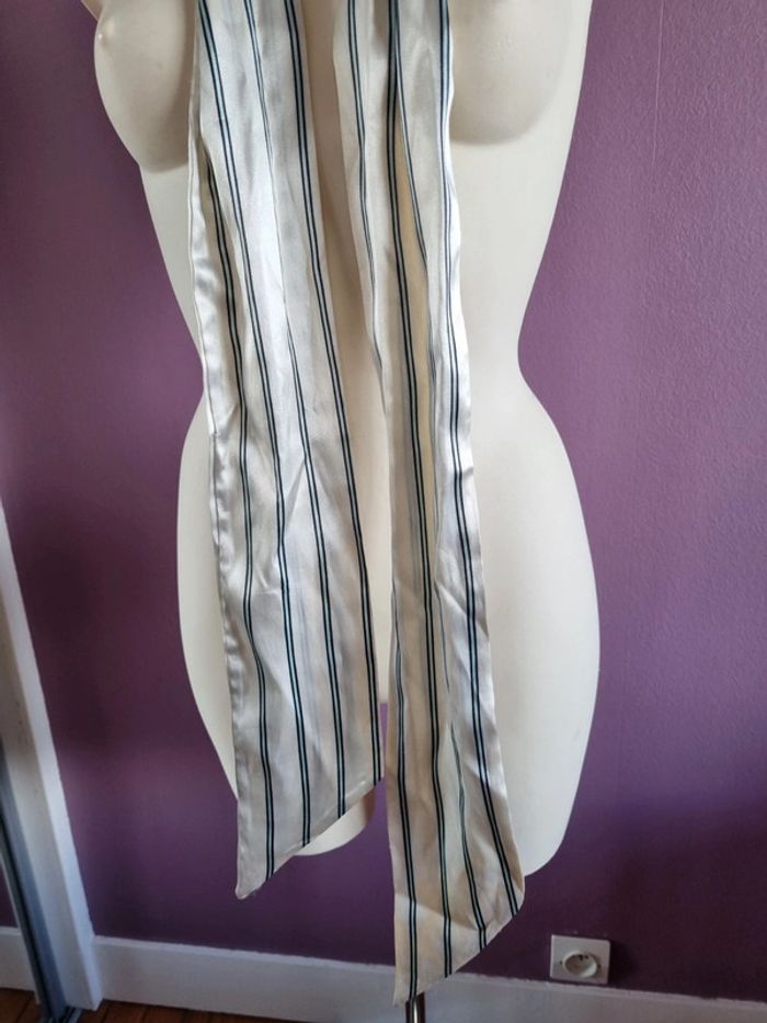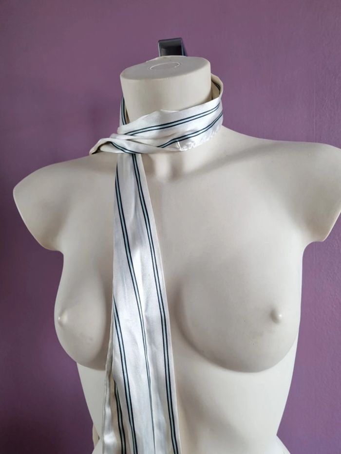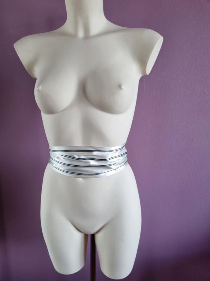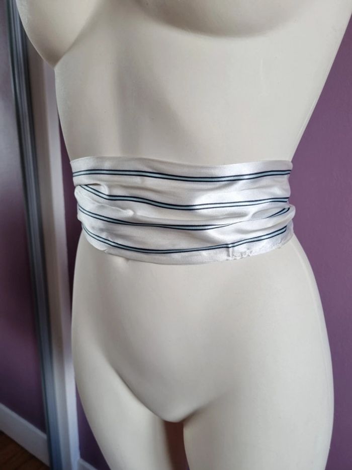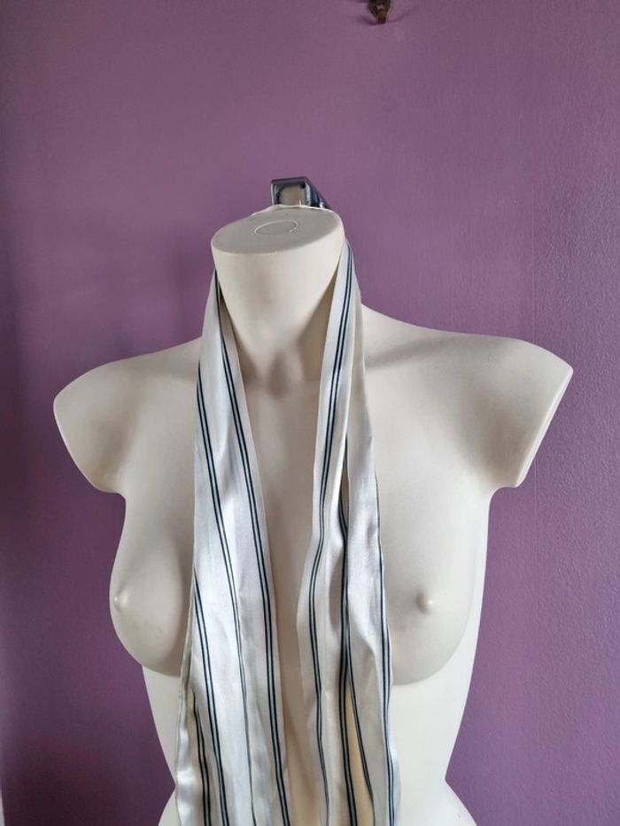 Belle ceinture en tissus rayé Peux s'utilise en étole fine Elle est de couleur blanc satiné, bleu marine et bleu clair En bon état Dimensions : - Longueur total : 187 cm - Largeur : 10,5 cm