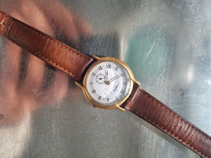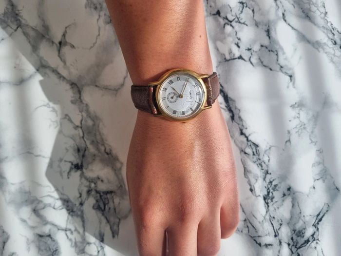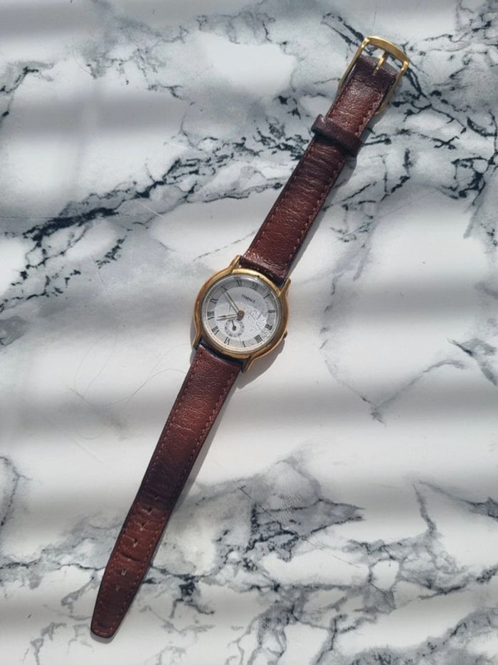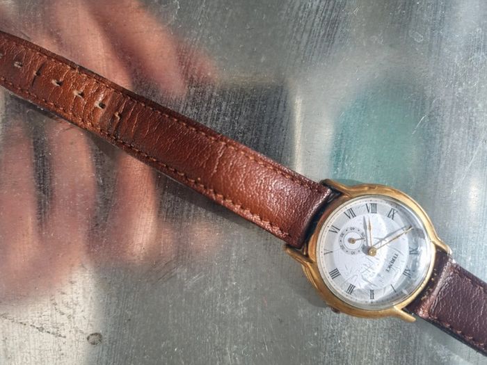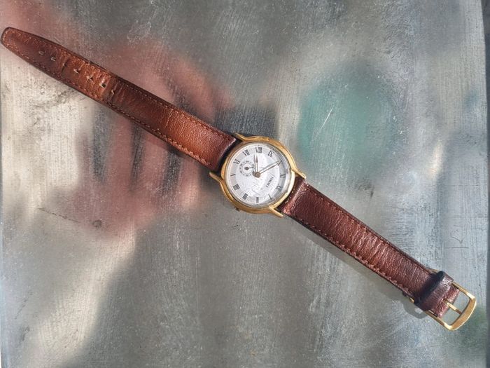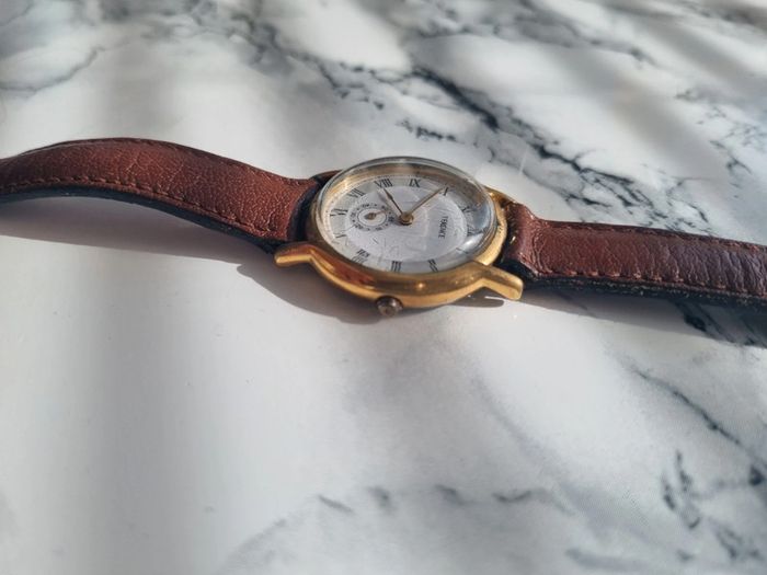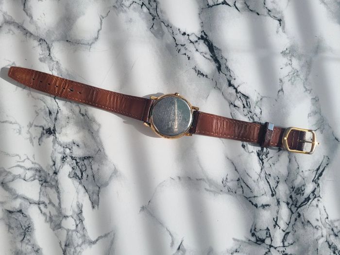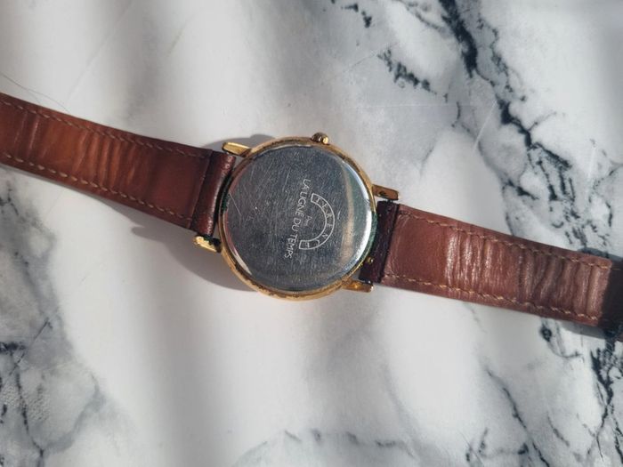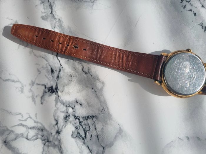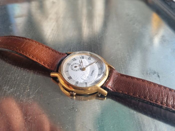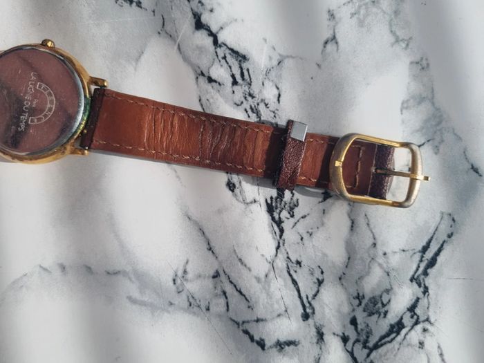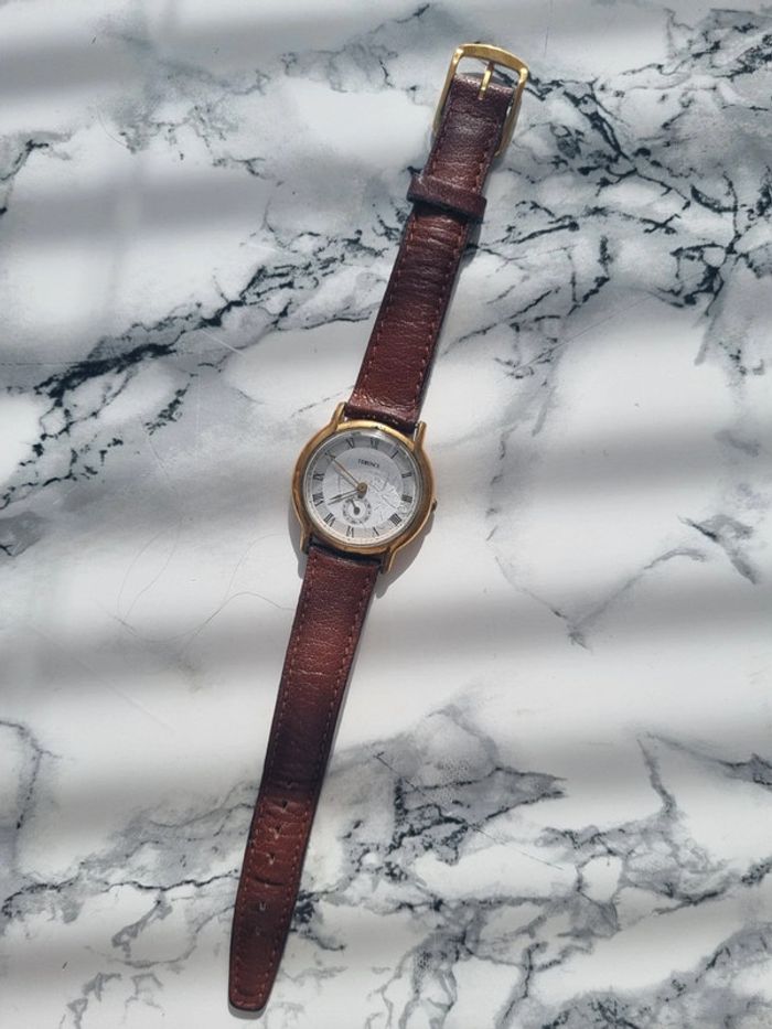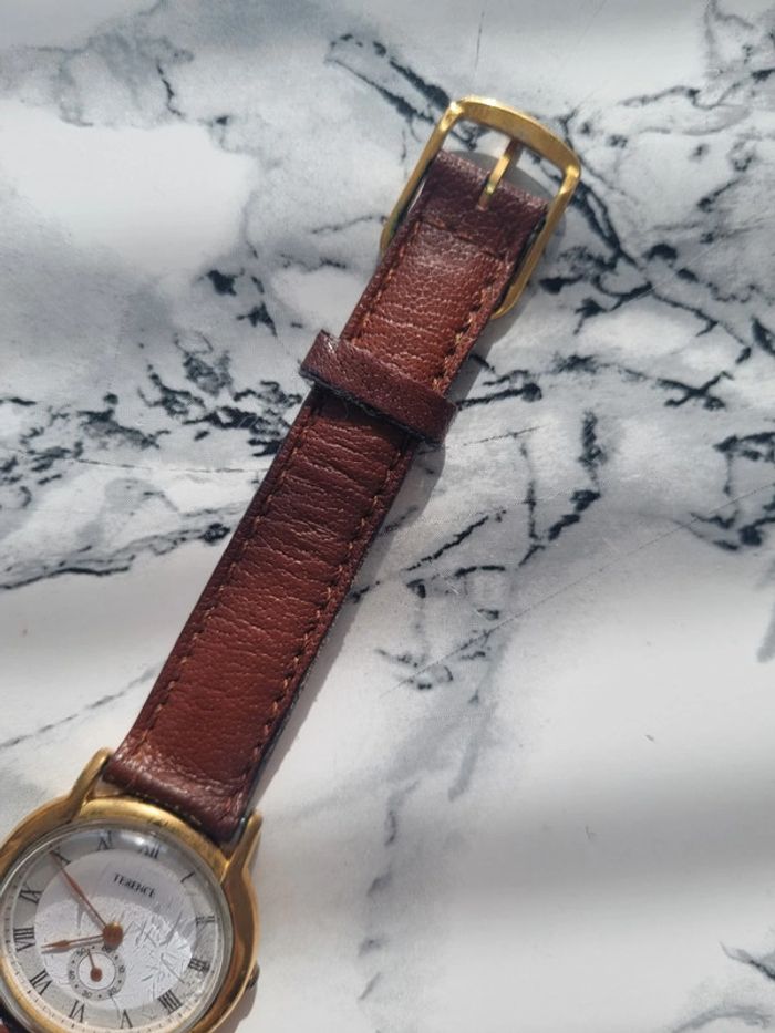 Magnifique montre en cuir de la marque Terence la ligne du temps Cadran bombé de couleur doré Cuir couleur marron En bon état Vendu sans pile Dimensions : - Longueur : 23,5 cm - Largeur du cadran : 4 cm Année '80