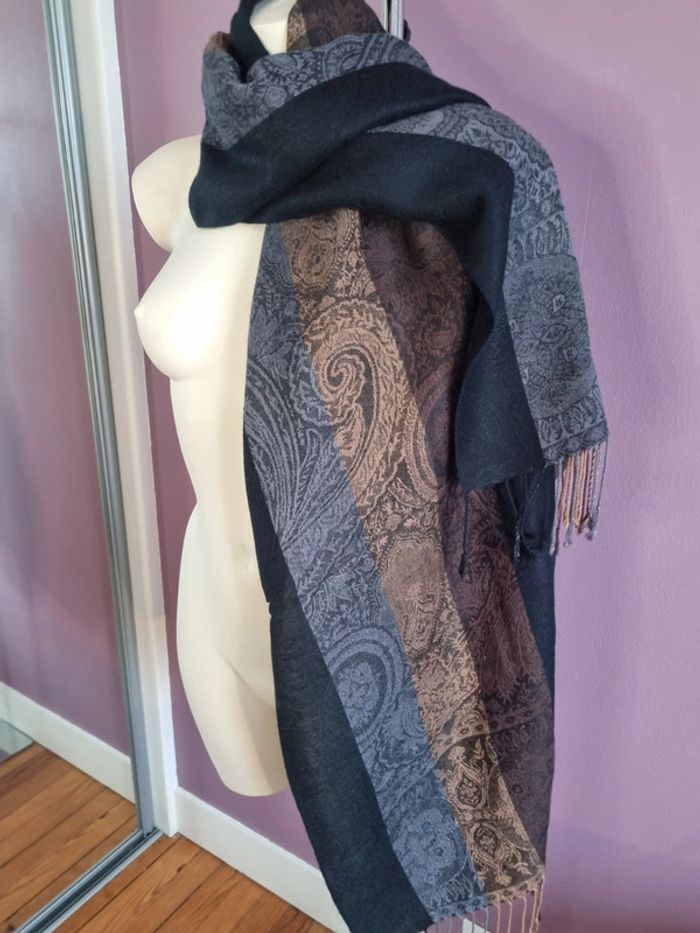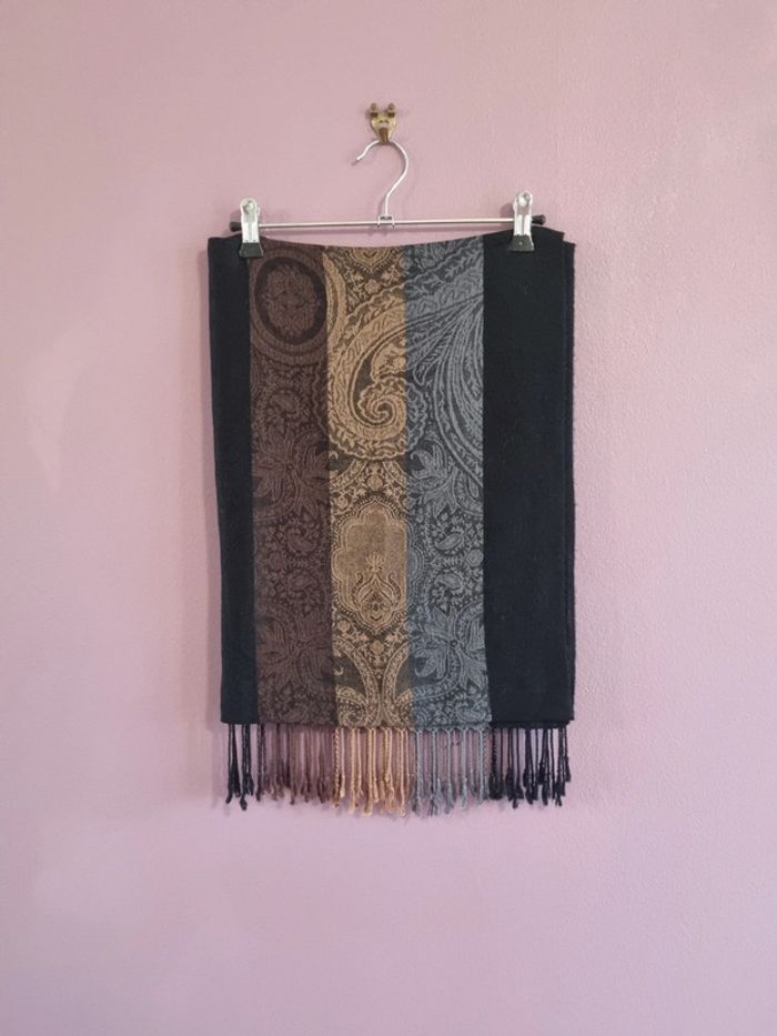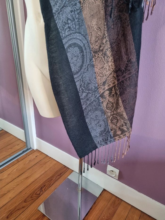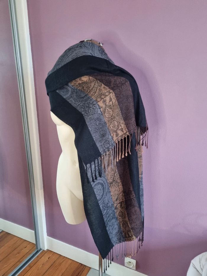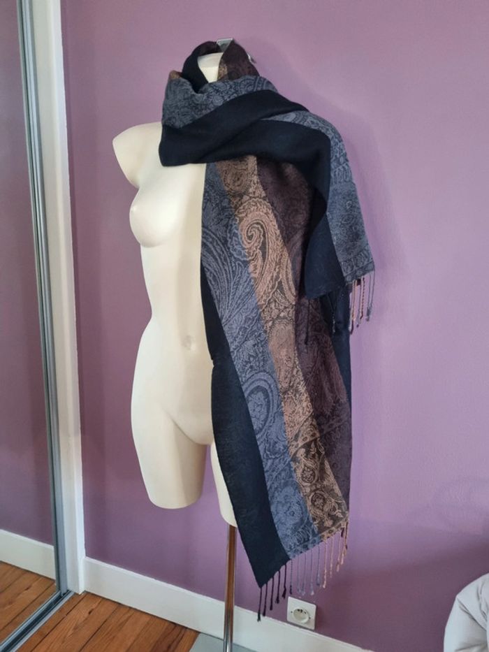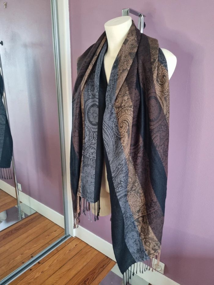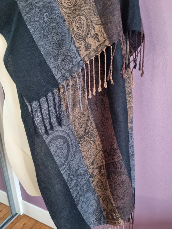 Magnifique grande écharpe en laine et coton vintage En parfait état Couleurs : noir, marron, gris beige Dimensions : - Longueur : 192 cm - Largeur : 72 cm Année '80