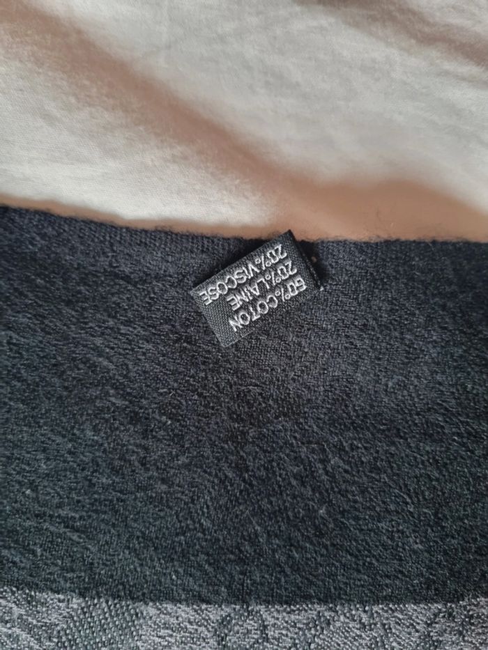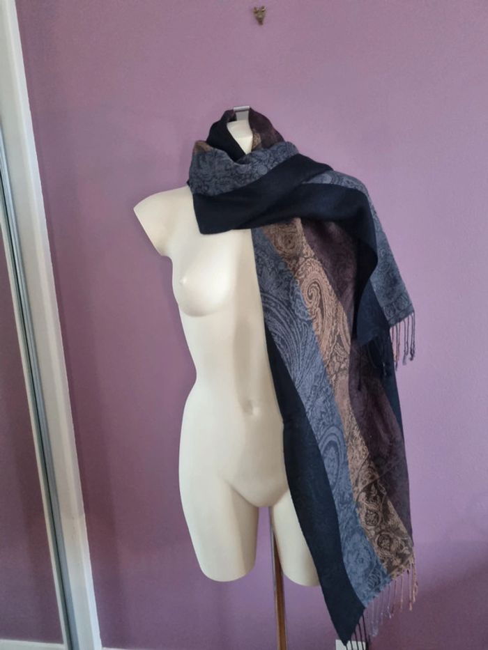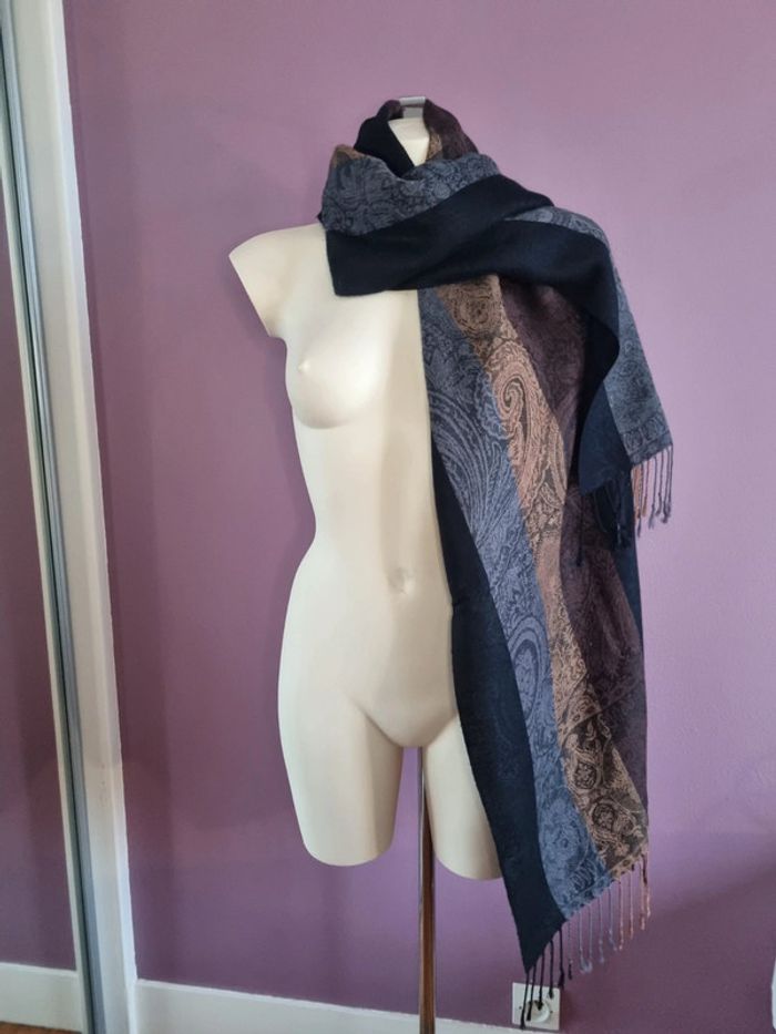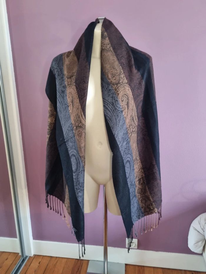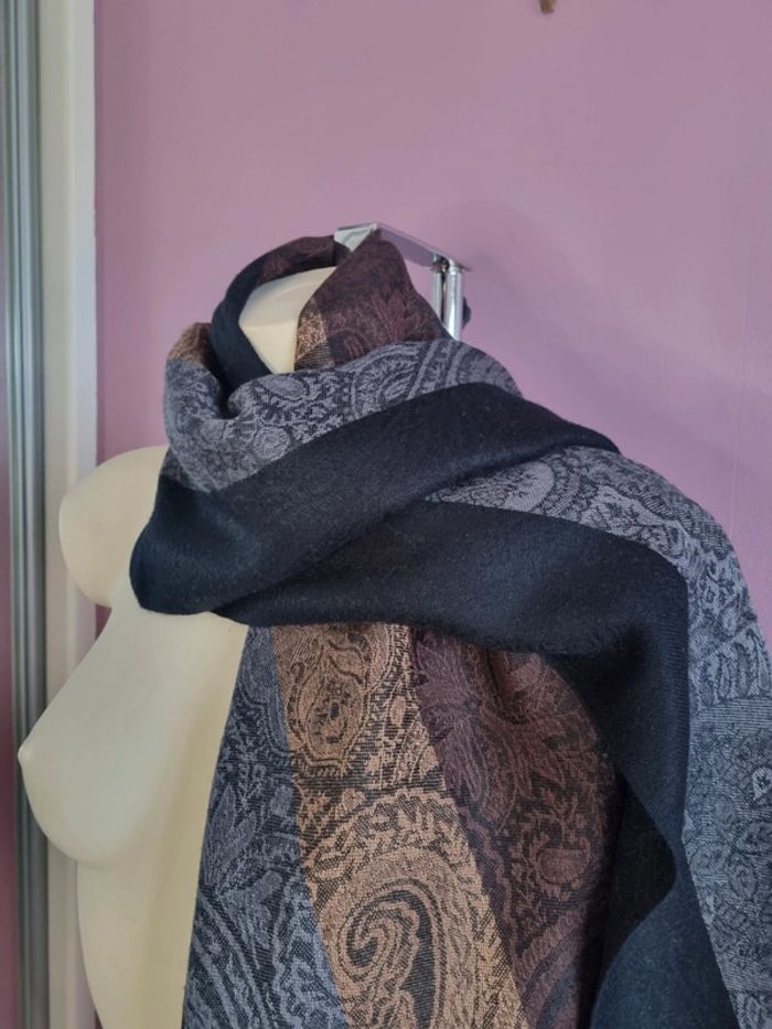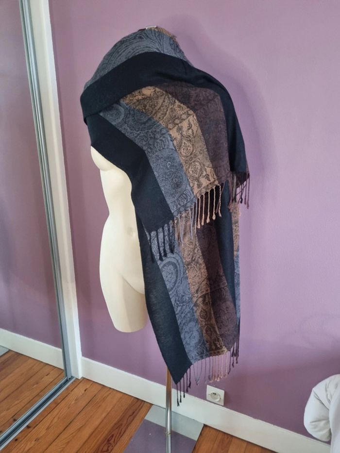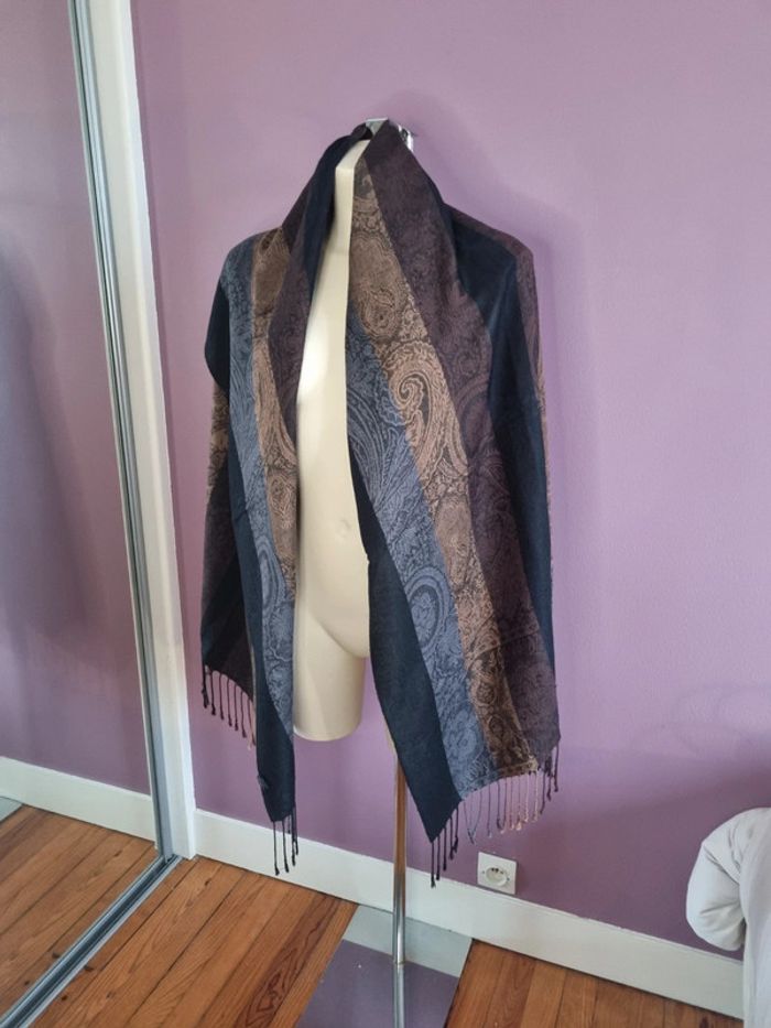Magnifique grande écharpe en laine et coton vintage En parfait état Couleurs : noir, marron, gris beige Dimensions : - Longueur : 192 cm - Largeur : 72 cm Année '80