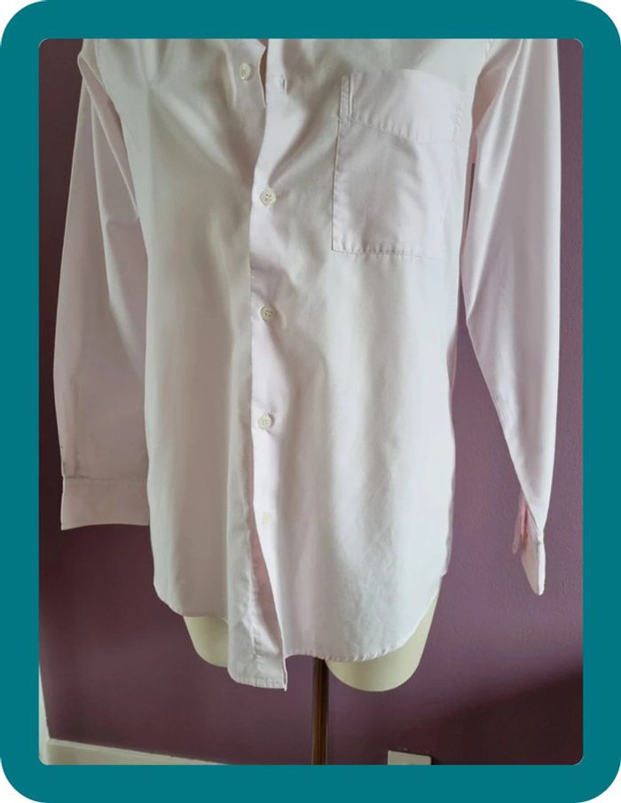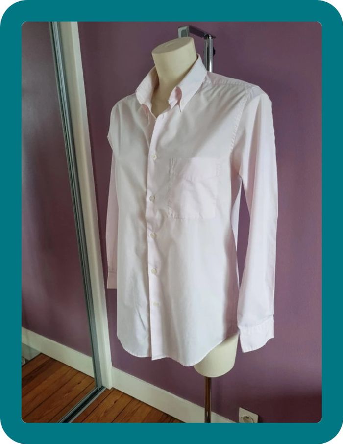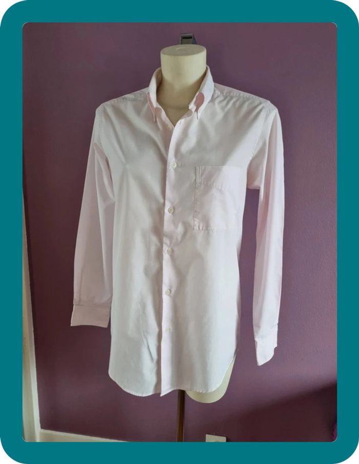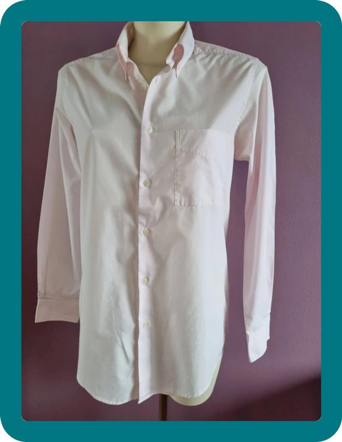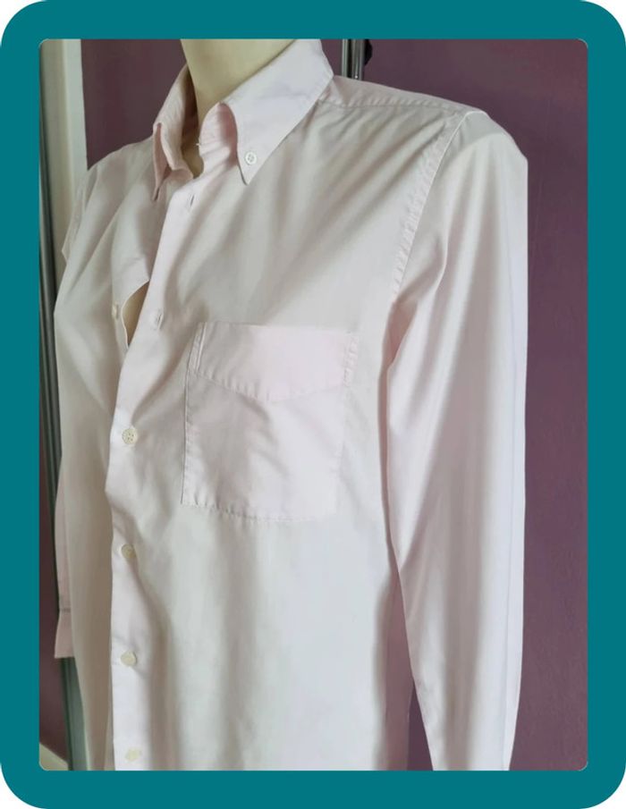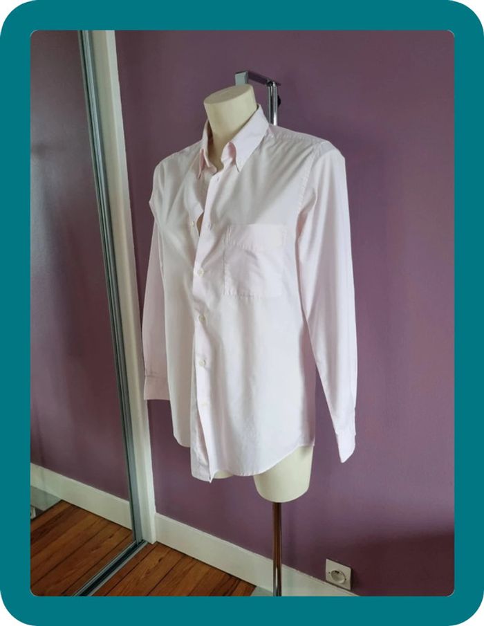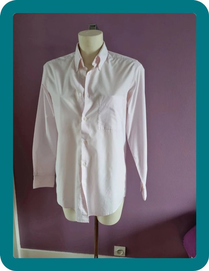 Chemise rose pâle vintage Année '90 En parfait Boutons de couleur blanc crème 35 % de coton Unisexe, taille 40 pour femme, 38 pour homme Dimensions : - Largeur épaules : 44 cm - Longueur dos : 73 cm - Largeur aiselles : 52 cm - Largeur taille : 52 cm