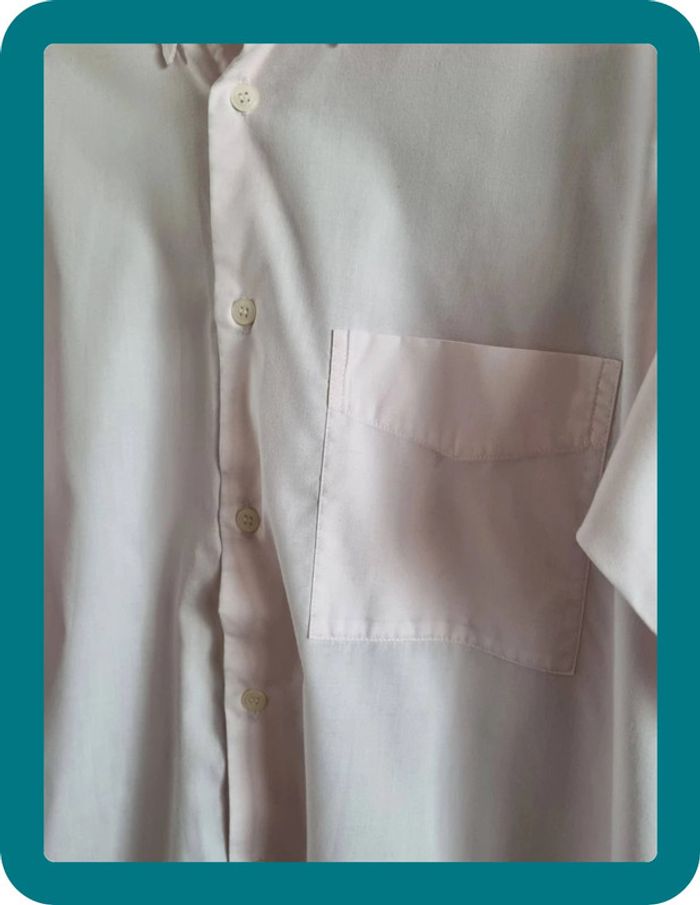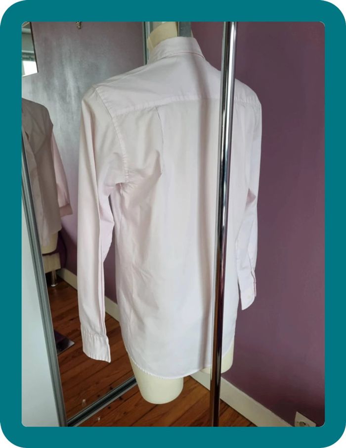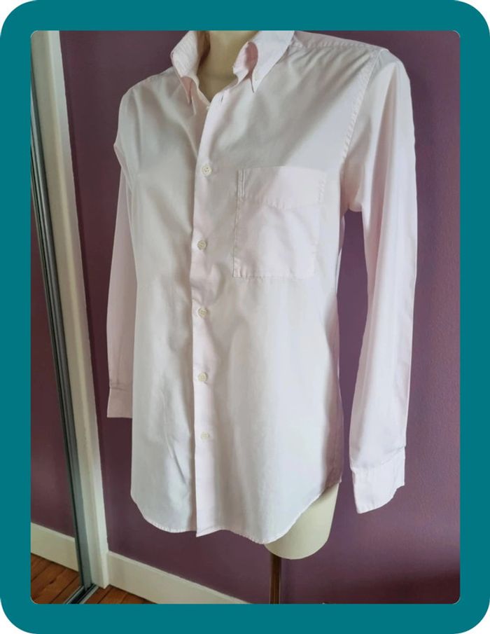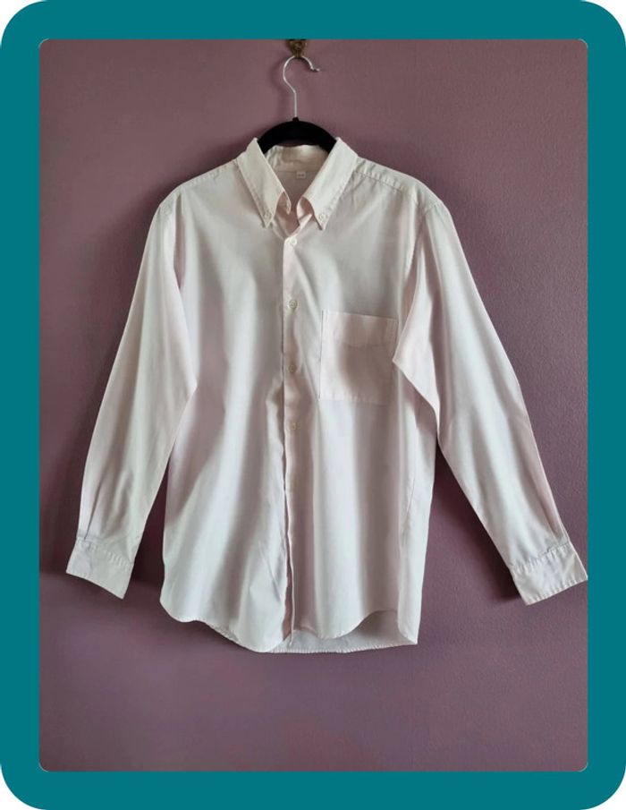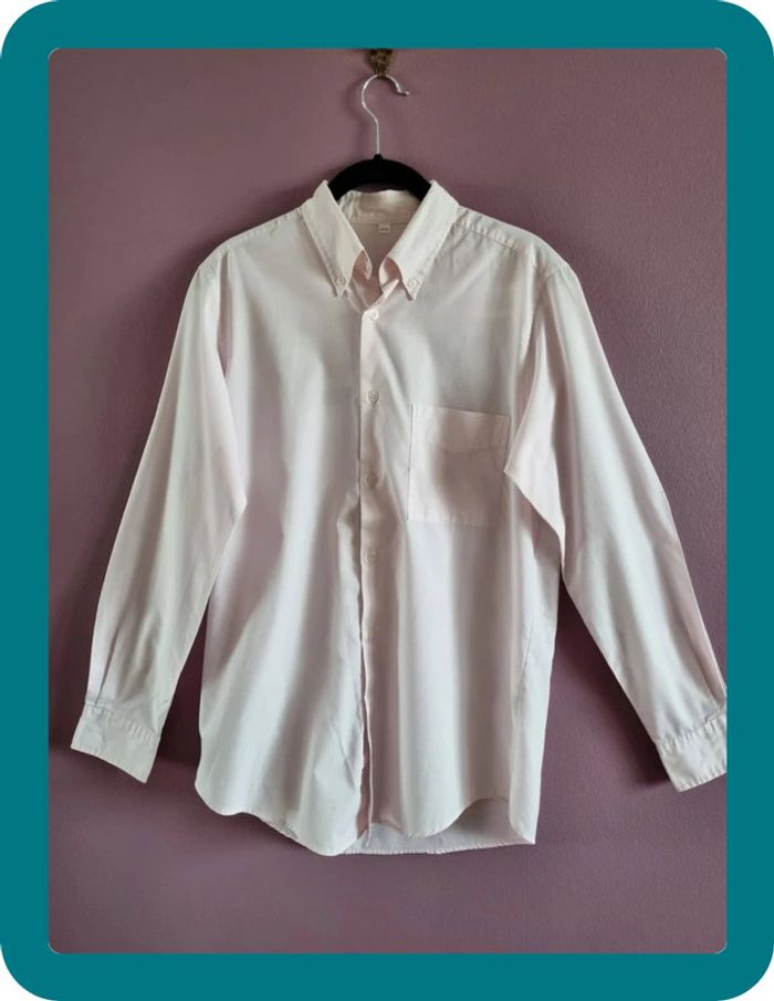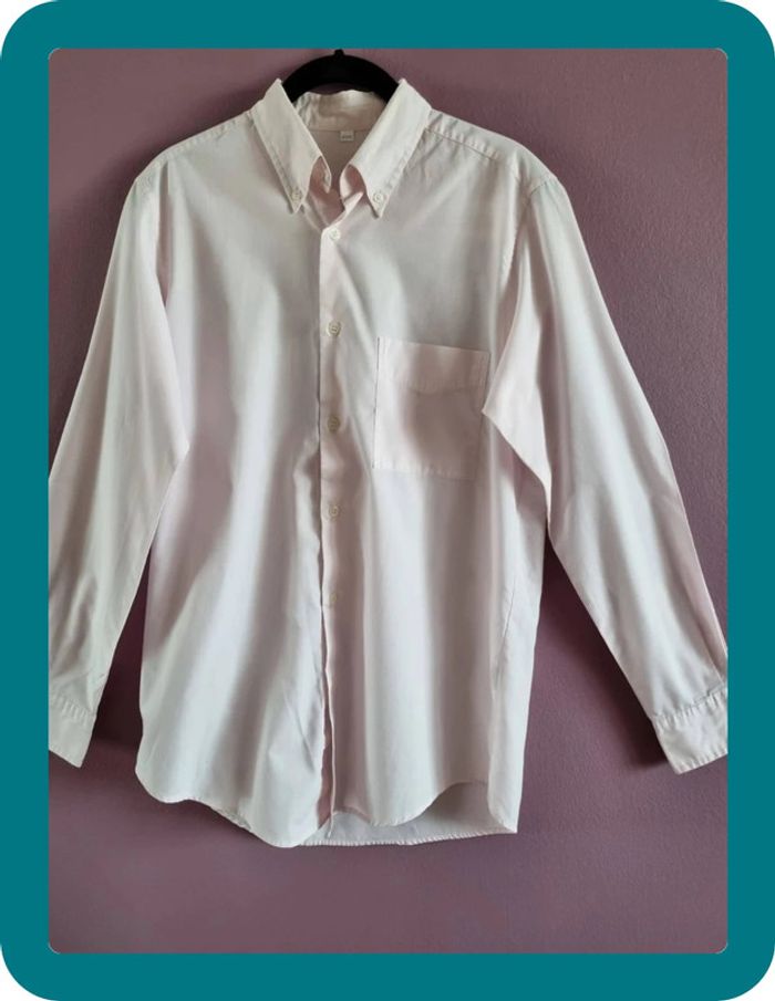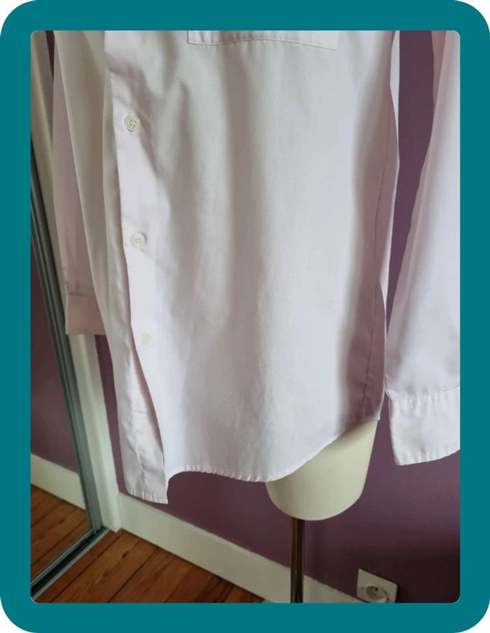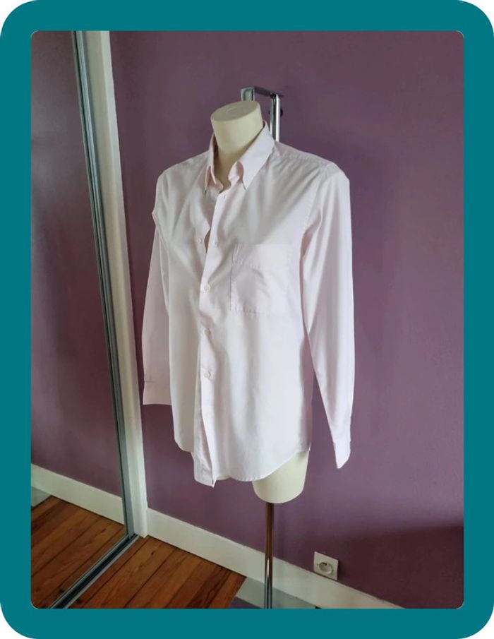 Chemise rose pâle vintage Année '90 En parfait Boutons de couleur blanc crème 35 % de coton Unisexe, taille 40 pour femme, 38 pour homme Dimensions : - Largeur épaules : 44 cm - Longueur dos : 73 cm - Largeur aiselles : 52 cm - Largeur taille : 52 cm