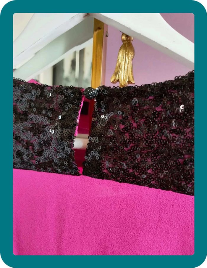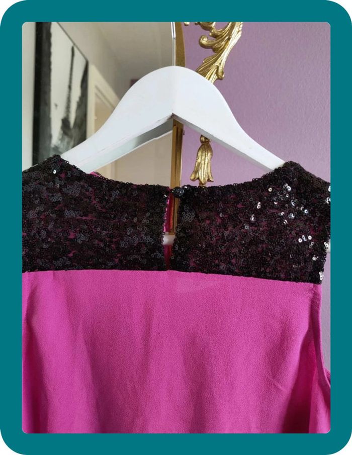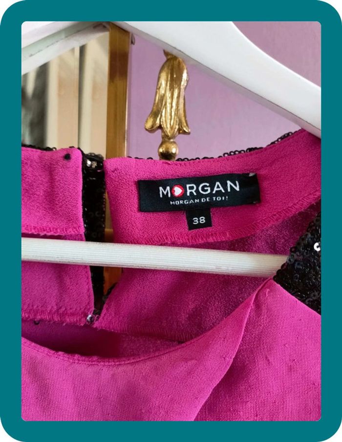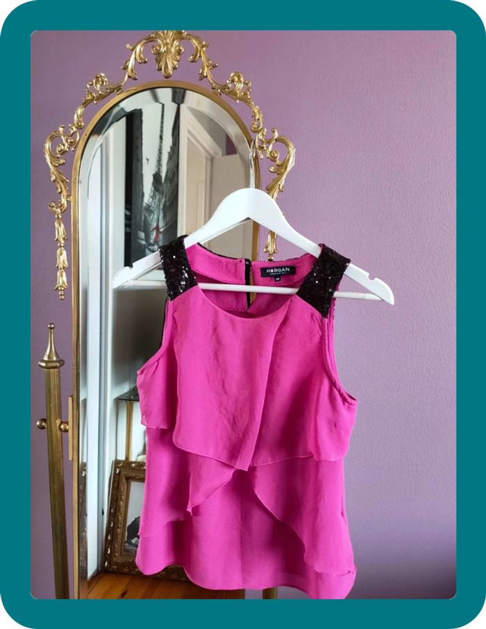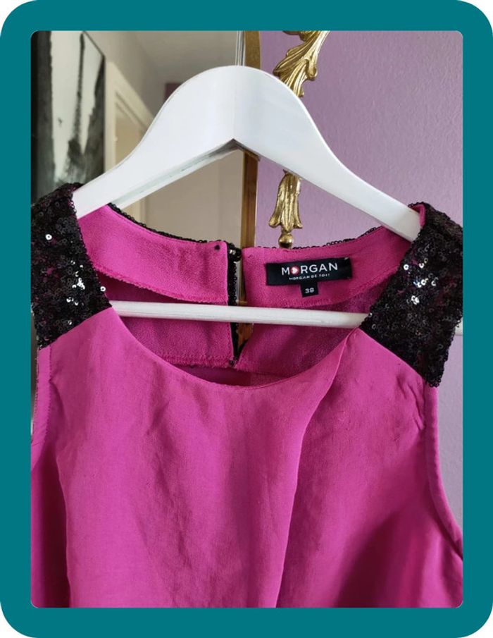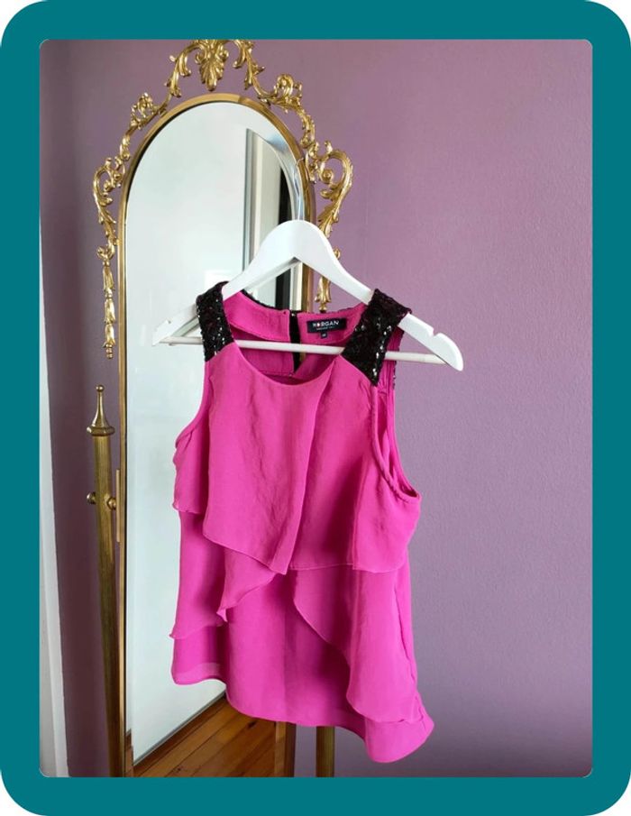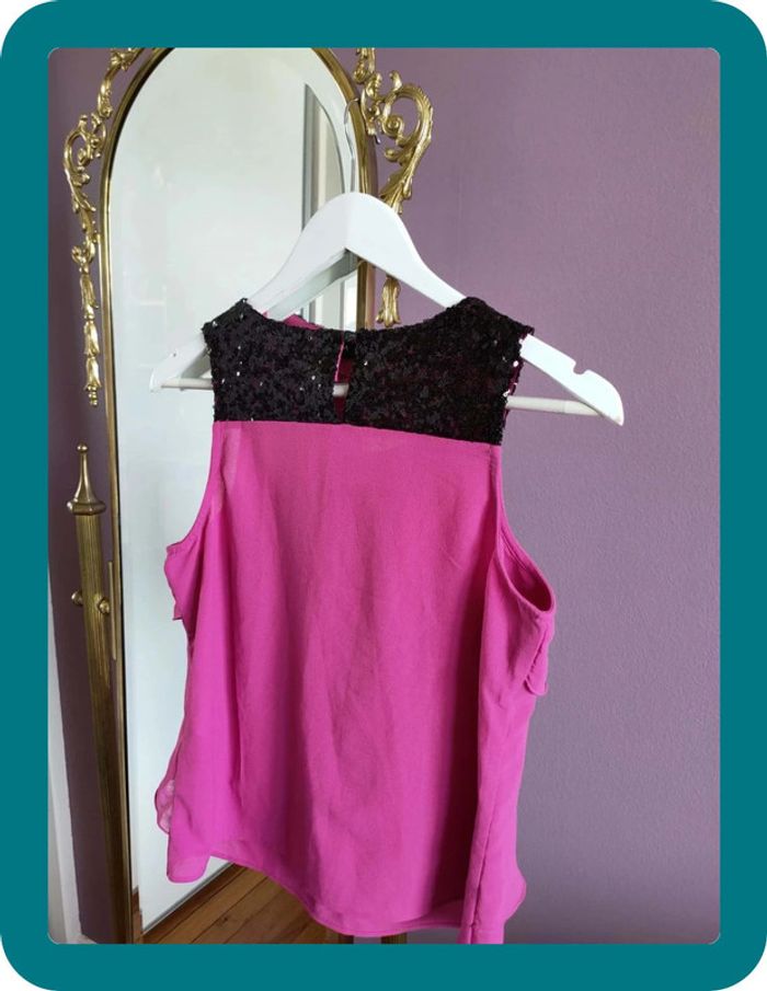 Magnfique débardeur hyper classe de la marque Morgan Il est neuf jamais porté Taille 38 Strasse sur le haut du débardeur Volant sur le devant Rose fushia et noir