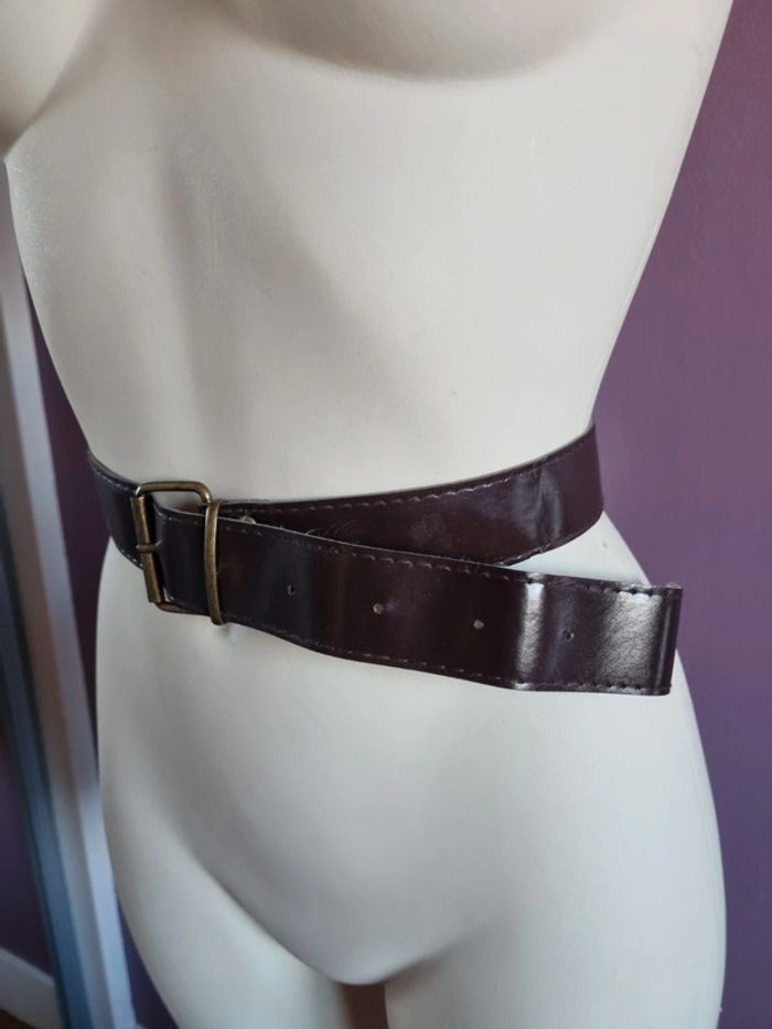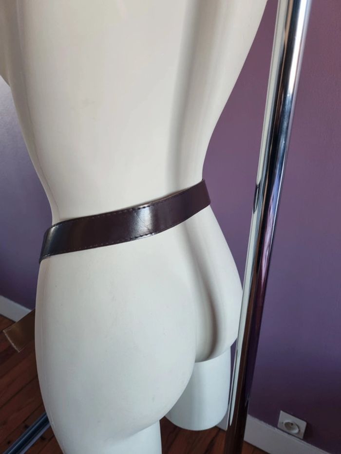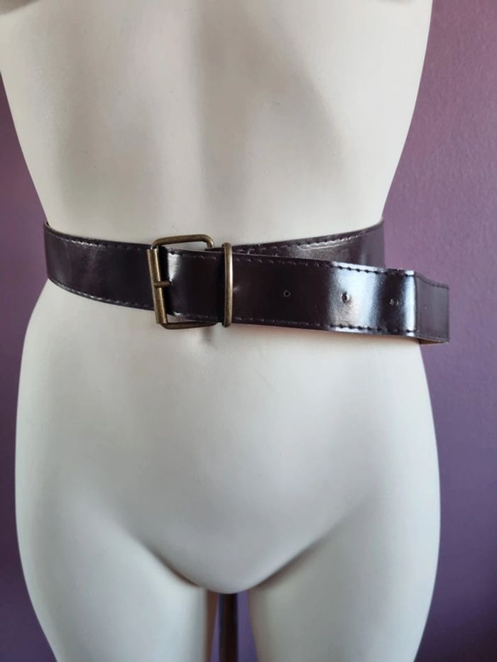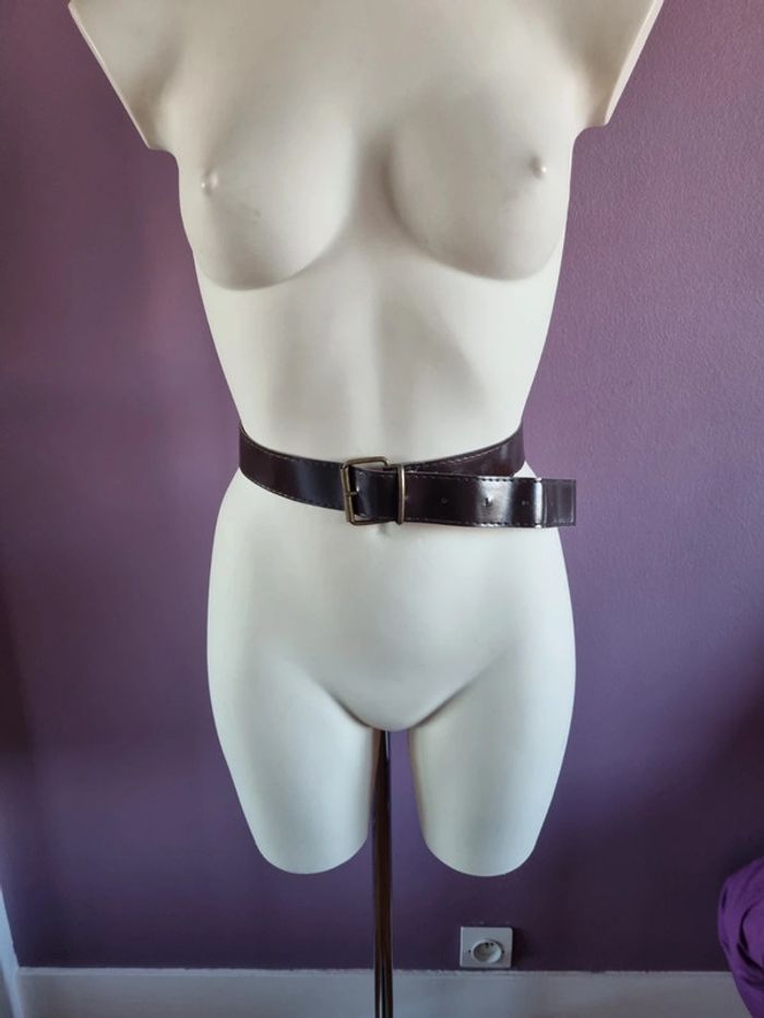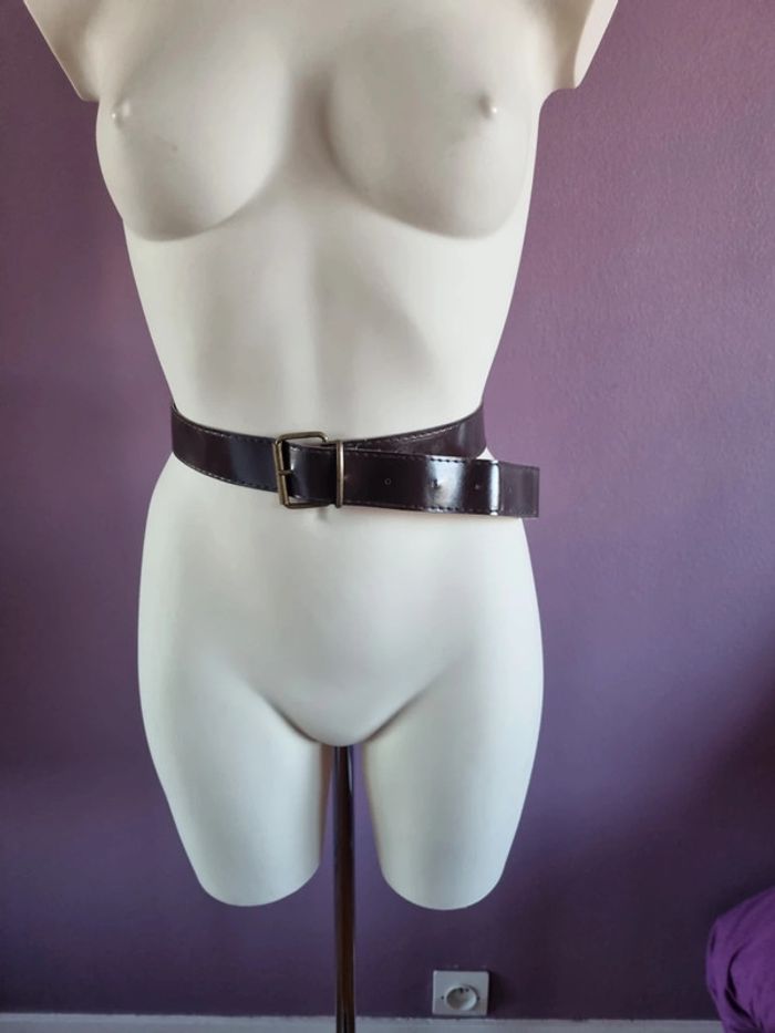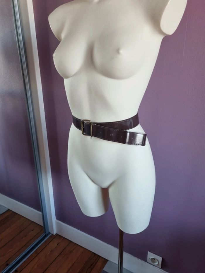 Magnifique ceinture en Skaï vintage De couleur marron foncé à l'extérieur marron clair à l'intérieur Accroche couleur bronze En très bon état Dimensions : - Largeur : 4,5 cm - Longueur total : 102 cm - Longueur premier trou : 79 cm - Longueur dernier trou : 94 cm Année '80