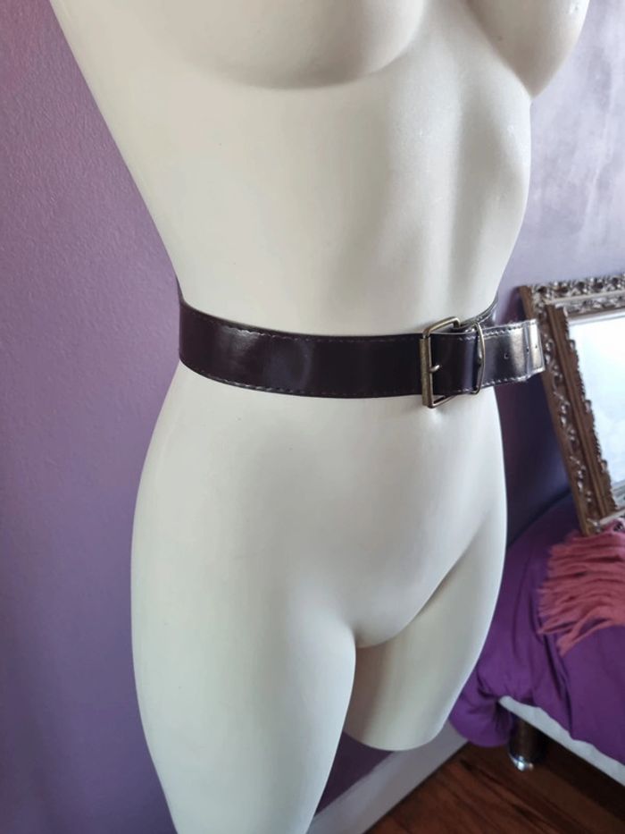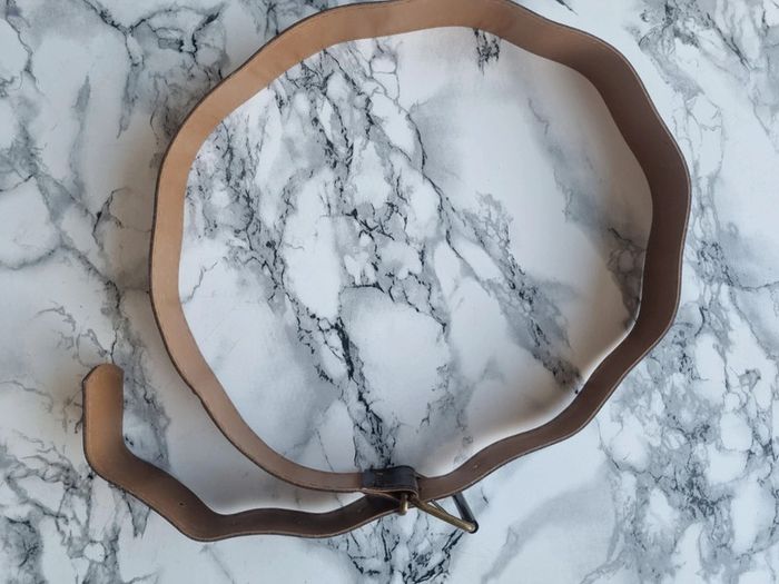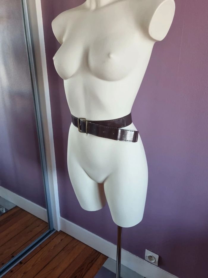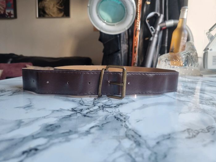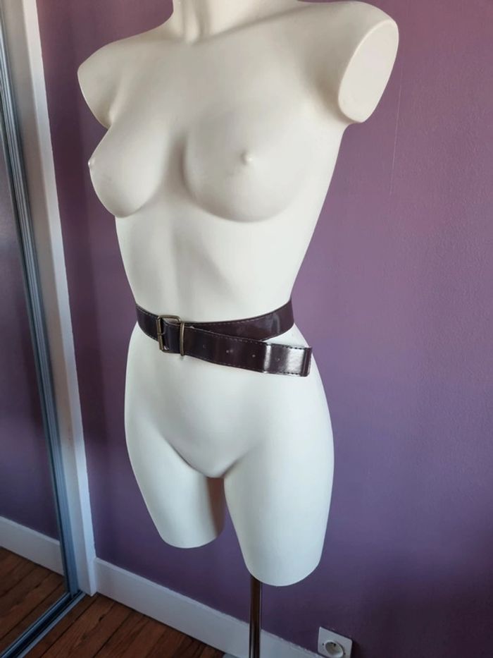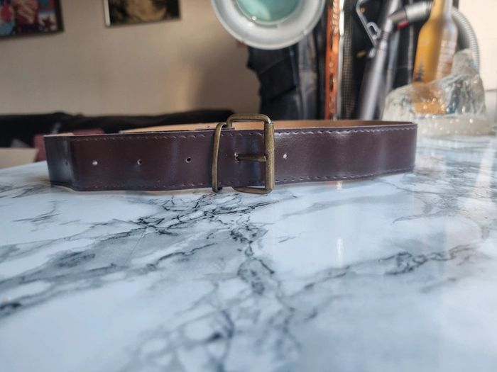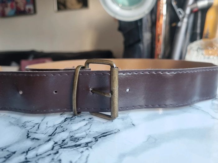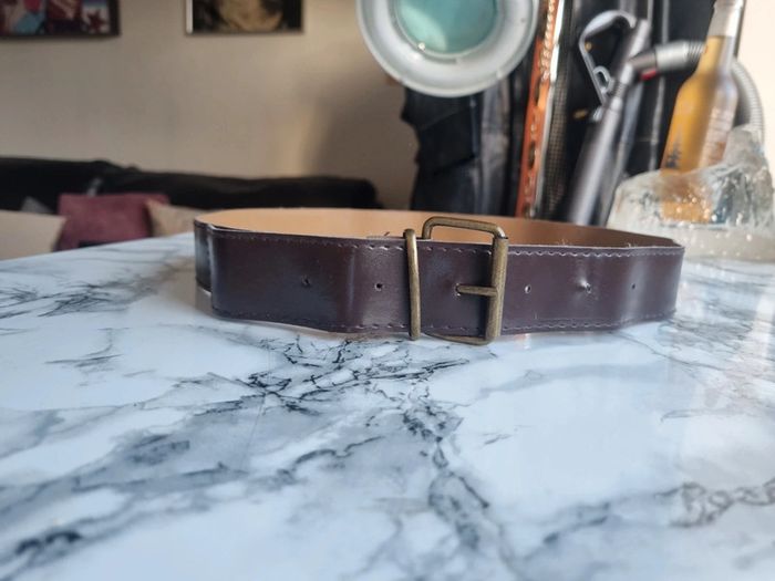 Magnifique ceinture en Skaï vintage De couleur marron foncé à l'extérieur marron clair à l'intérieur Accroche couleur bronze En très bon état Dimensions : - Largeur : 4,5 cm - Longueur total : 102 cm - Longueur premier trou : 79 cm - Longueur dernier trou : 94 cm Année '80