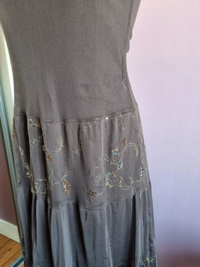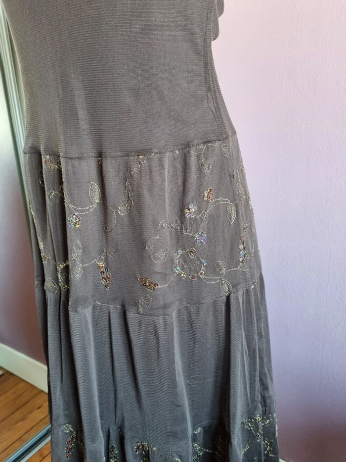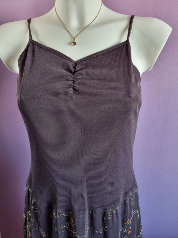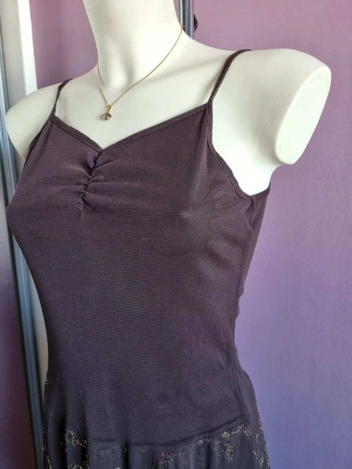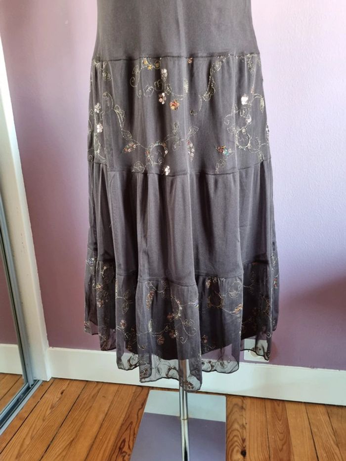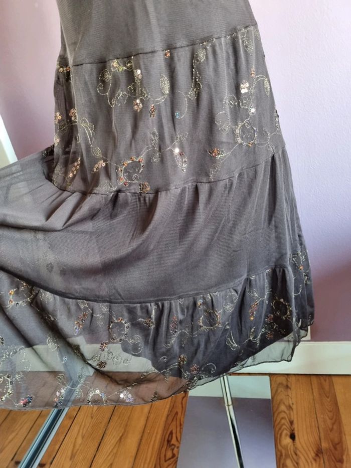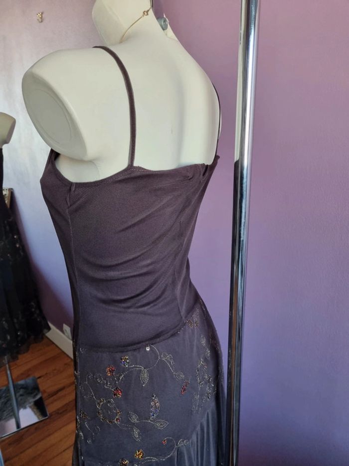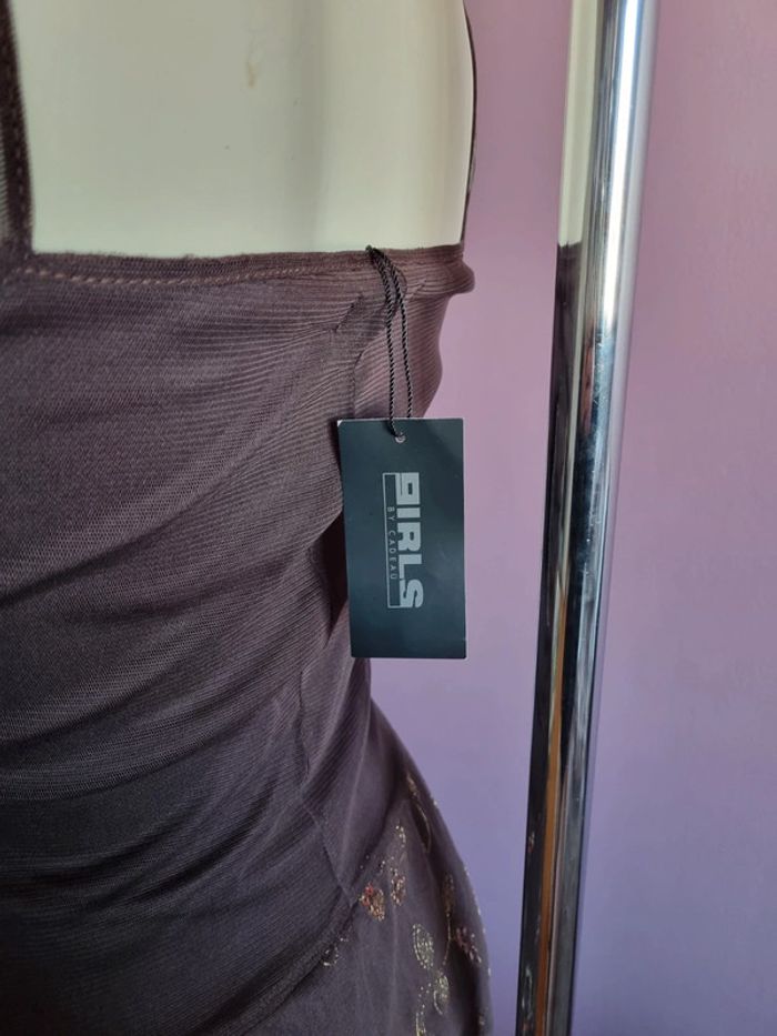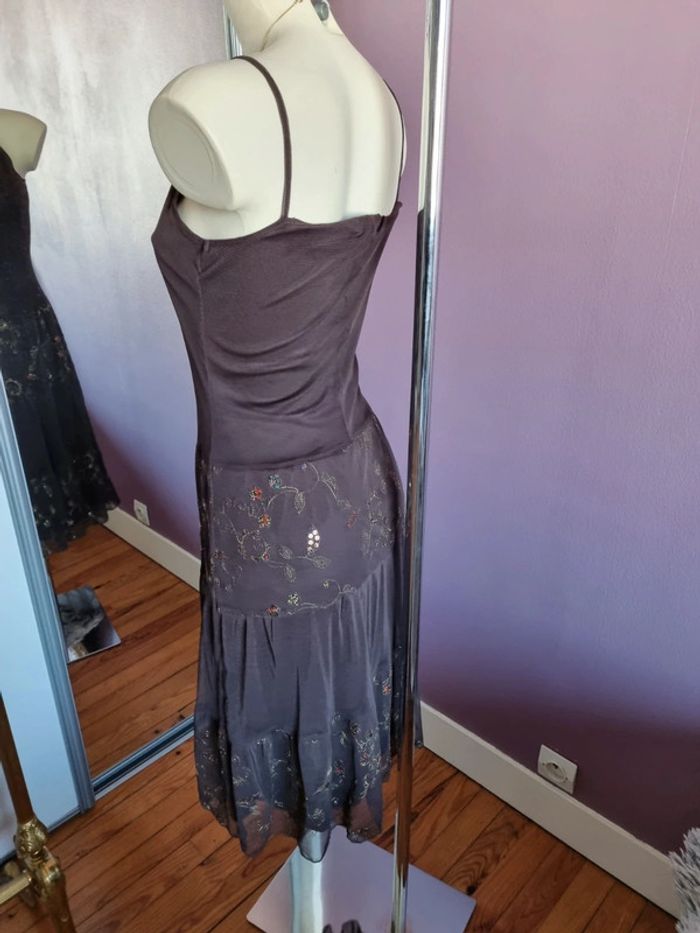 Magnifique robe de couleur marron Y2k Elle est neuve avec étiquette Taille indiqué 16 ans mais conviens pour un S ( voir les dimensions) Jolie strasse sur le volant Pars en évasé Elle est fluide Ressere au niveau de la poitrine Dimensions : - Longueur dos ( sans bretelle ) : 97 cm - Largeur taille : 38 cm - Largeur aiselles : 39 cm