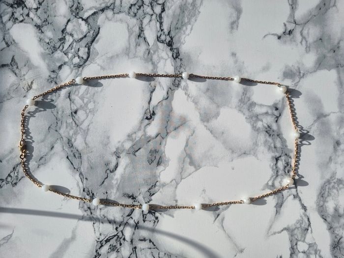 Magnifique collier doré à perles blanche En bon état Année '80 Dimensions : - Longueur total : 63 cm - Largeur des perles : 0,5 cm
