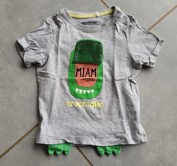 T-shirt manches courtes, de couleur gris avec motifs, de la marque Orchestra, taille 18 mois (81 cm), en très bon état. Article lavé pour la vente.