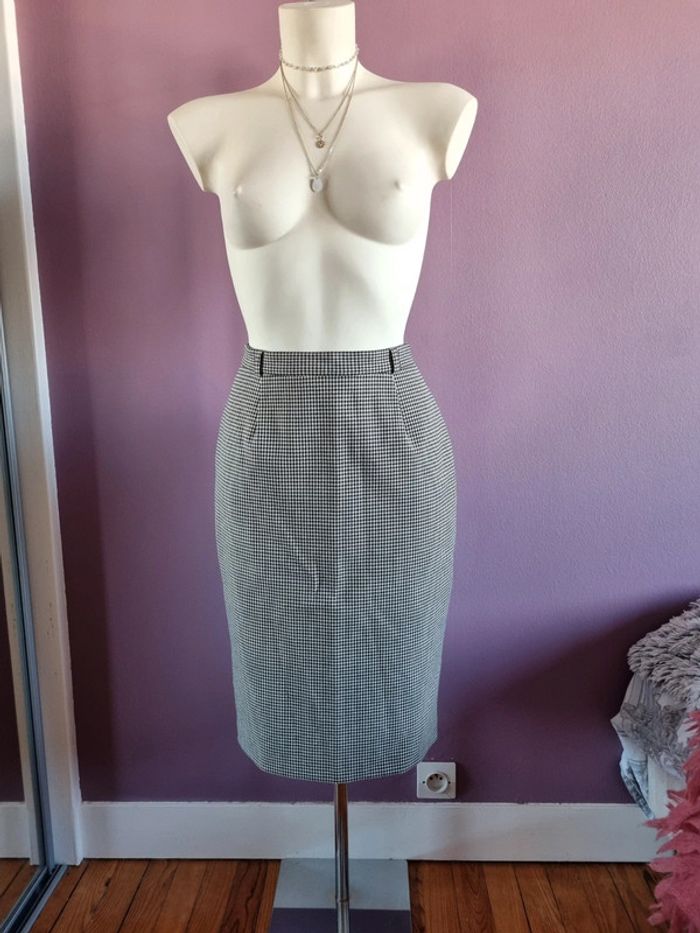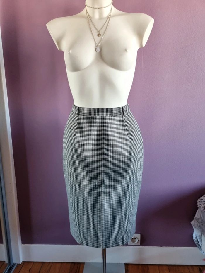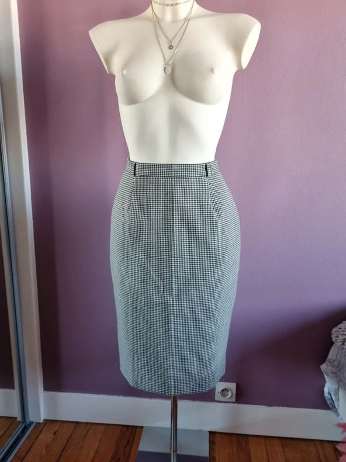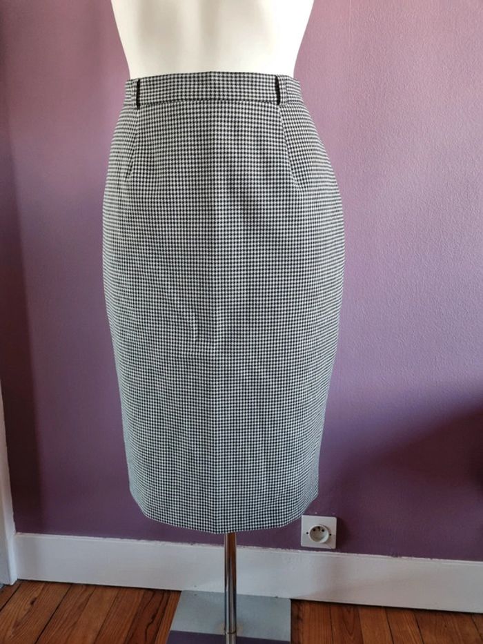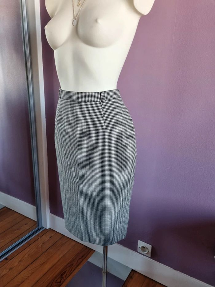 Magnifique jupe vichy Gérard Darel vintage 44% de laine Elle est mi longue Fente à l'arrière Passant pour mettre une ceinture Couleurs : noir et blanc En parfait état Taille indiqué 38 mais conviens mieux à un 36 à voir selon les dimensions Dimensions : - Longueur : 62 cm - Largeur taille : 34 cm Année '80