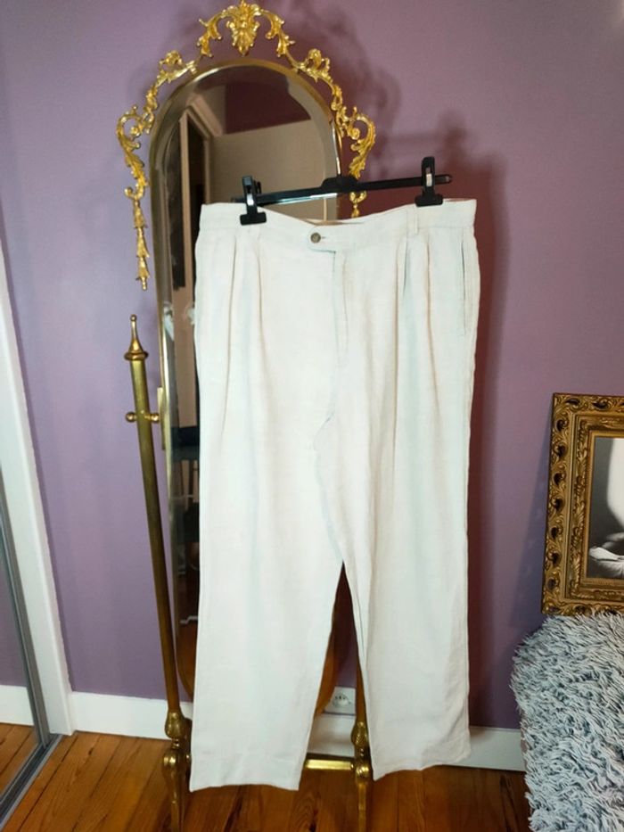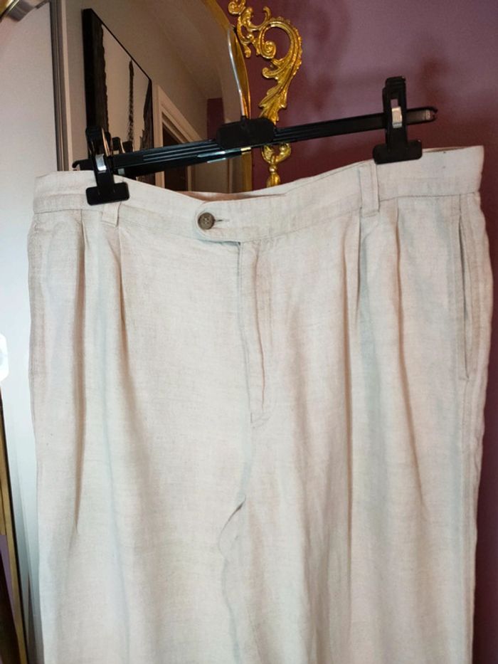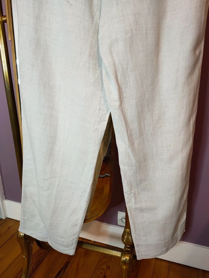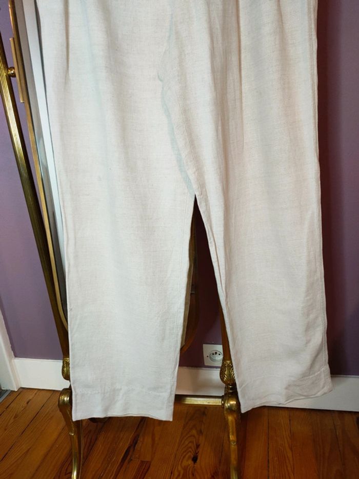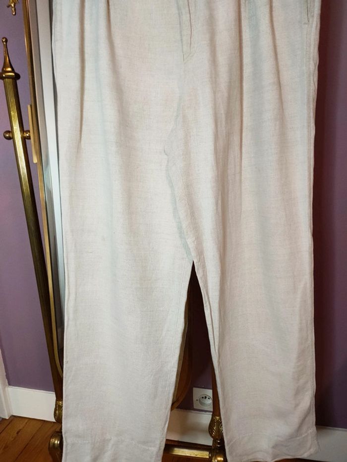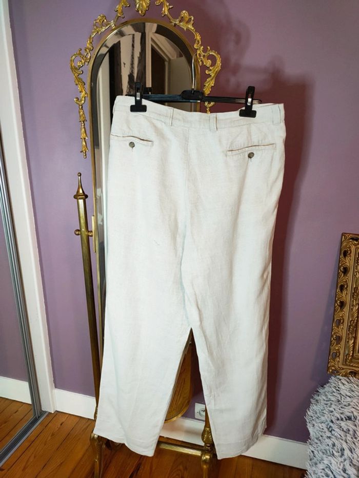 Magnifique pantalon en lin de la marque Devred Coupe droit 100% lin Couleur lin naturel Taille 3XL Dimensions : - Longueur : 111 cm - Largeur taille : 46 cm - Largeur hanche : 60 cm - Longueur entre jambe : 74 cm