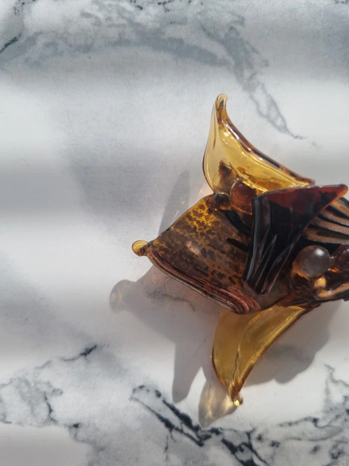 Magnifique broche vintage Forme abstraite Elle est en verre soufflé et plastique dur Dans les tons marron Il y a une partie en verre En bon état Dimensions : - Hauteur : 8 cm - Largeur : 6.5 cm Année '80