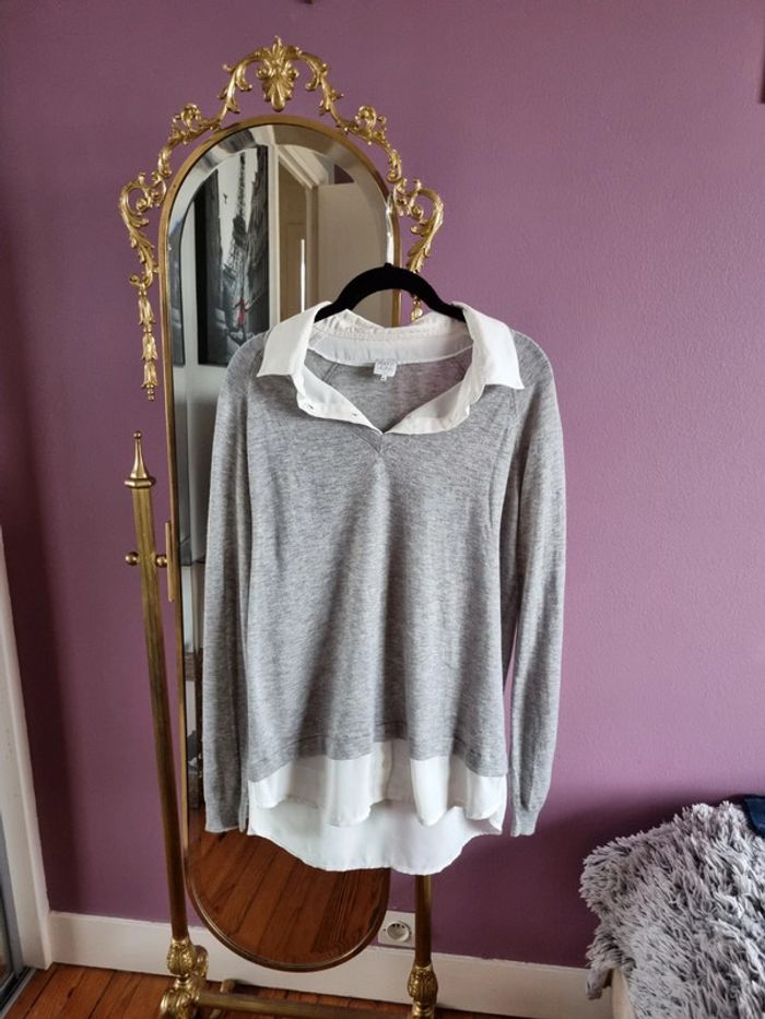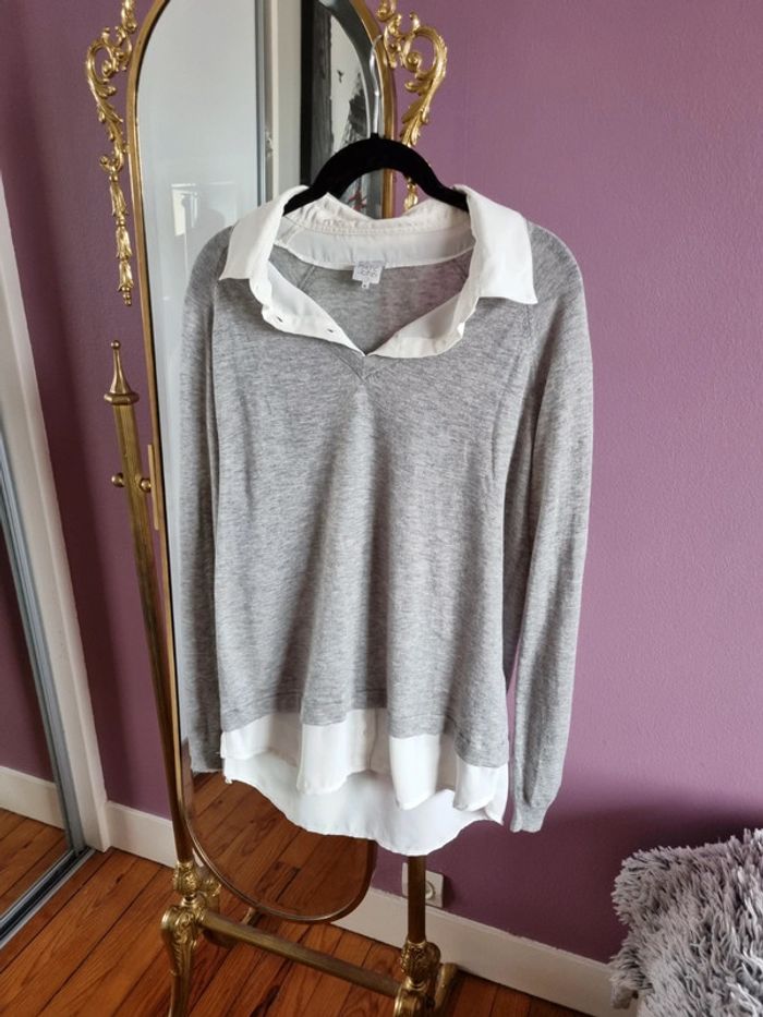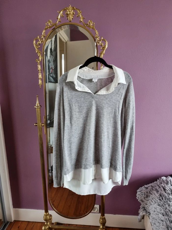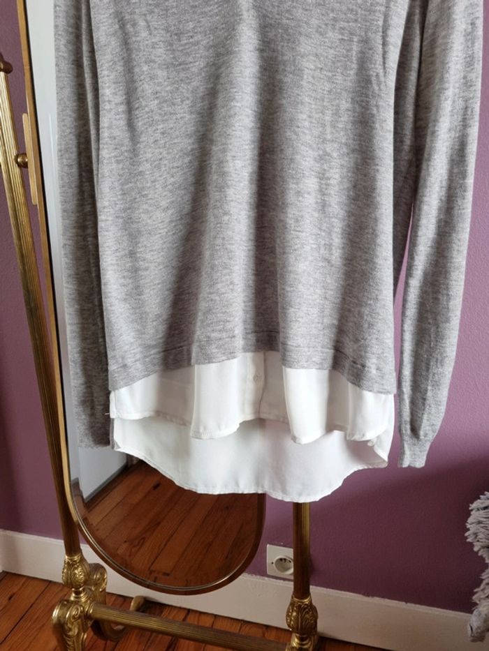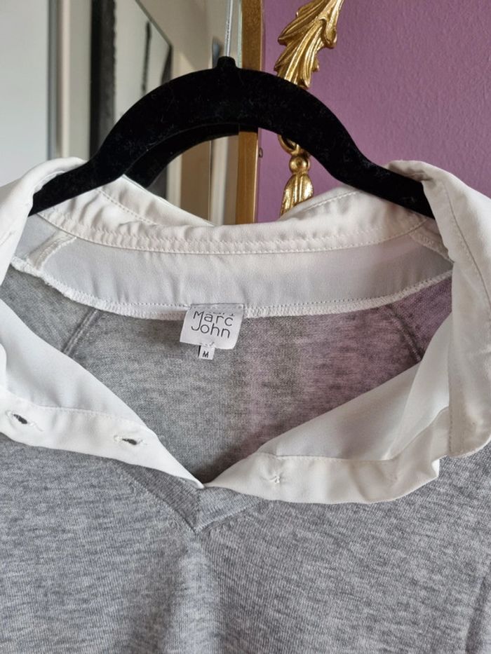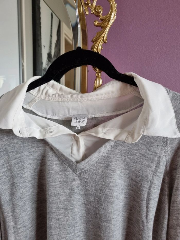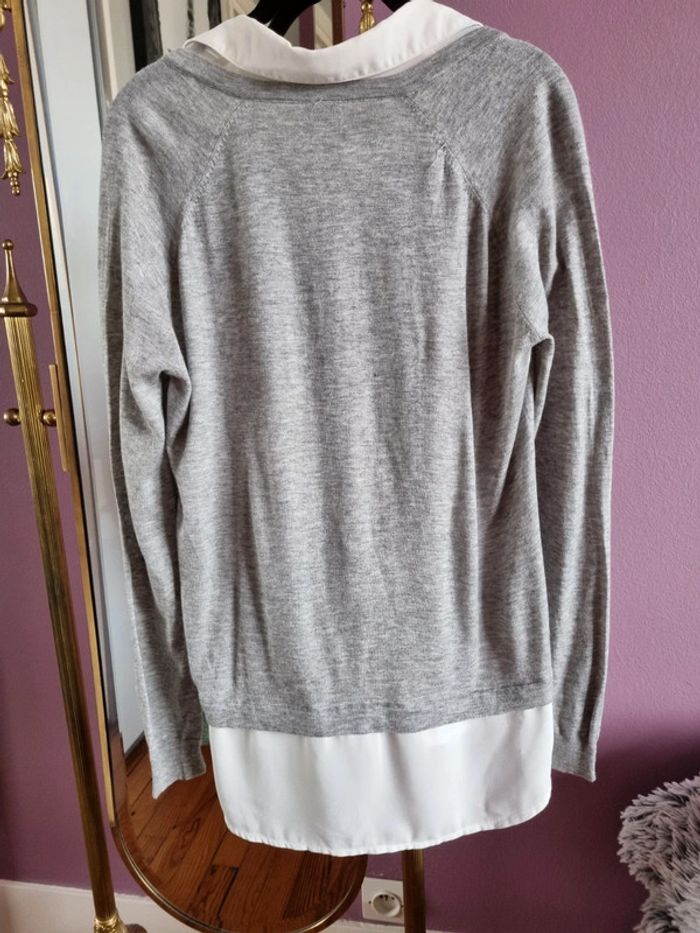 Magnifique pull gris avec chemise de la marque Karl Marc John Taille M 50% mohair Couleurs : gris et blanc En parfait état Dimensions : - Longueur dos : 75 cm - Largeur épaules : 53 cm - Largeur taille : 52 cm