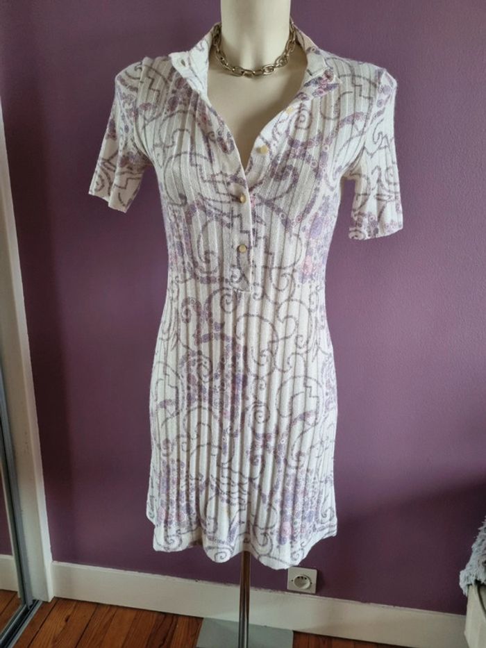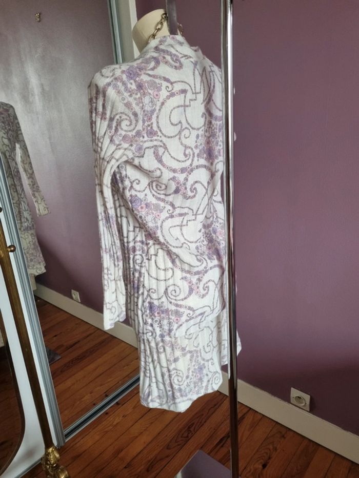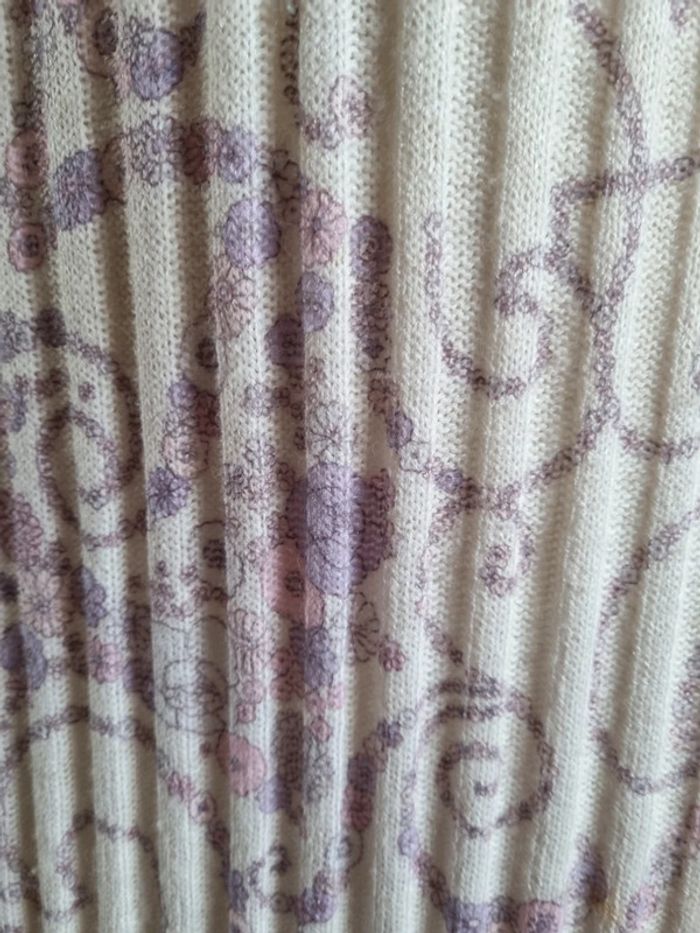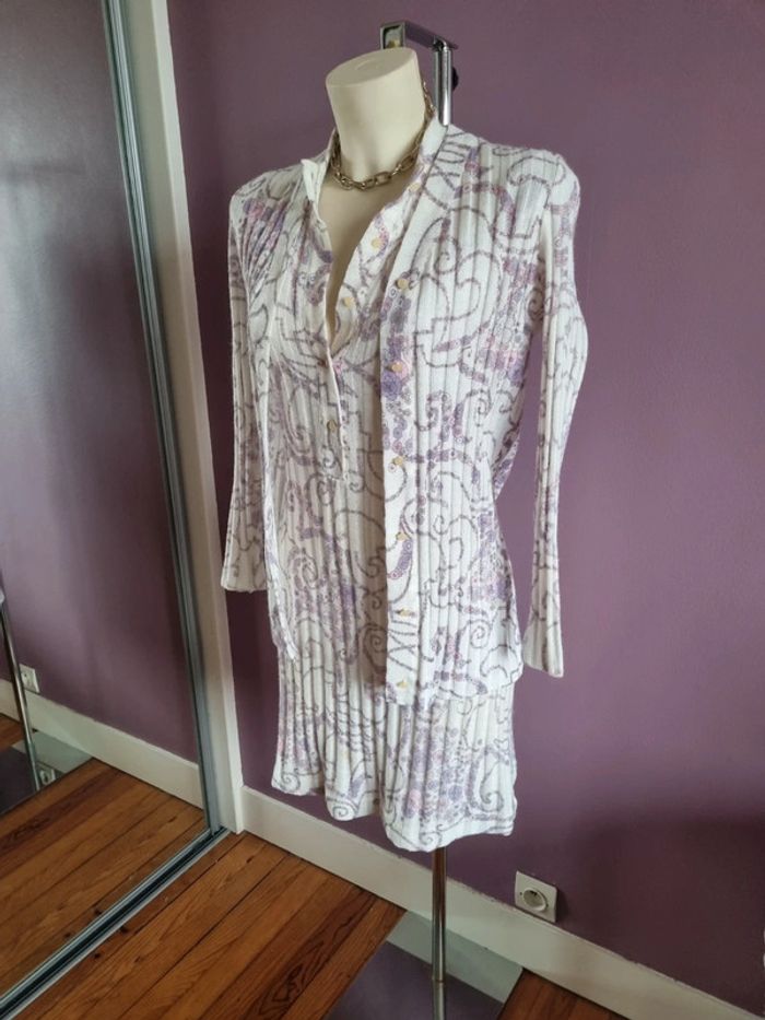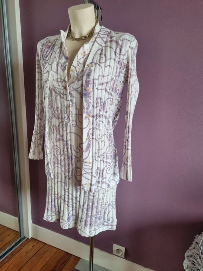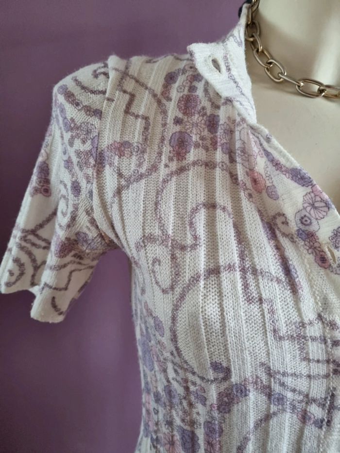 Magnifique ensemble avec une robe et un cardigan en maille vintage Orné de fleurs sans les tons lilas 🌸 De couleur blanc L'ensemble est légèrement plissé ce qui donne une belle texture Bouton couleur ivoire mat Made in France 🇨🇵 En parfait état Année '70 Taille S-M Dimensions de la robe fermé : - Longueur dos : 89 cm - Largeur taille : 40 cm - Largeur épaules : 38 cm Dimensions du cardigan fermé : - Longueur dos : 68 cm - Largeur taille : 39 cm - Largeur épaules : 40 cm