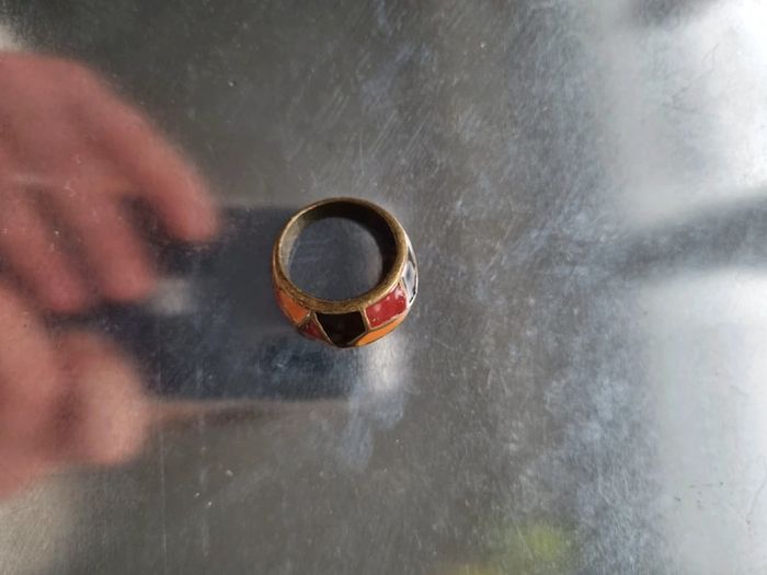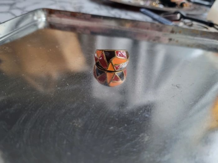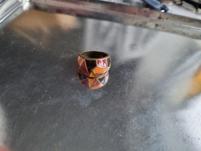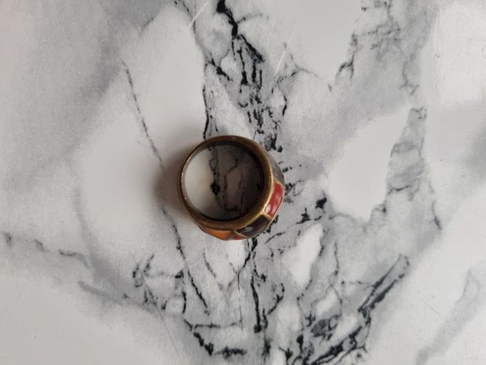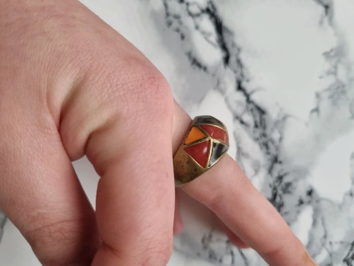 Magnifique bague en métal couleur bronze Motif géométrique Vintage datant des année '70 En parfait état Couleurs : marrons, rouge et orangé Circonférence : 2 cm