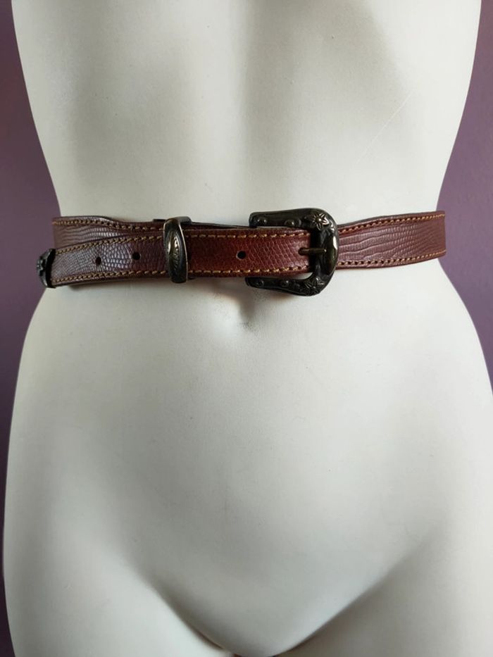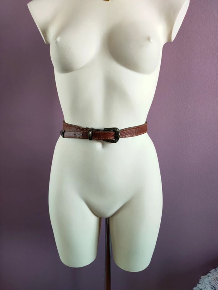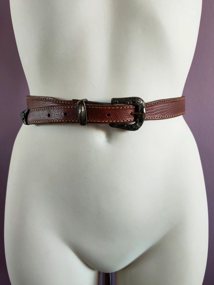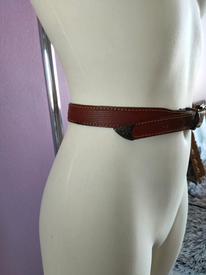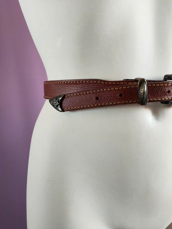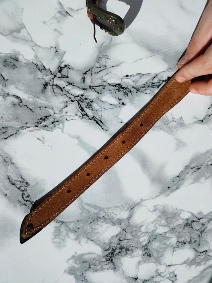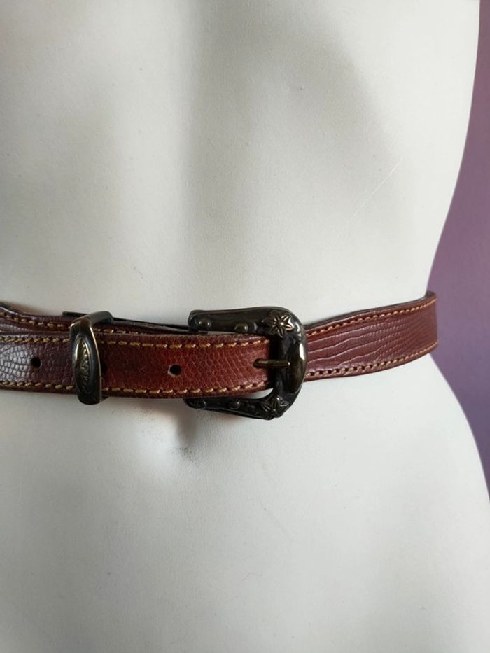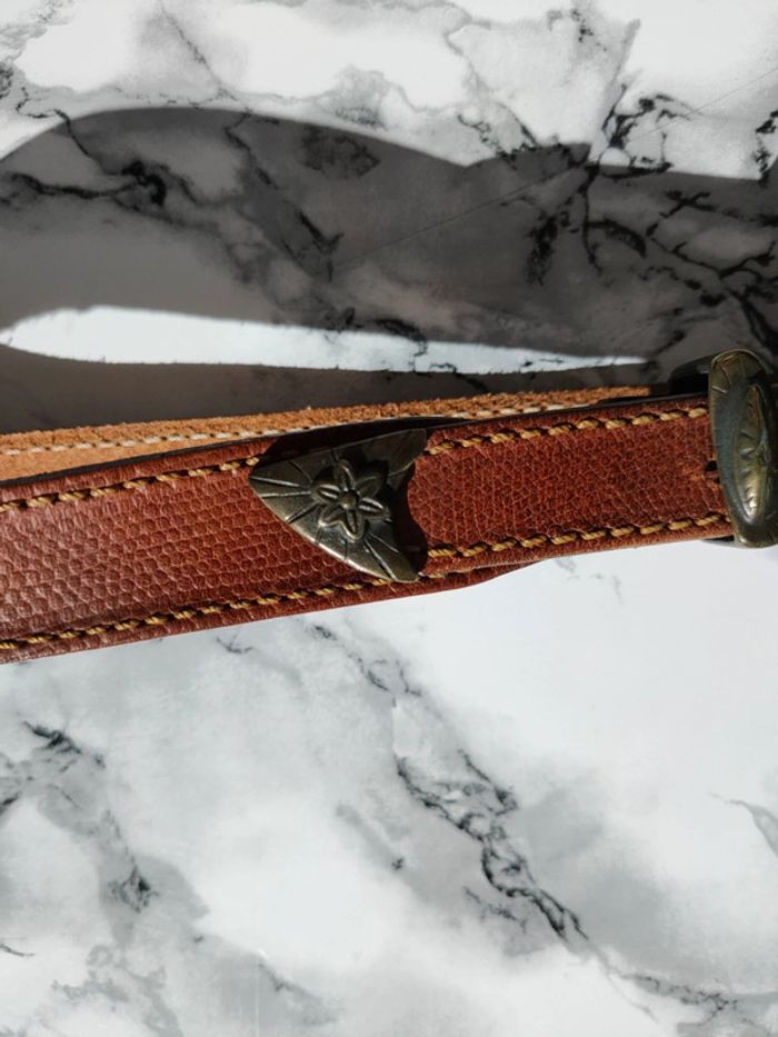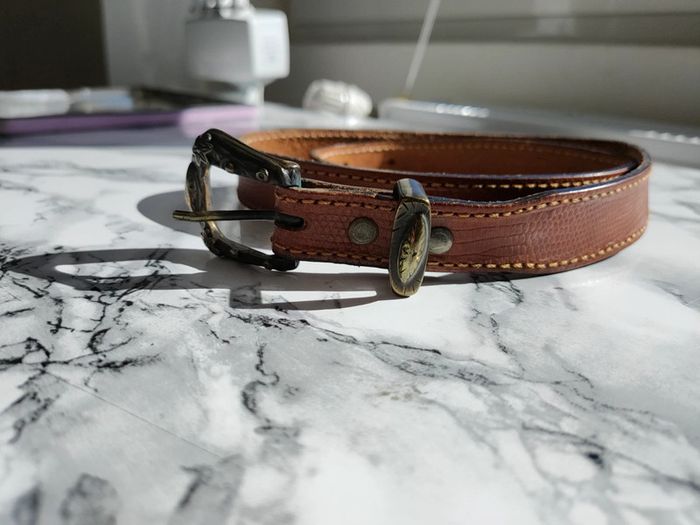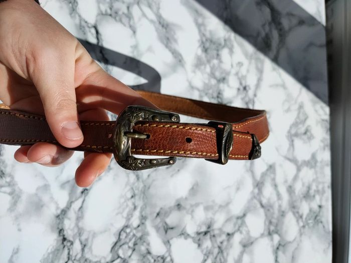 Magnfique ceinture vintage en cuir Made in France En parfait état Elle est de couleur marron foncé Avec les attaches en bronze Dimensions : - Longueur maximun dernier trou : 83 cm - Longueur minimun premier trou : 74 cm - Largeur : 2,5 cm - Longueur total : 89 cm