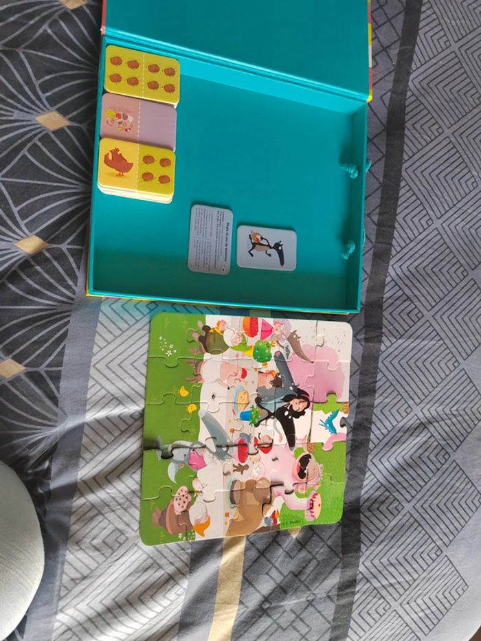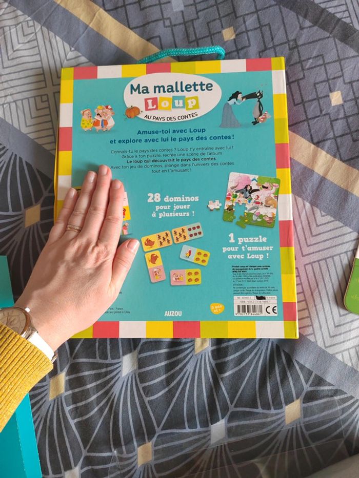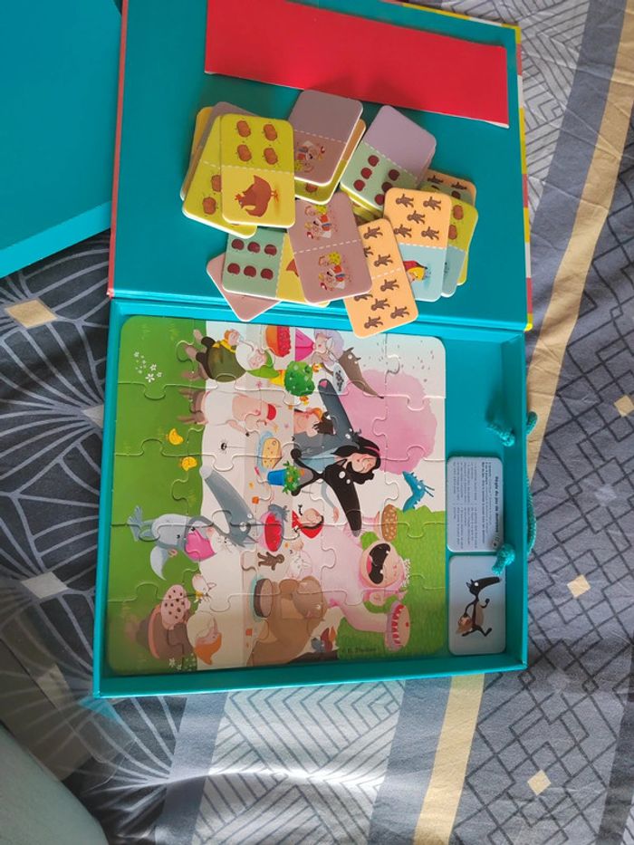 Il manque le livre, contient uniquement : - 1 jeu de 28 dominos (complet) - 1 Puzzle de 25 pièces (complet) Malette et contenu en très bon état. J'ai mis bon état sur l'annonce uniquement parce qu'il manque le livre.