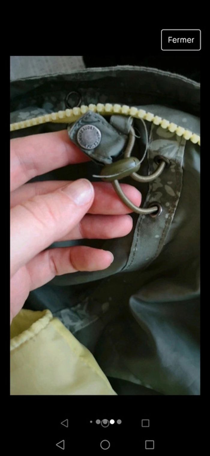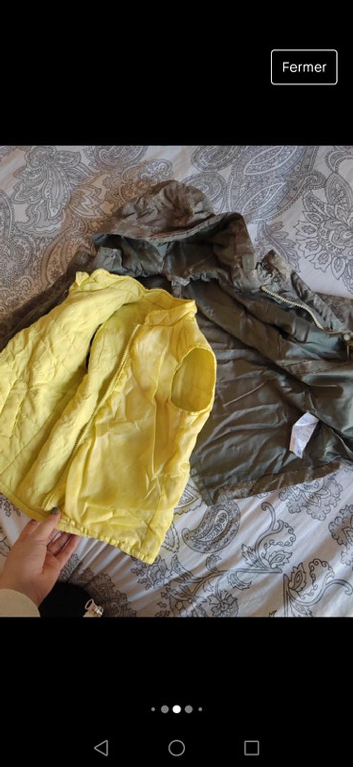 La doudoune sans manche peut se séparer du coupe vent. Ideal mi saison mais trop léger pour hiver Photo portée en dernière photo A été lavée parfait état. Fermetures éclairs OK pas de trou. Petit embout pour fermer le zip cassé (voir photo) mais n'empêche pas l'utilisation normale du manteau. La taille se resserre si besoin voir photos