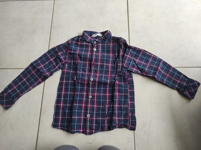 Chemise à carreaux bleu marine rouge blanc en très bon état . Marque H&M 7-8 ans . 100 % coton. Bcp d'autres habits photos possibles
