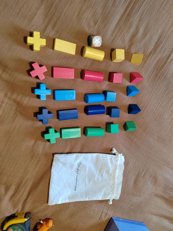 Jeu complet avec de pieces géométriques en bois et en couleur mais je n'ai plus la notice. A vous d'inventer les règles 😅