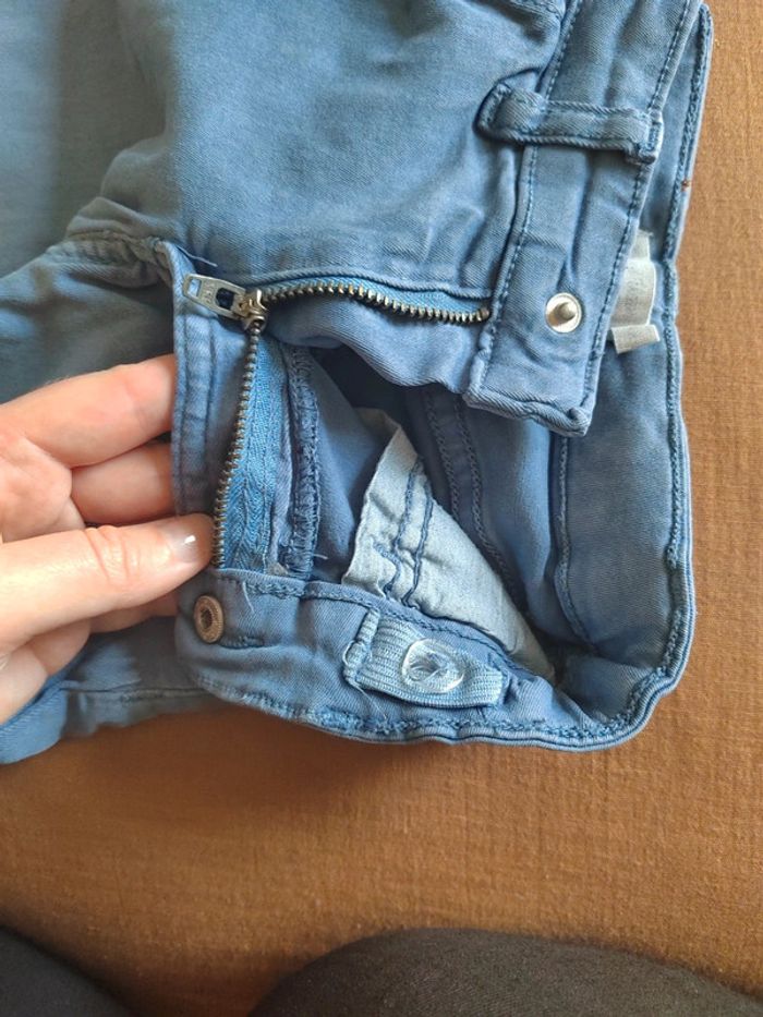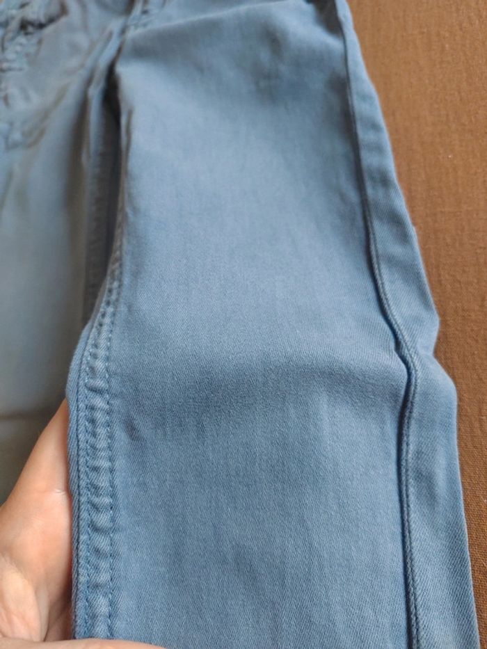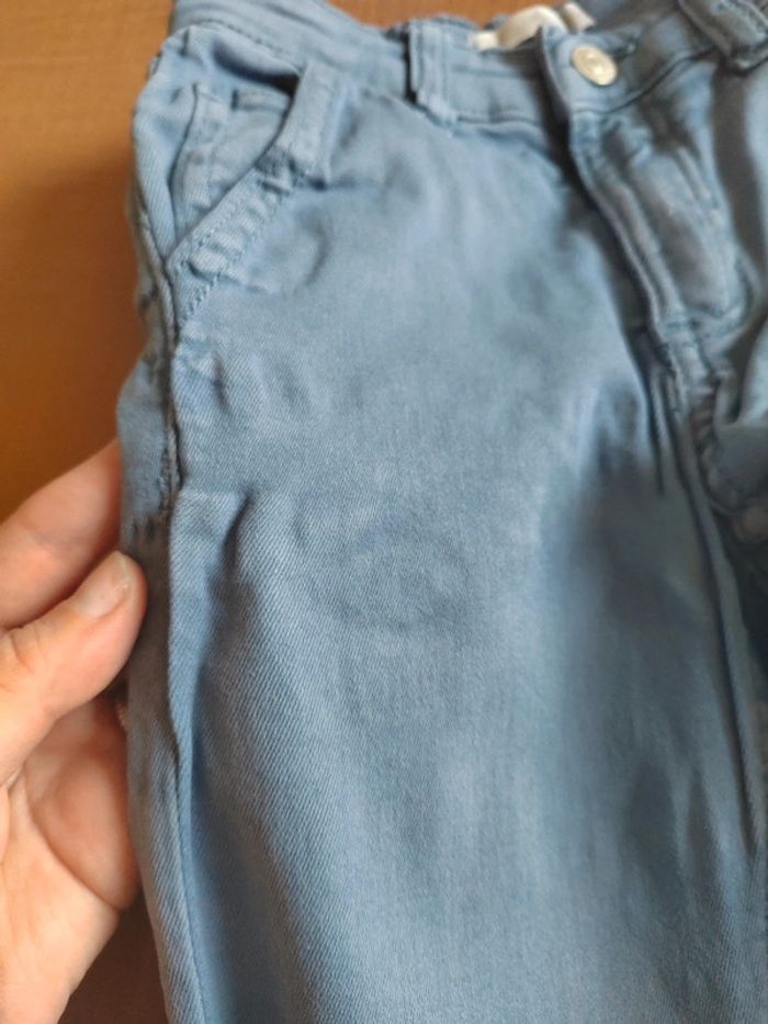 Eu dans une malle #littlecigogne Jean bleu, la vraie couleur se voit sur les photos 2 à 5. Je mets bon état car il n'est pas troué ni tâché mais le tissu a gondolé un peu voir photos. Ça n'empêche pas l'usage normal du pantalon. Ceinture élastique ajustable voir dernière photo, très pratique