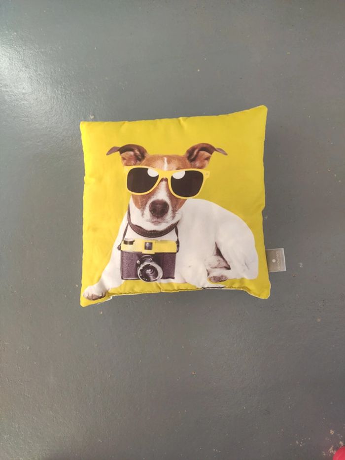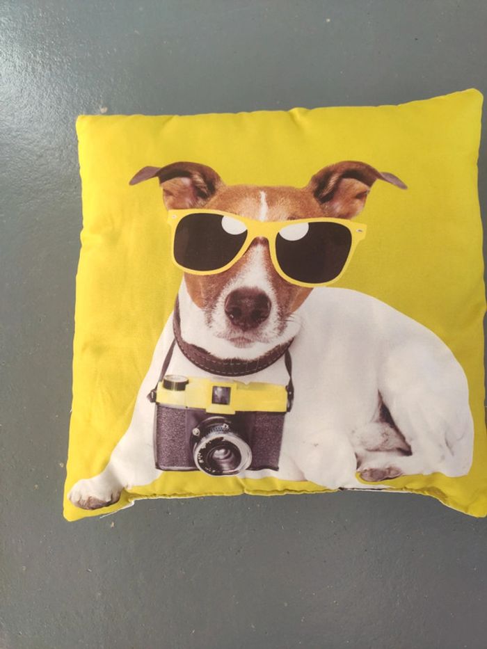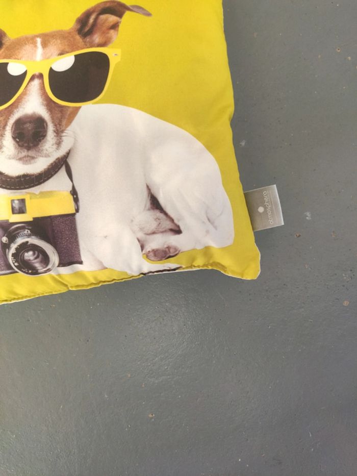 Coussin en très bon état, juste une trace au verso et une mini tâche, voir photo. Photo d'un chien ratier à lunettes de soleil avec appareil photo autour du cou, couleur jaune vert fluo. Dos uni blanc. Dimension 35 x 35 cm. Marque atmosphera, acheté à Zodio