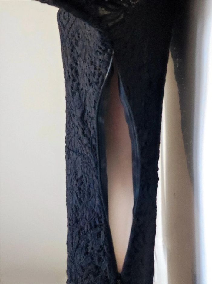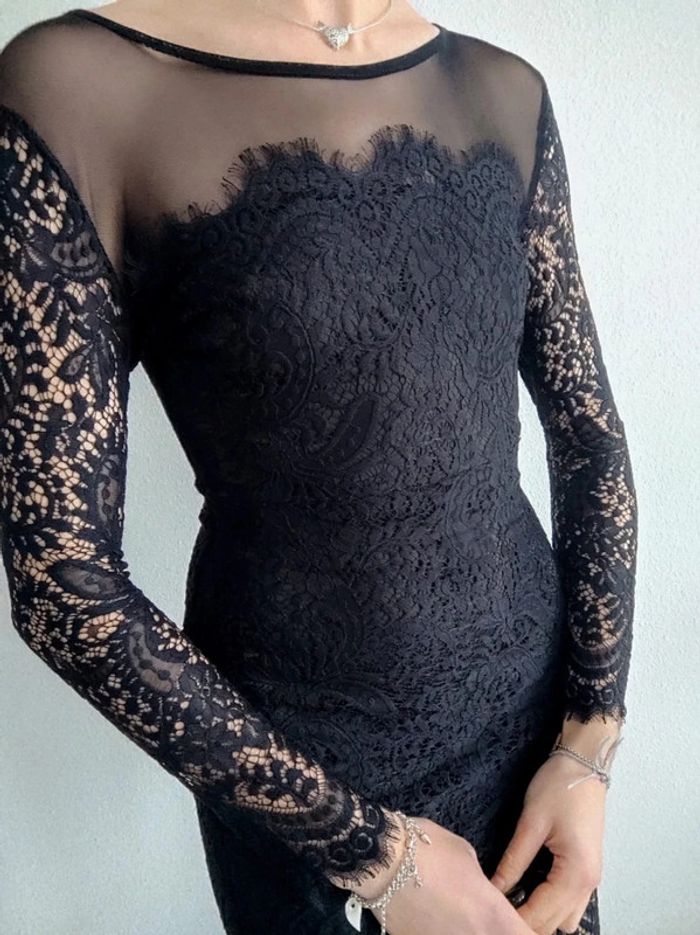 📜 𝗗𝗲́𝘁𝗮𝗶𝗹𝘀 𝘀𝘂𝗽𝗽𝗹𝗲́𝗺𝗲𝗻𝘁𝗮𝗶𝗿𝗲𝘀 : Magnifique robe faire main par une créatice Française. Robe de créateur. Dentelle de très belle qualité. Manches longues. Transparence sur le col. Fermeture éclaire sur le côté. Belle robe soirée, fête cocktail tapis rouge, cérémonie, mariage, réveillon, nouvel an, Noël romantique élégante chic glamour sensuel
