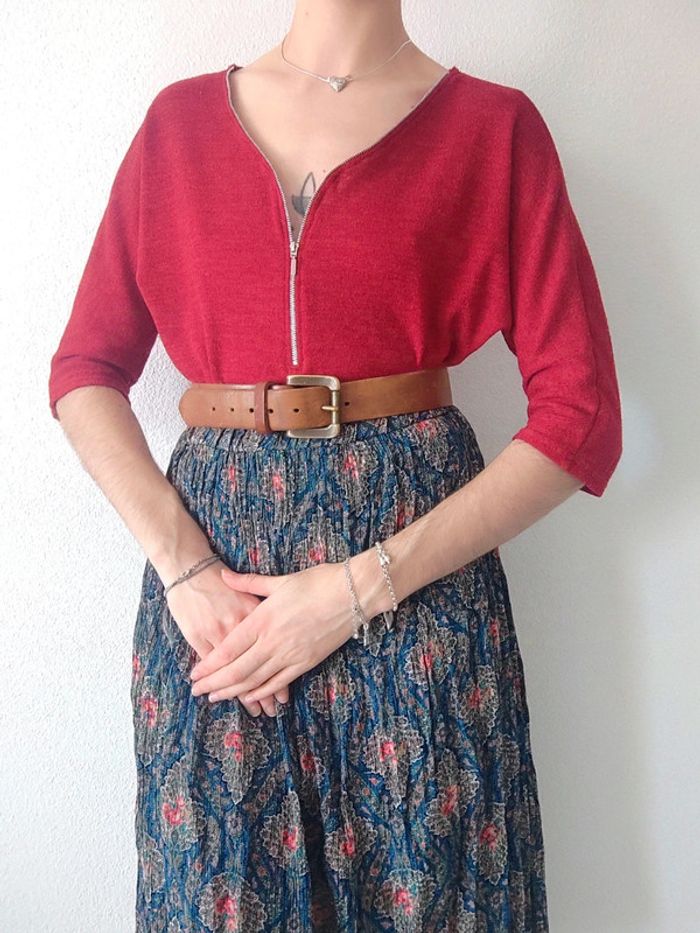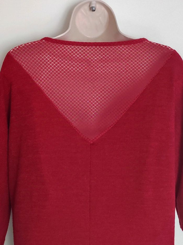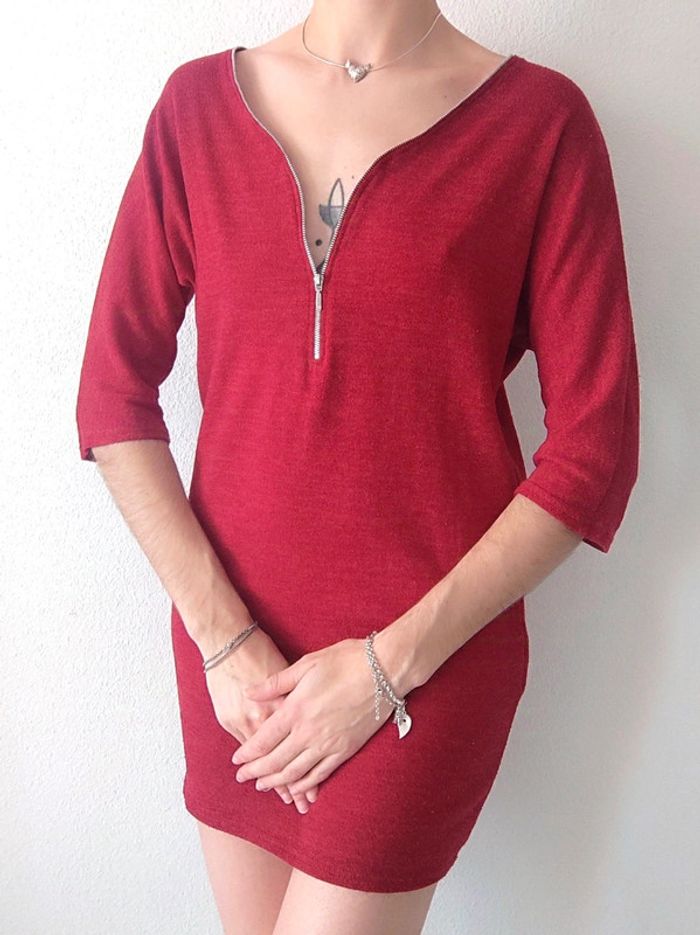 vestido jersey rojo burdeos,manga tres cuartos, escote con cremallera, encaje