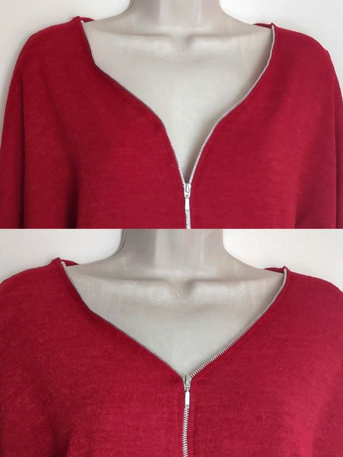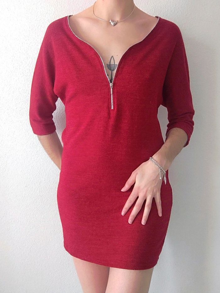 burgunder roude Pullover Kleed, Dräi-Véierel Ärmelen, Zipper Halslinn, Spëtz