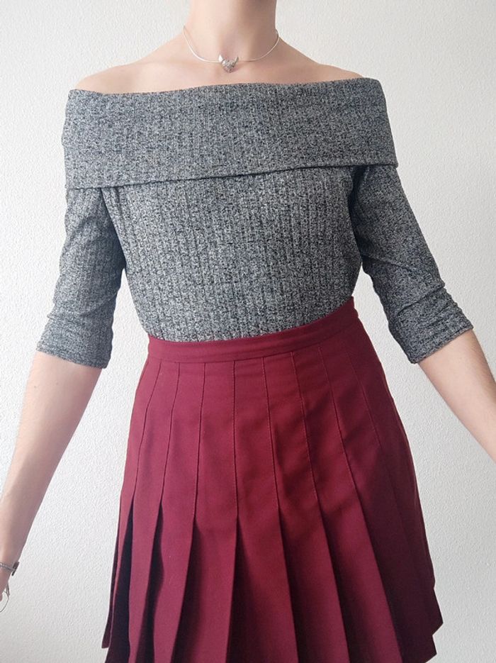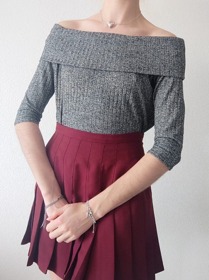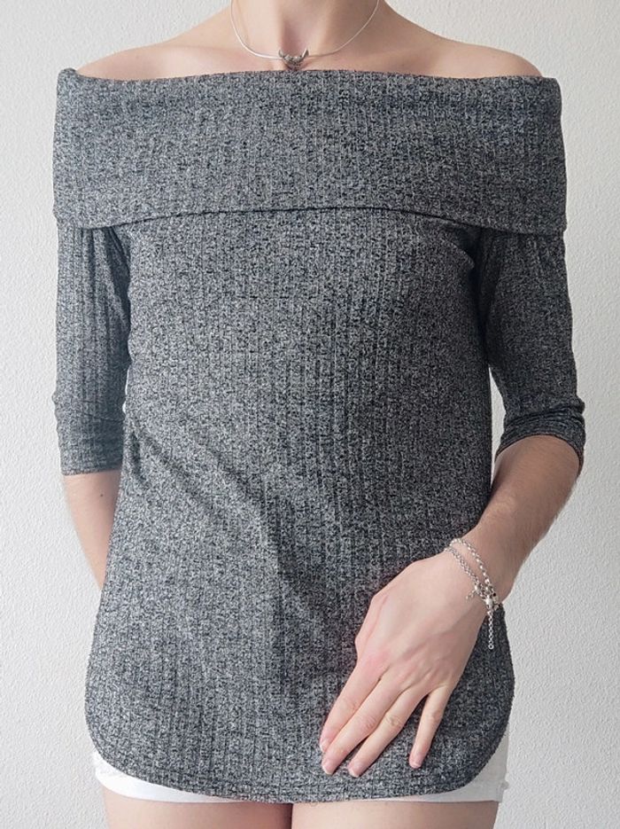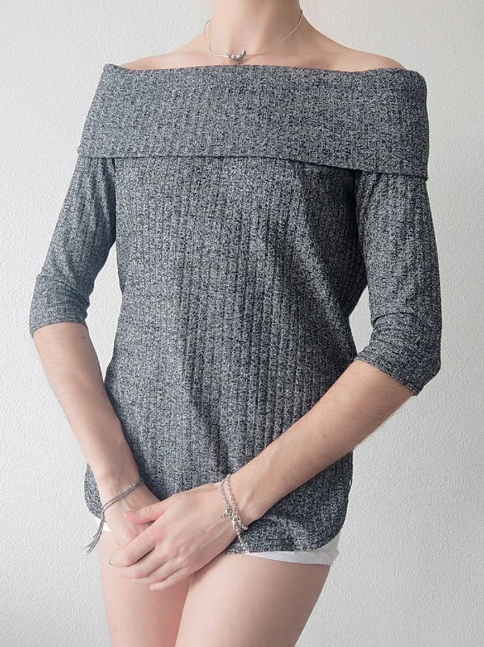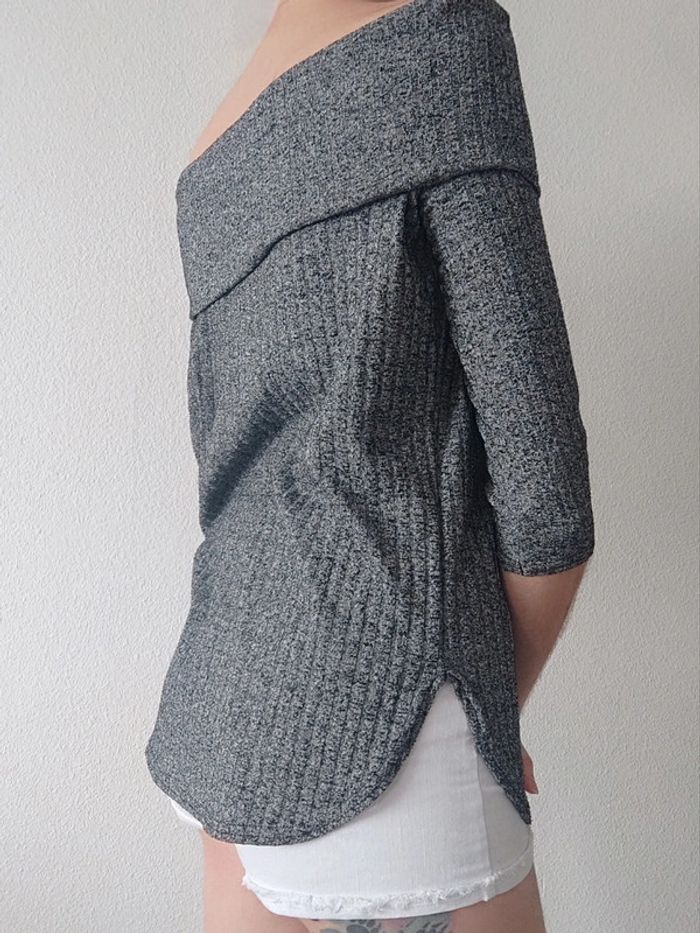 Pull fin côtelé 3/4 épaule dénudé gris chiné - 36/S à 40/L - photo numéro 6